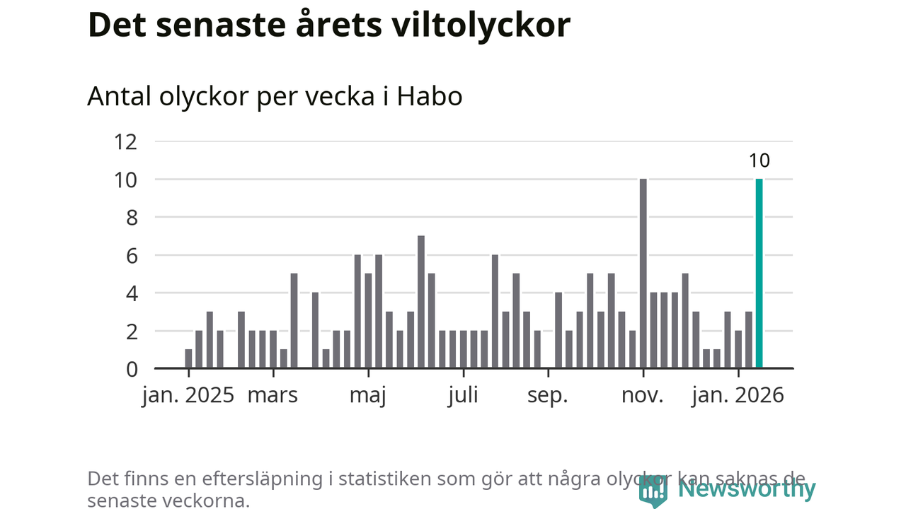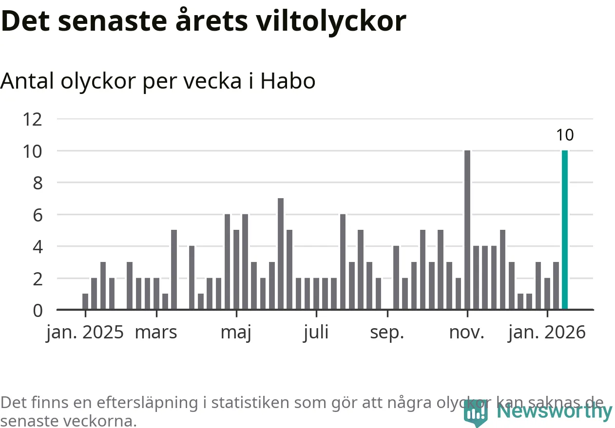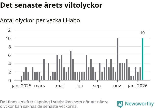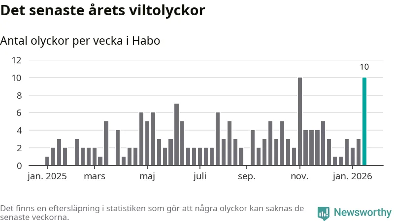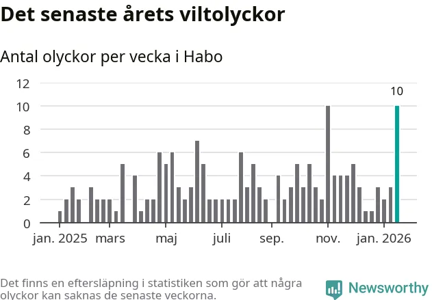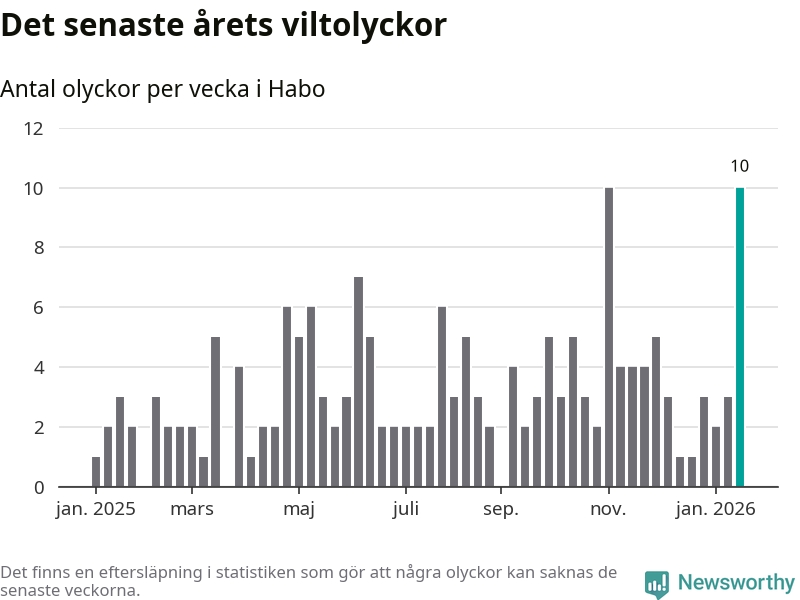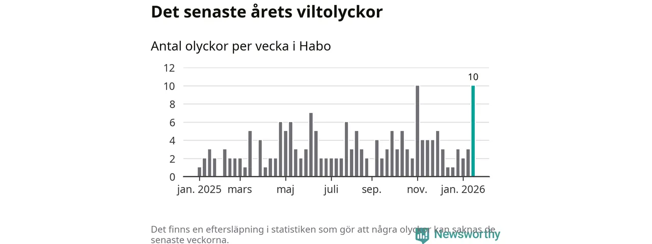 Förra veckan var en av fyra sedan 2015 som det har inträffat så många som tio viltolyckor i Habo kommun (tidigare har det skett i oktober 2016, januari 2024 och november 2025).