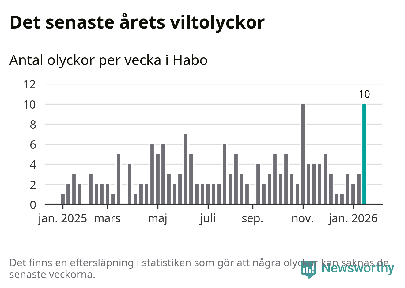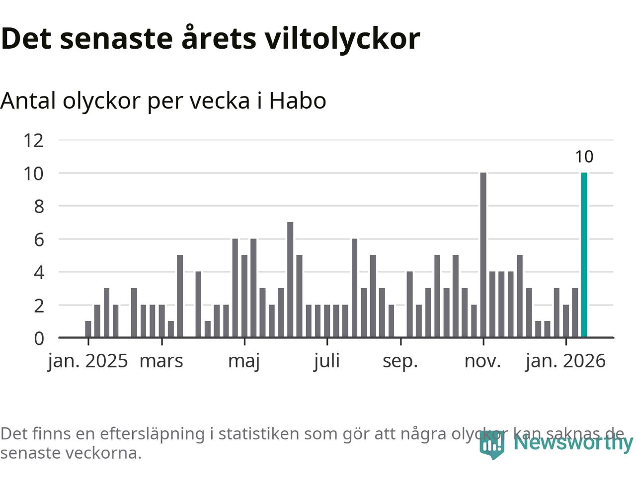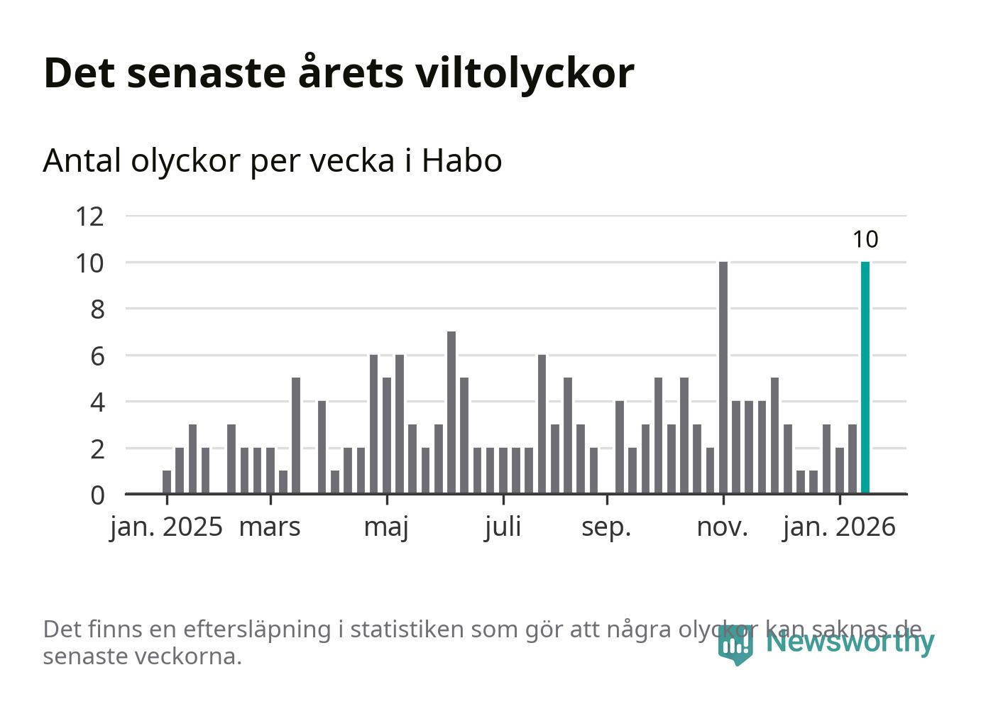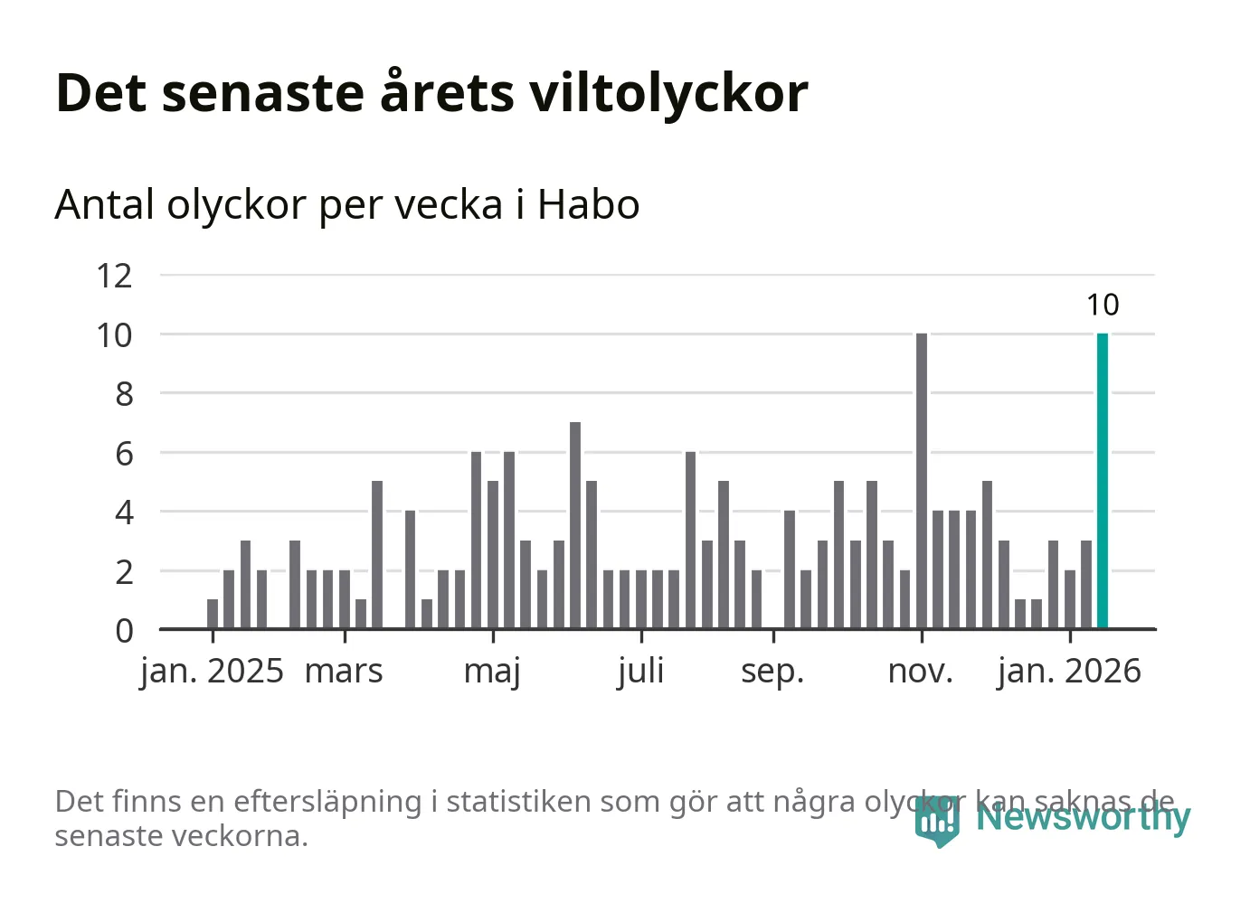 Förra veckan var en av fyra sedan 2015 som det har inträffat så många som tio viltolyckor i Habo kommun (tidigare har det skett i oktober 2016, januari 2024 och november 2025).