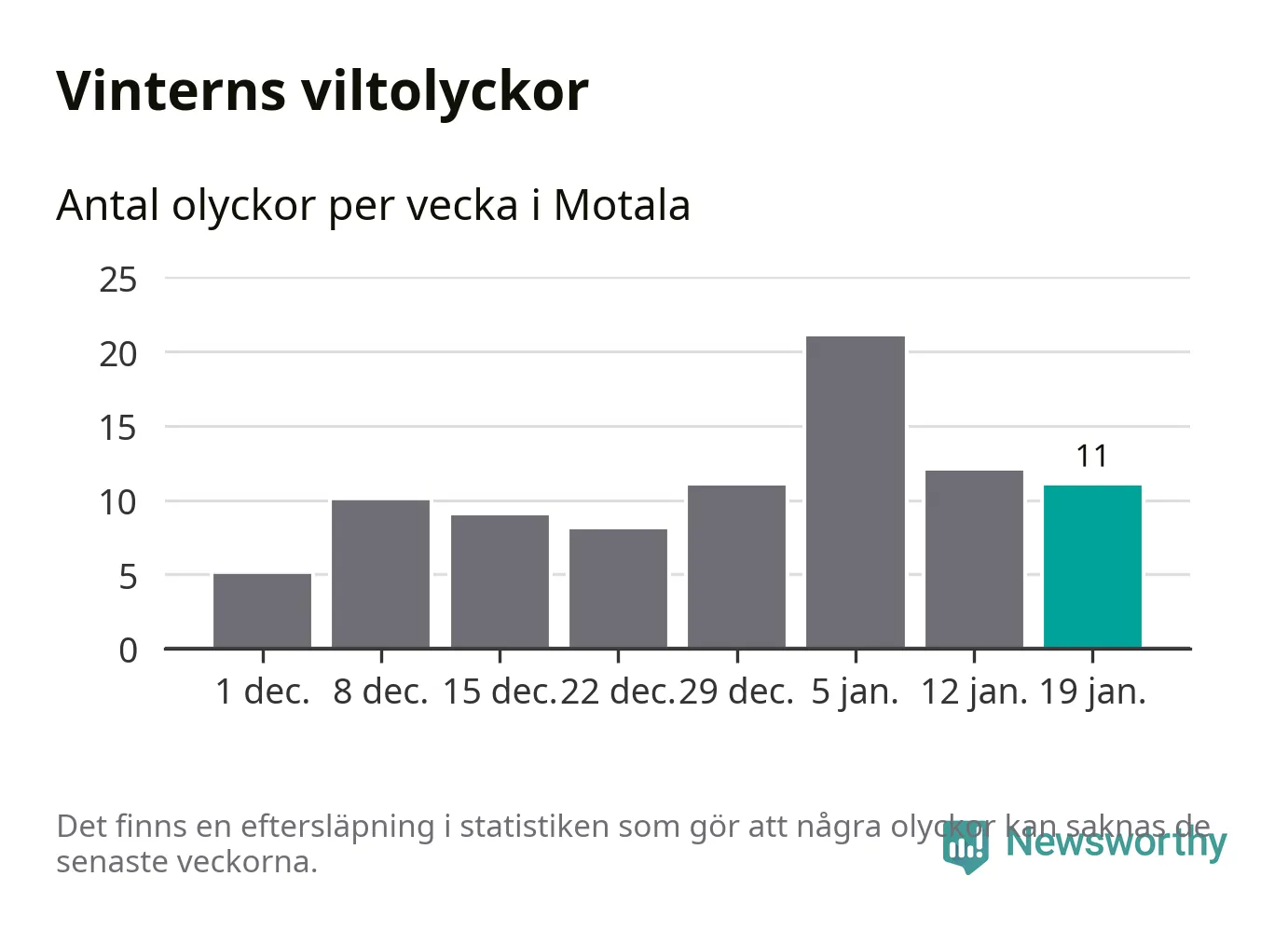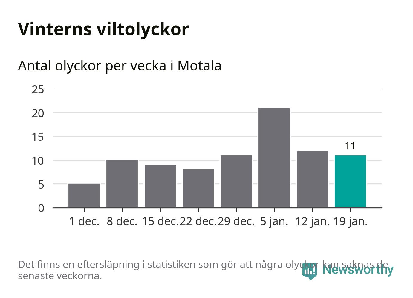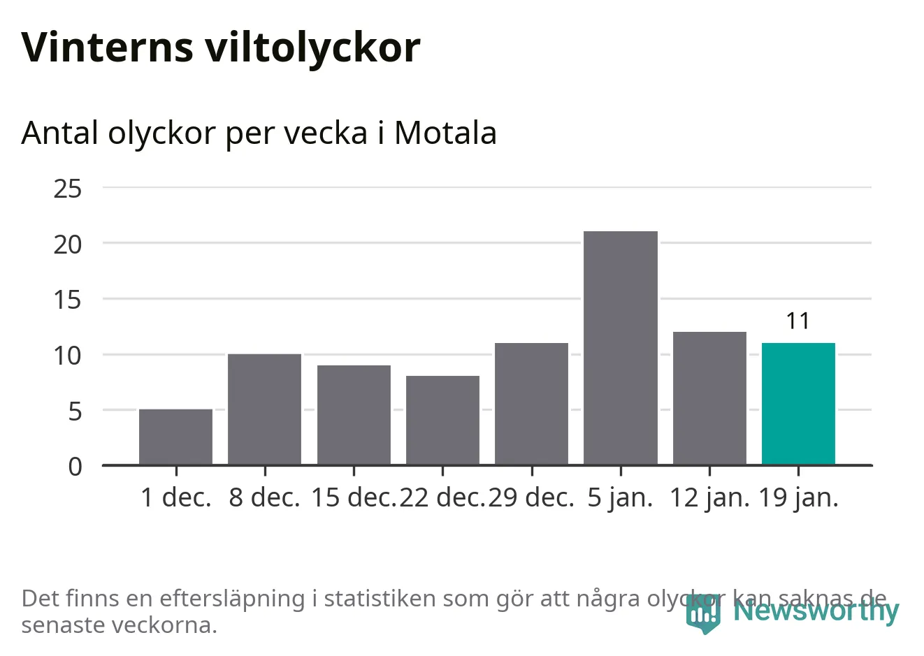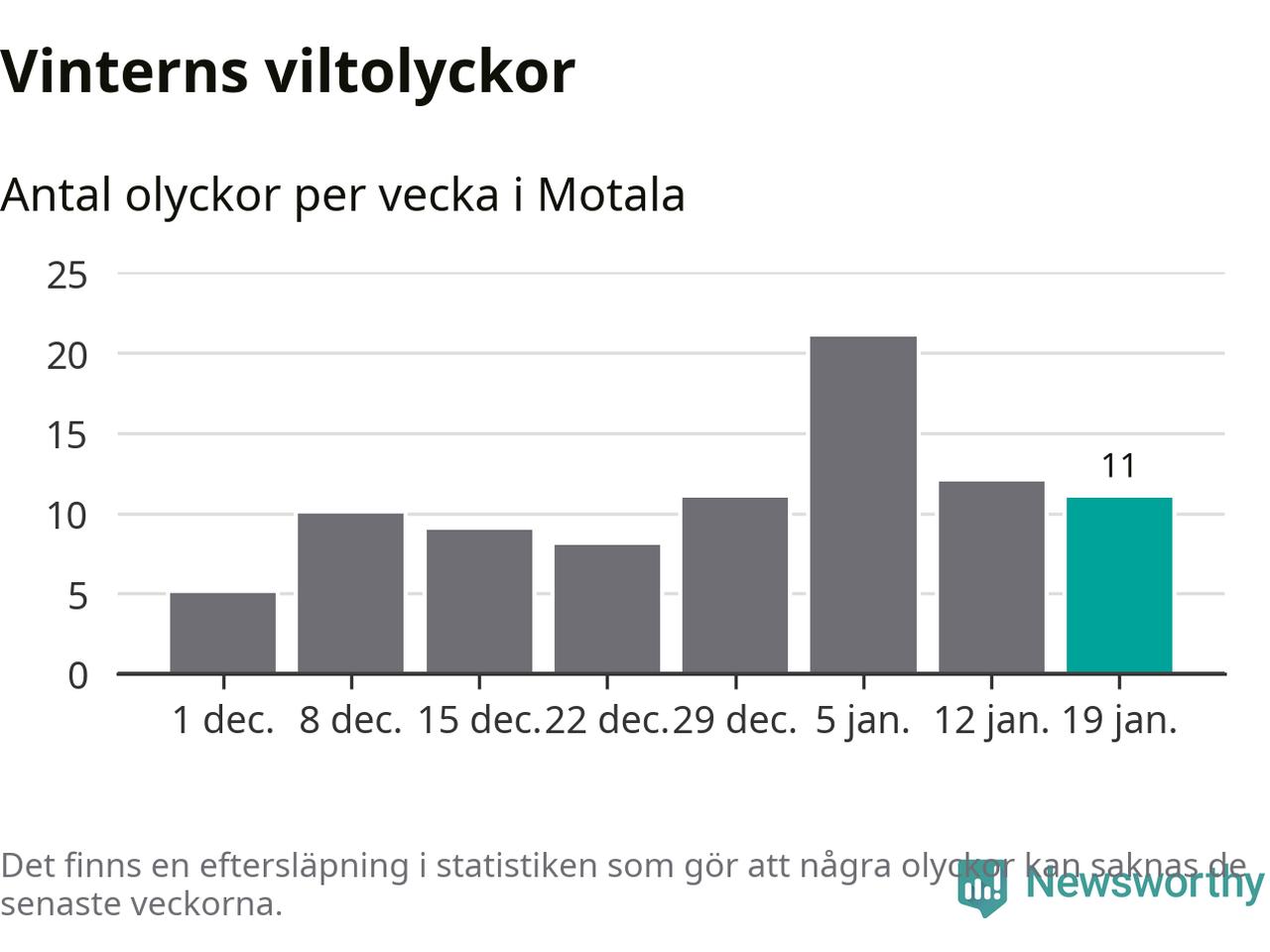 Under vecka 4 rapporterades elva viltolyckor in i Motala kommun. Därmed har det inträffat fler viltolyckor hittills den här vintern, än det brukar göra en hel genomsnittlig vinter.