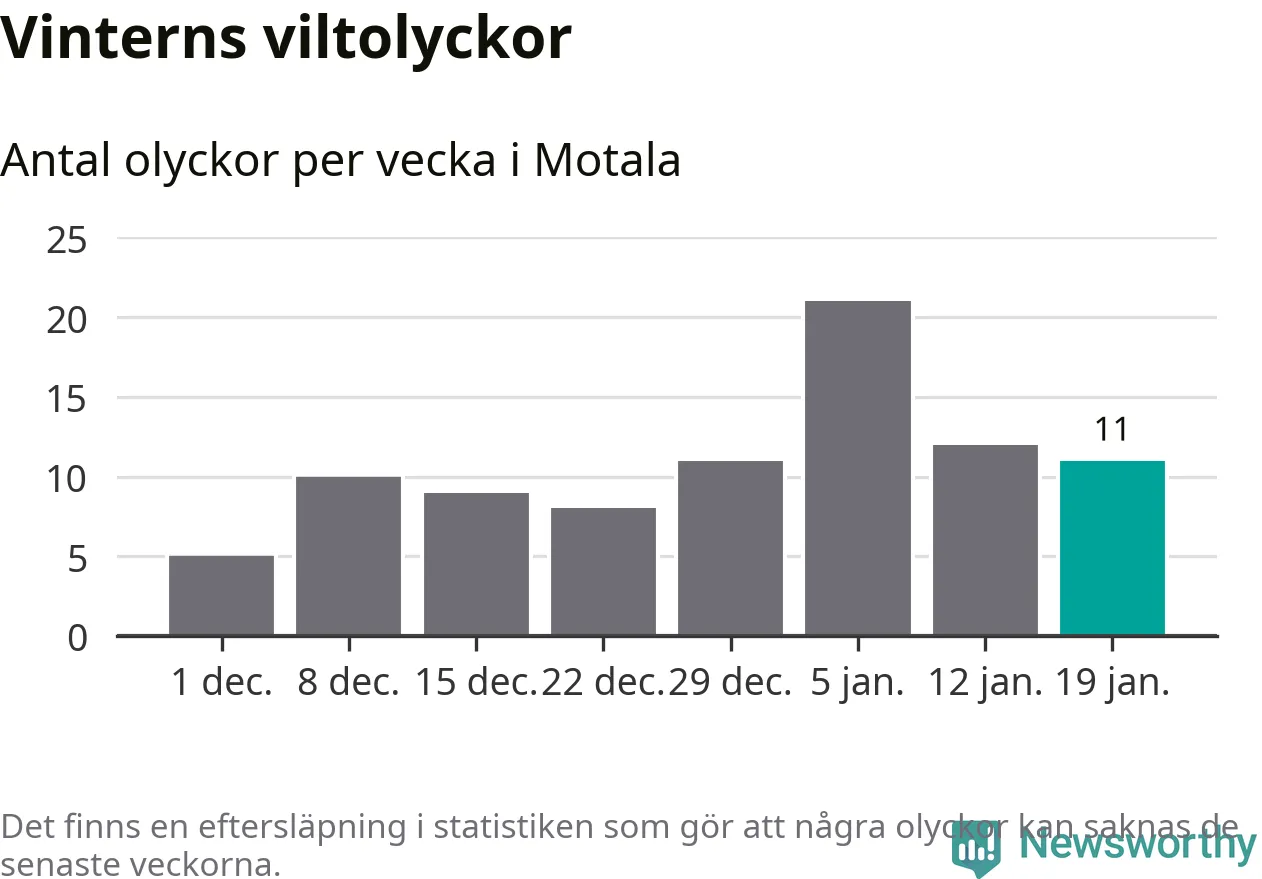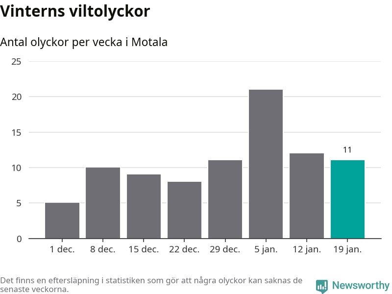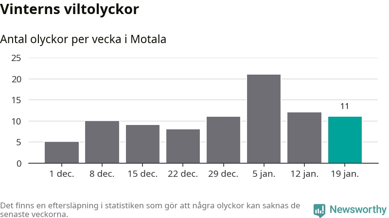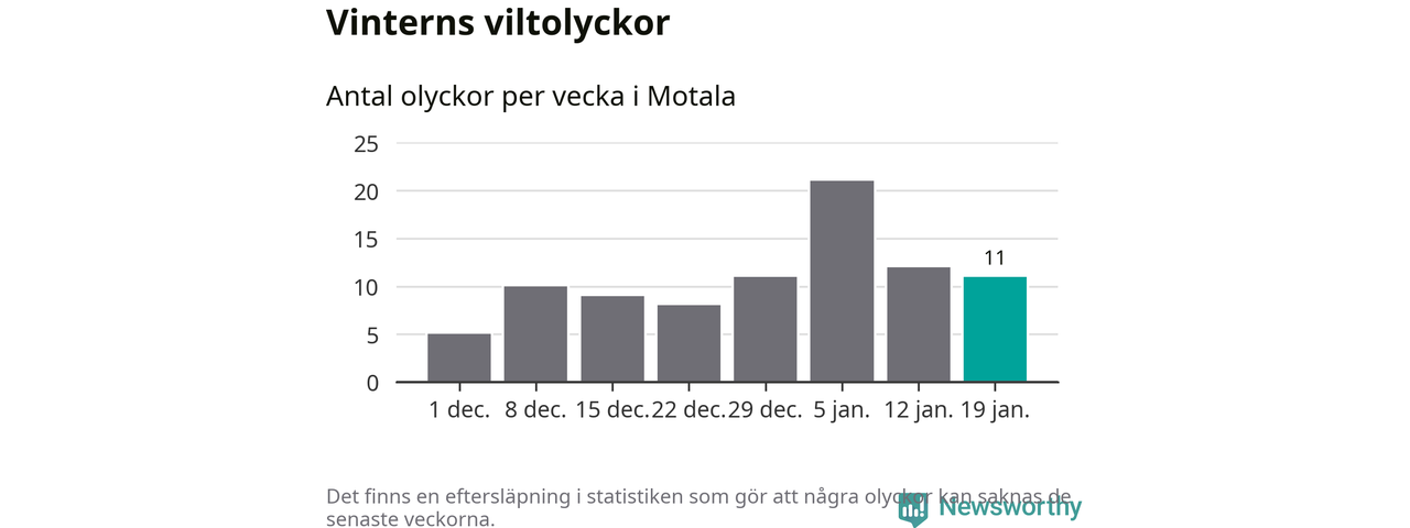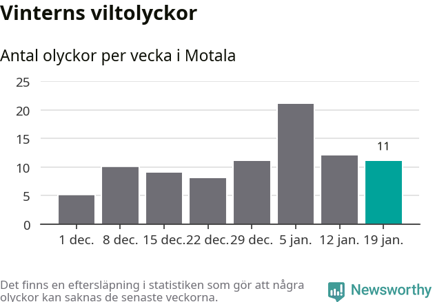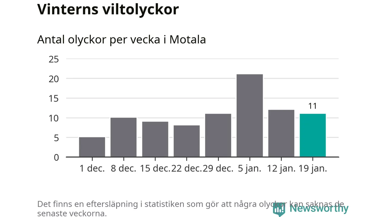 Under vecka 4 rapporterades elva viltolyckor in i Motala kommun. Därmed har det inträffat fler viltolyckor hittills den här vintern, än det brukar göra en hel genomsnittlig vinter.