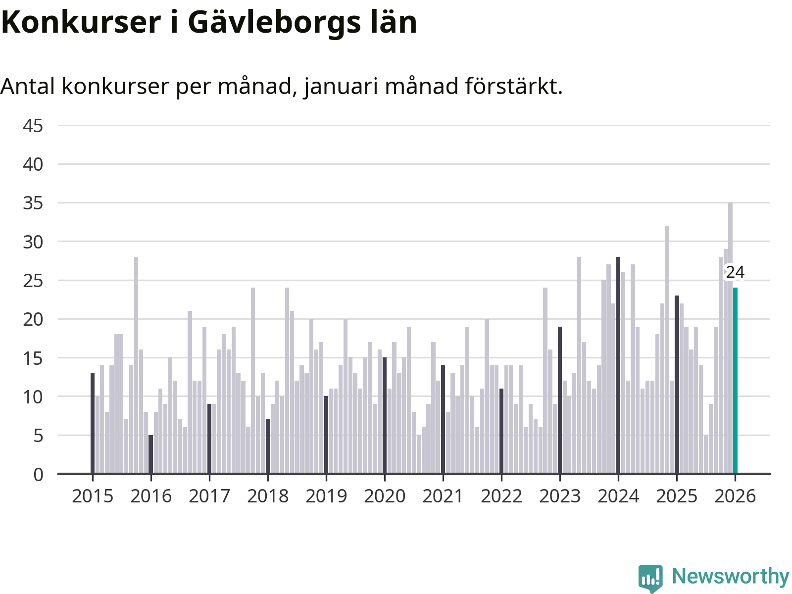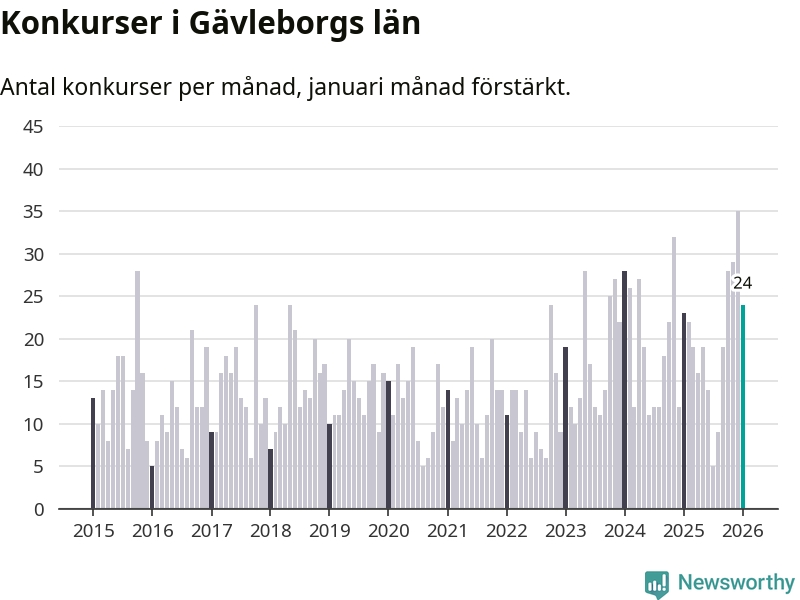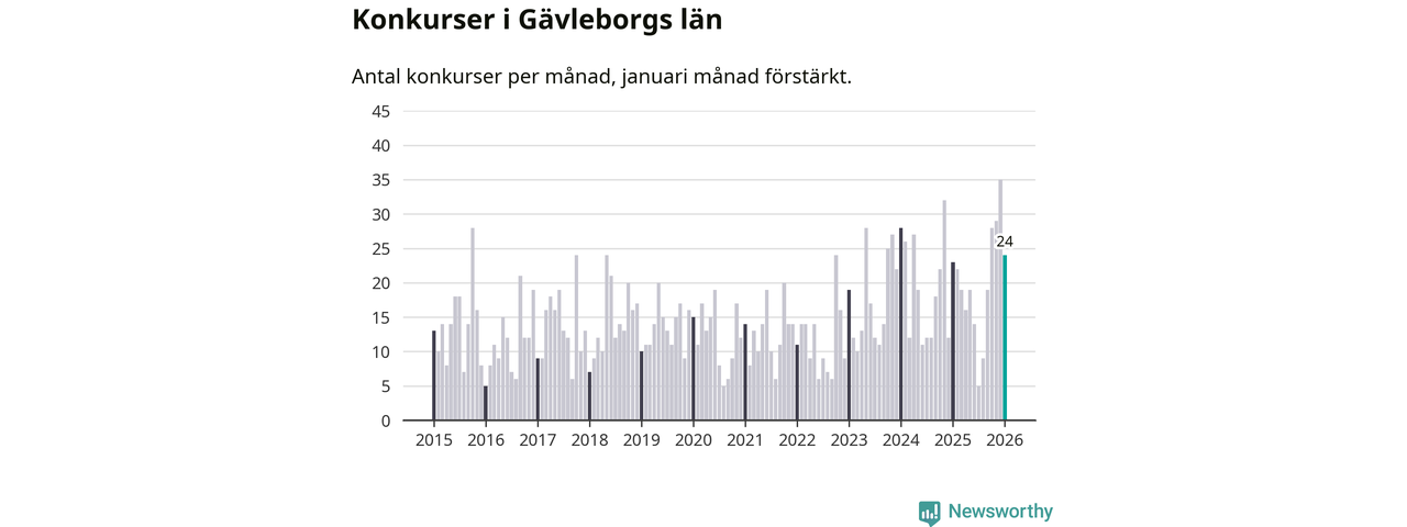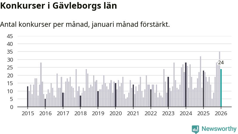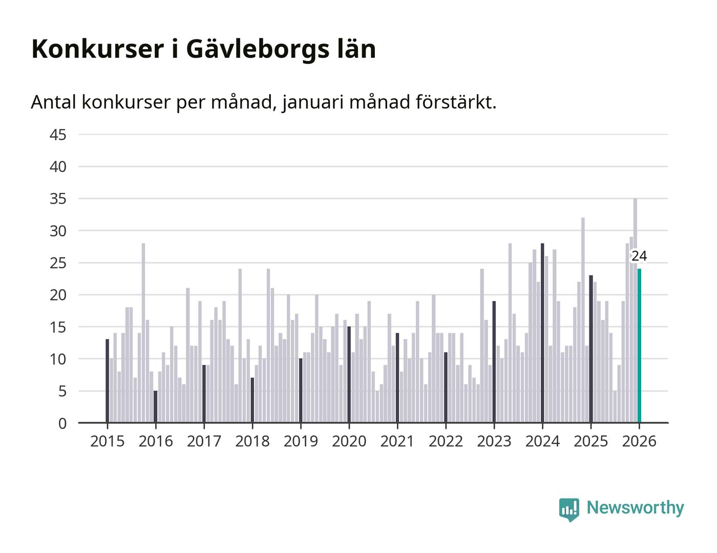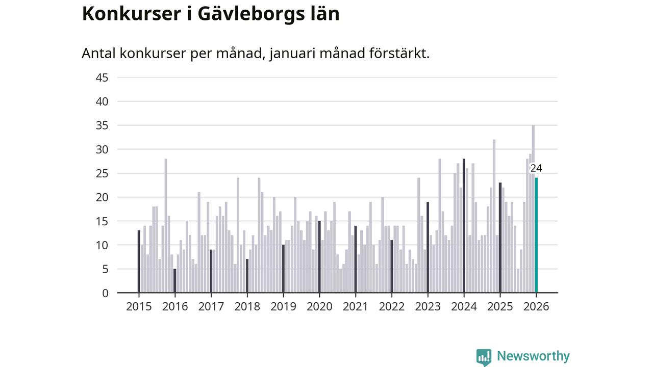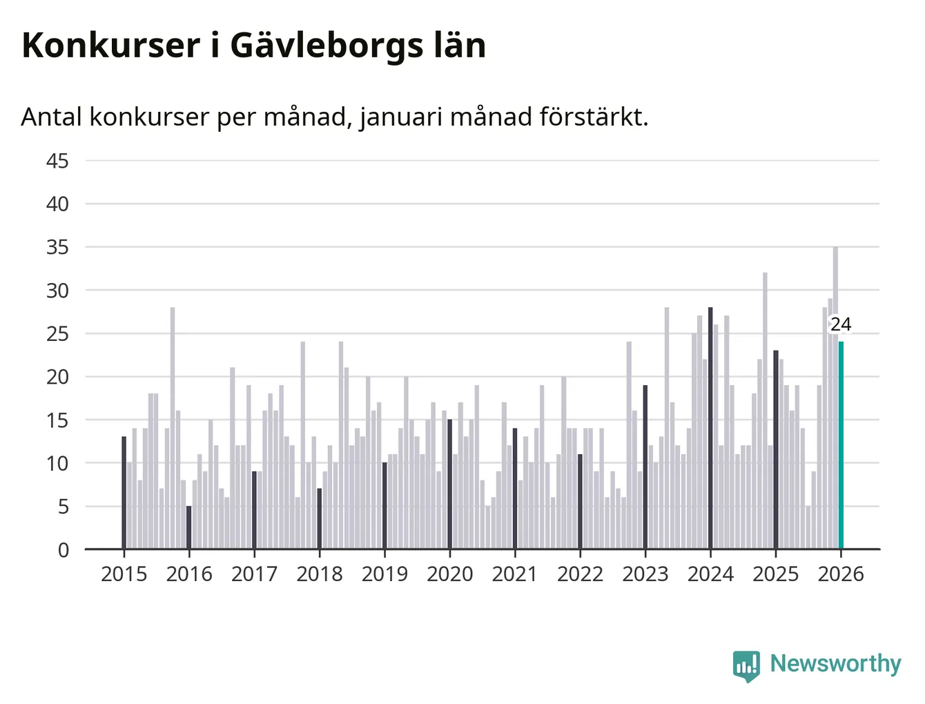 Under januari månad gick 24 bolag med säte i Gävleborg i konkurs. Det är fler än normalt för den här tiden på året sett till de senaste elva åren. I fjol noterades 23 konkurser under januari.