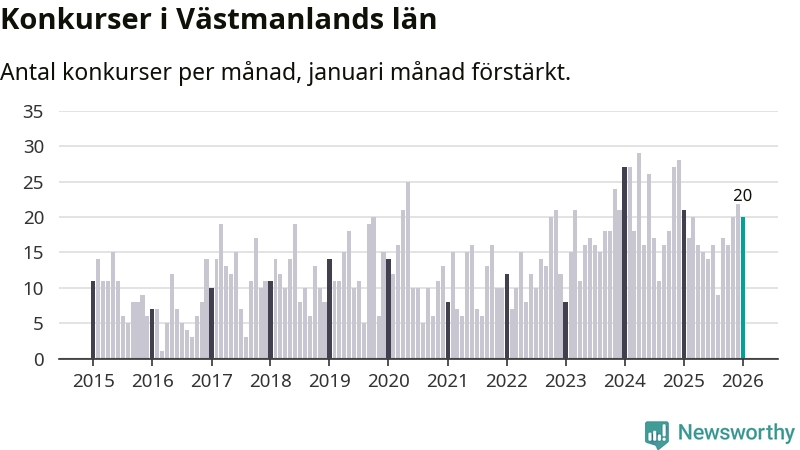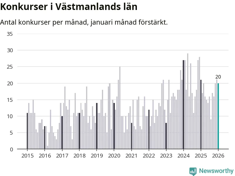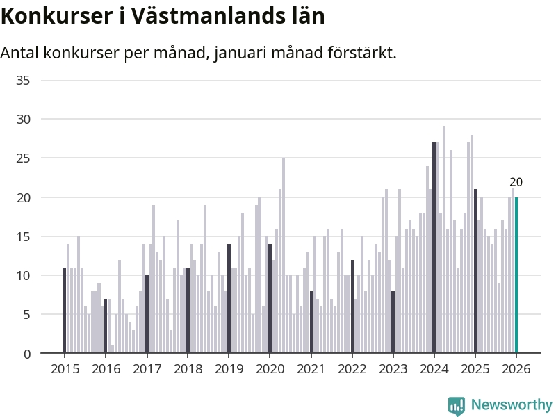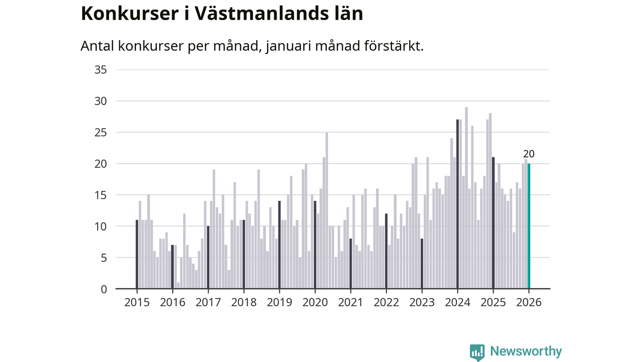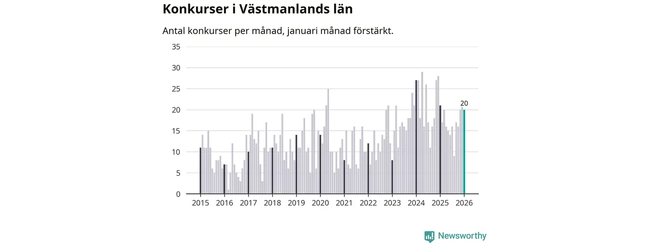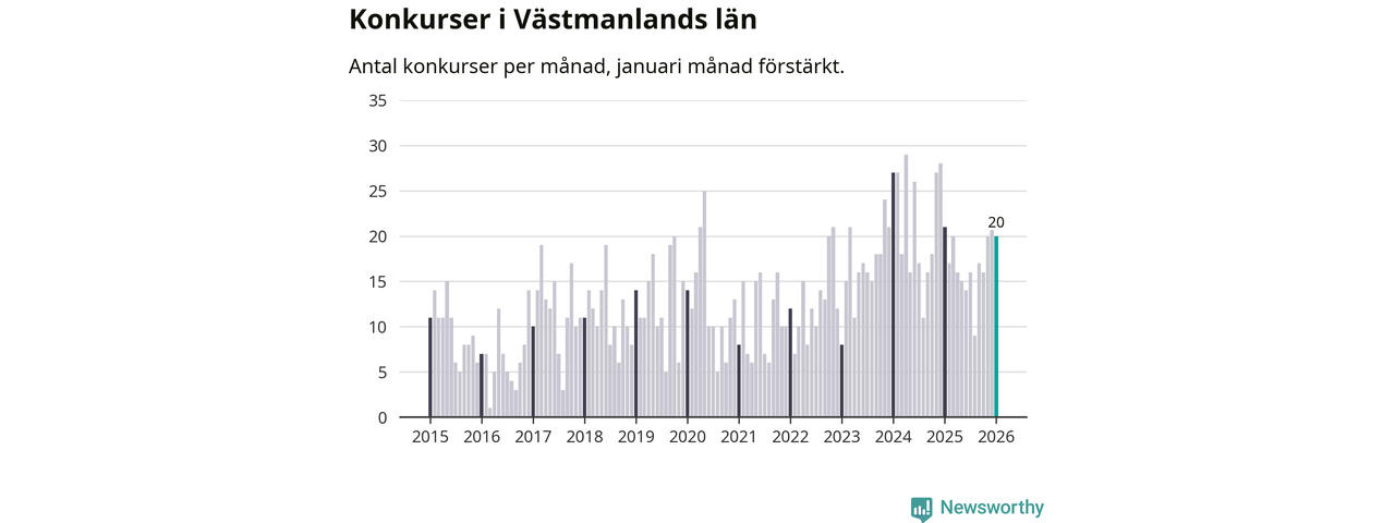 Under januari månad gick 20 bolag med säte i Västmanland i konkurs. Det är fler än normalt för den här tiden på året sett till de senaste elva åren, men samtidigt något färre än under januari månad i fjol (21 stycken då).