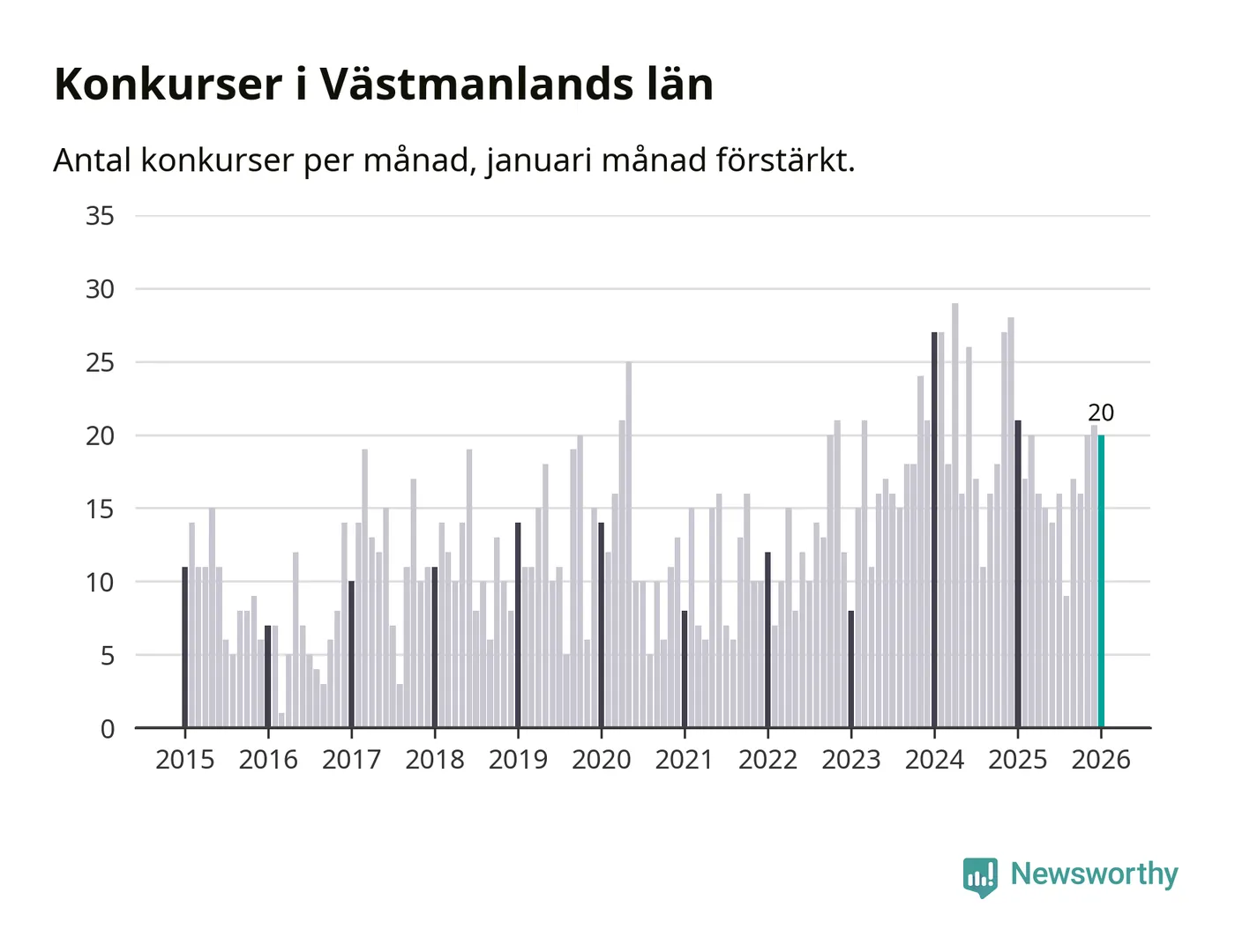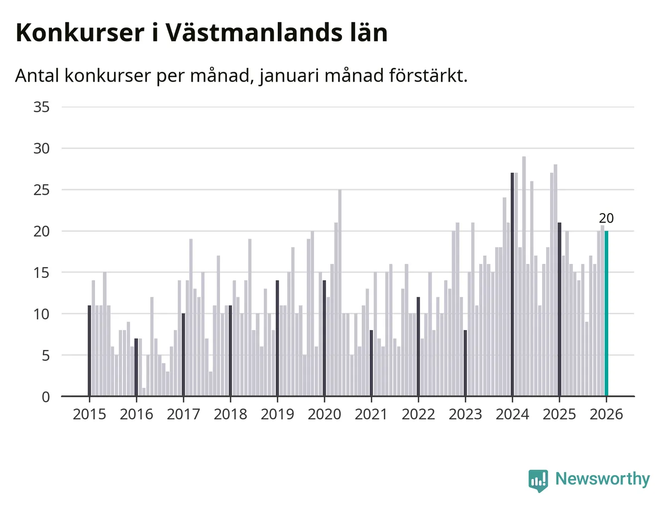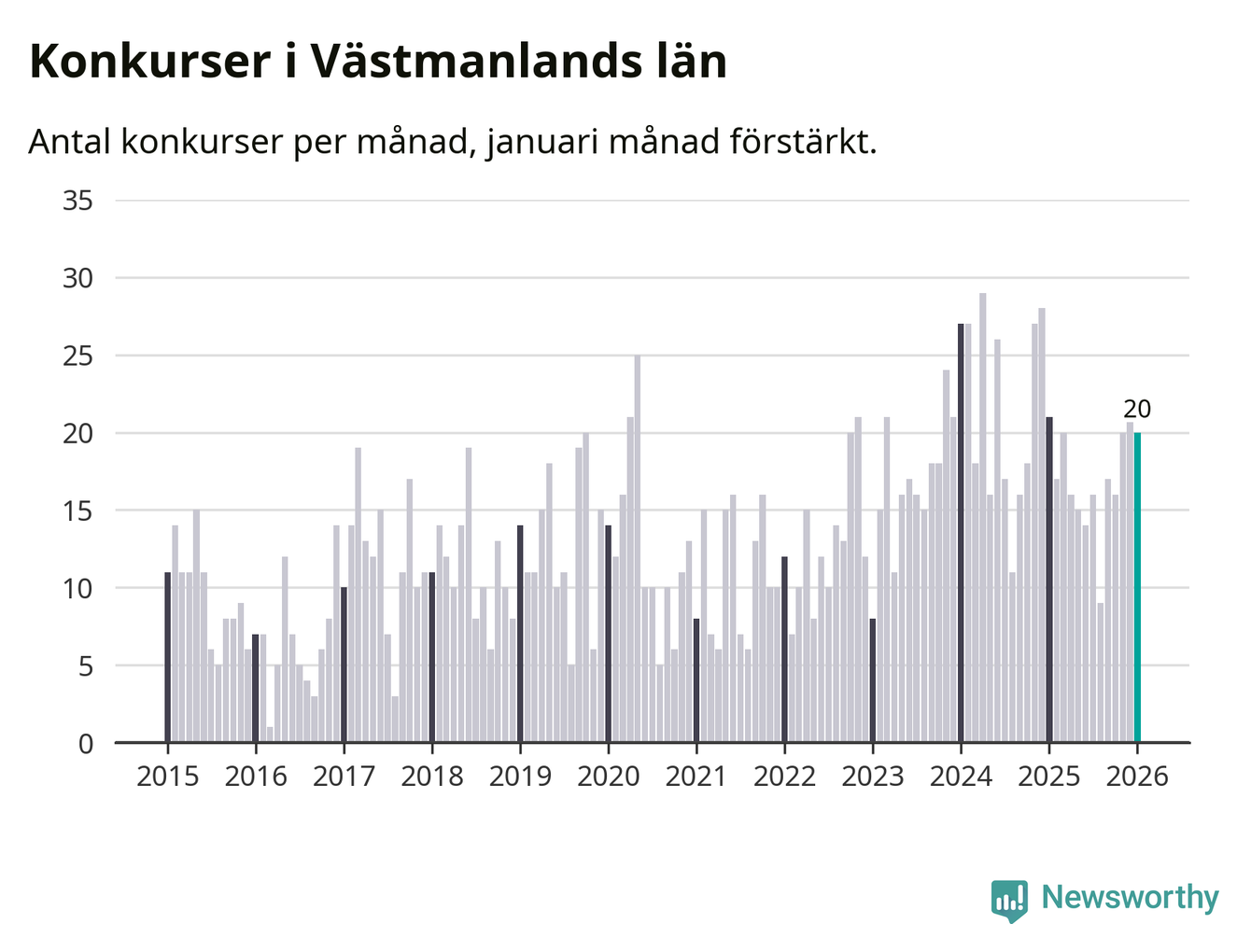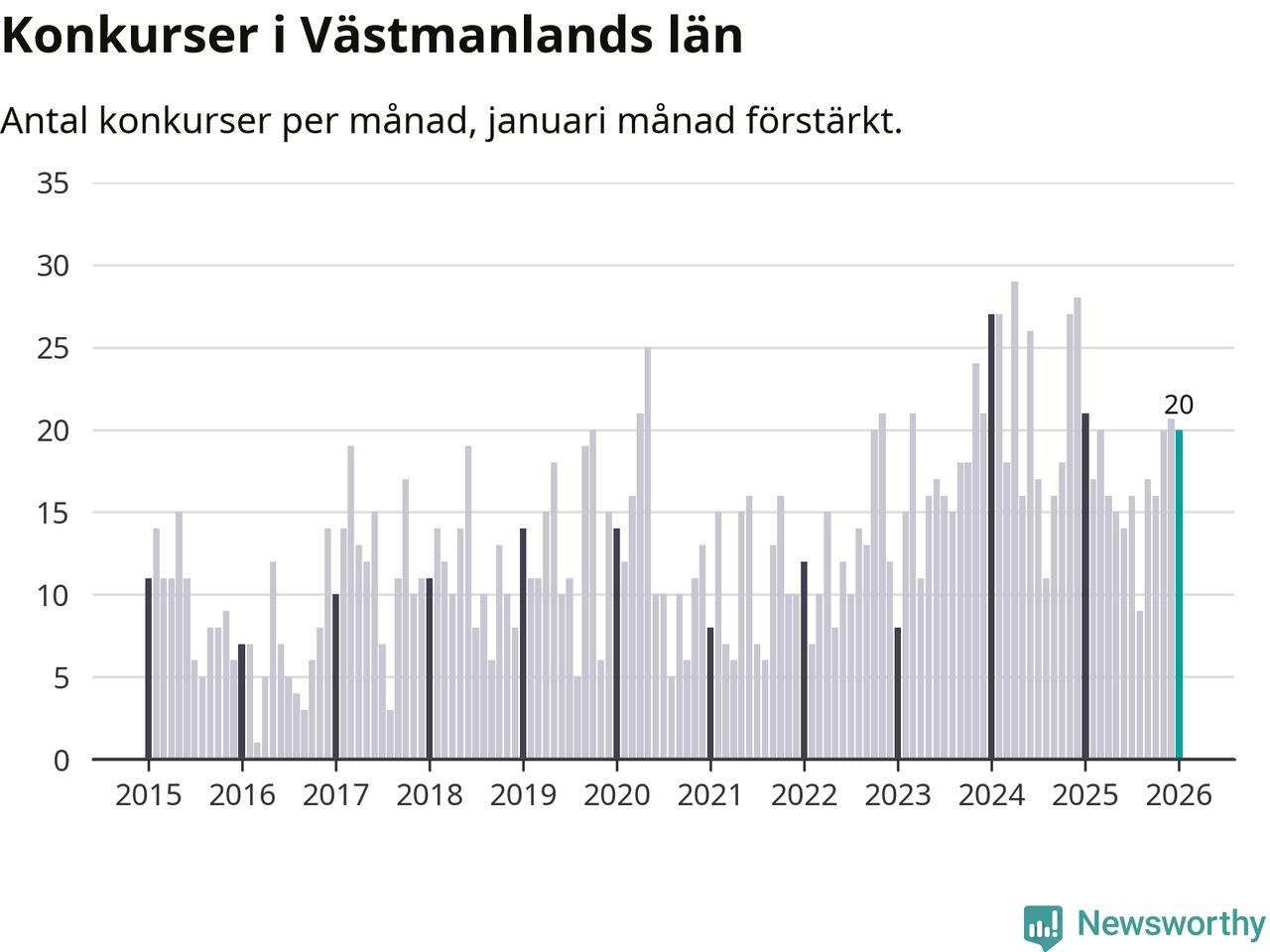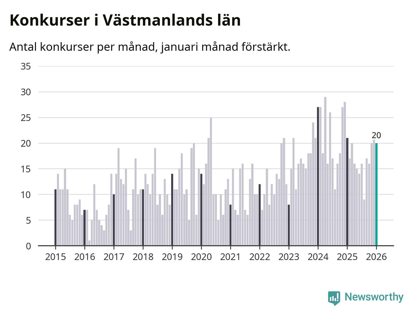 Graf: Antal konkurser per månad i Västmanlands län