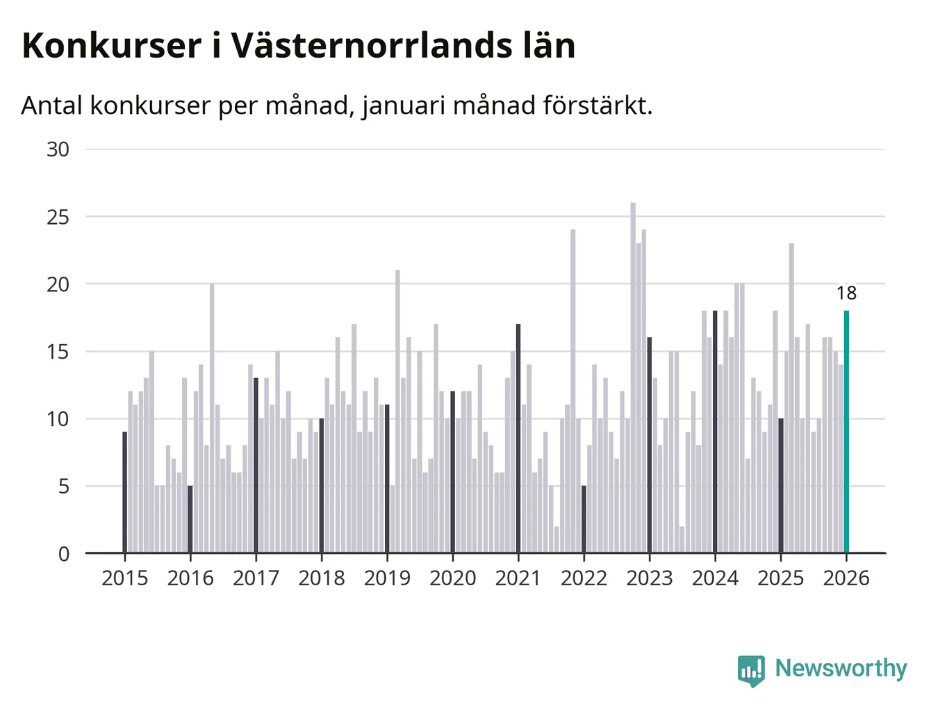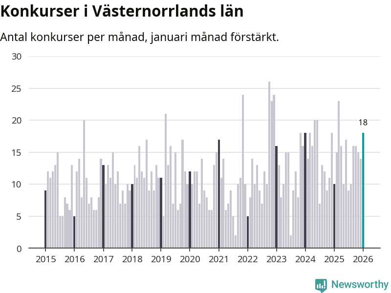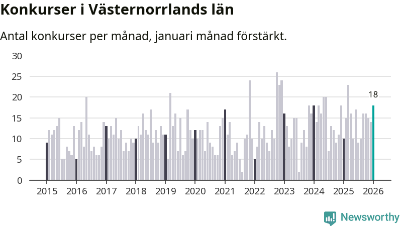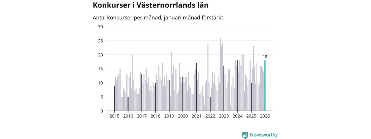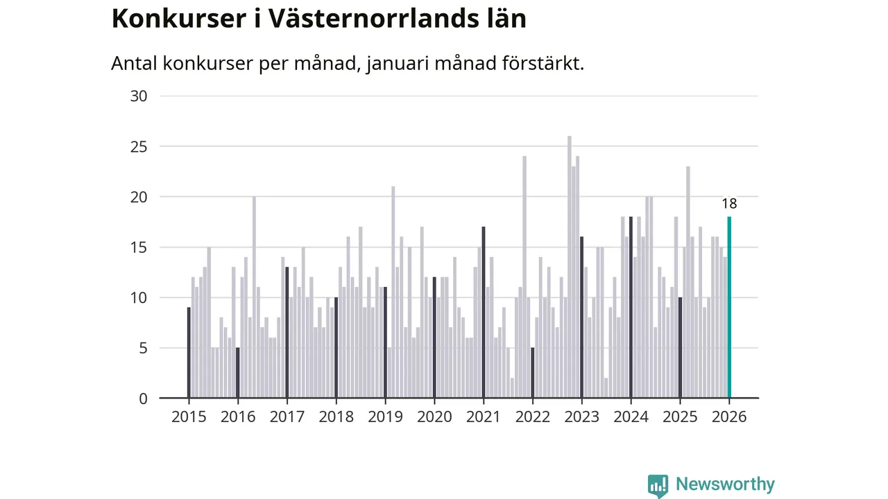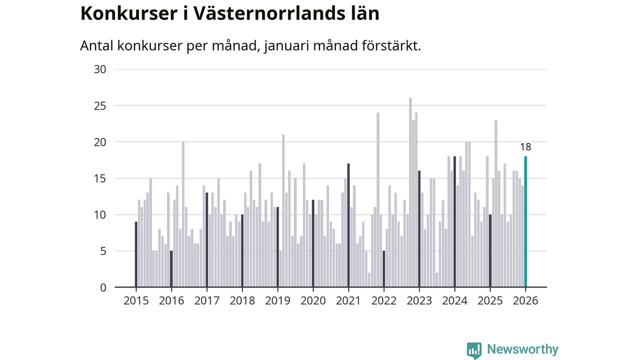 Under januari månad gick 18 bolag med säte i Västernorrland i konkurs. Det är fler än normalt för den här tiden på året sett till de senaste elva åren. I fjol noterades tio konkurser under januari.