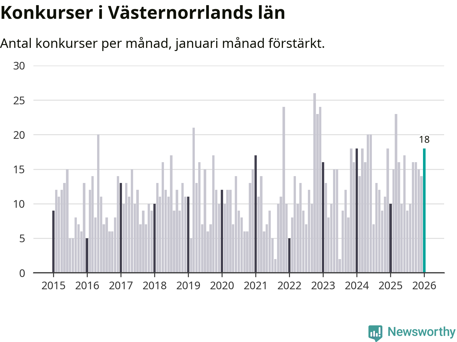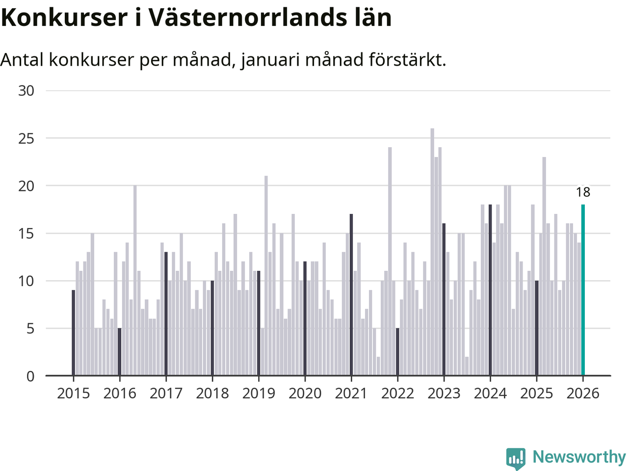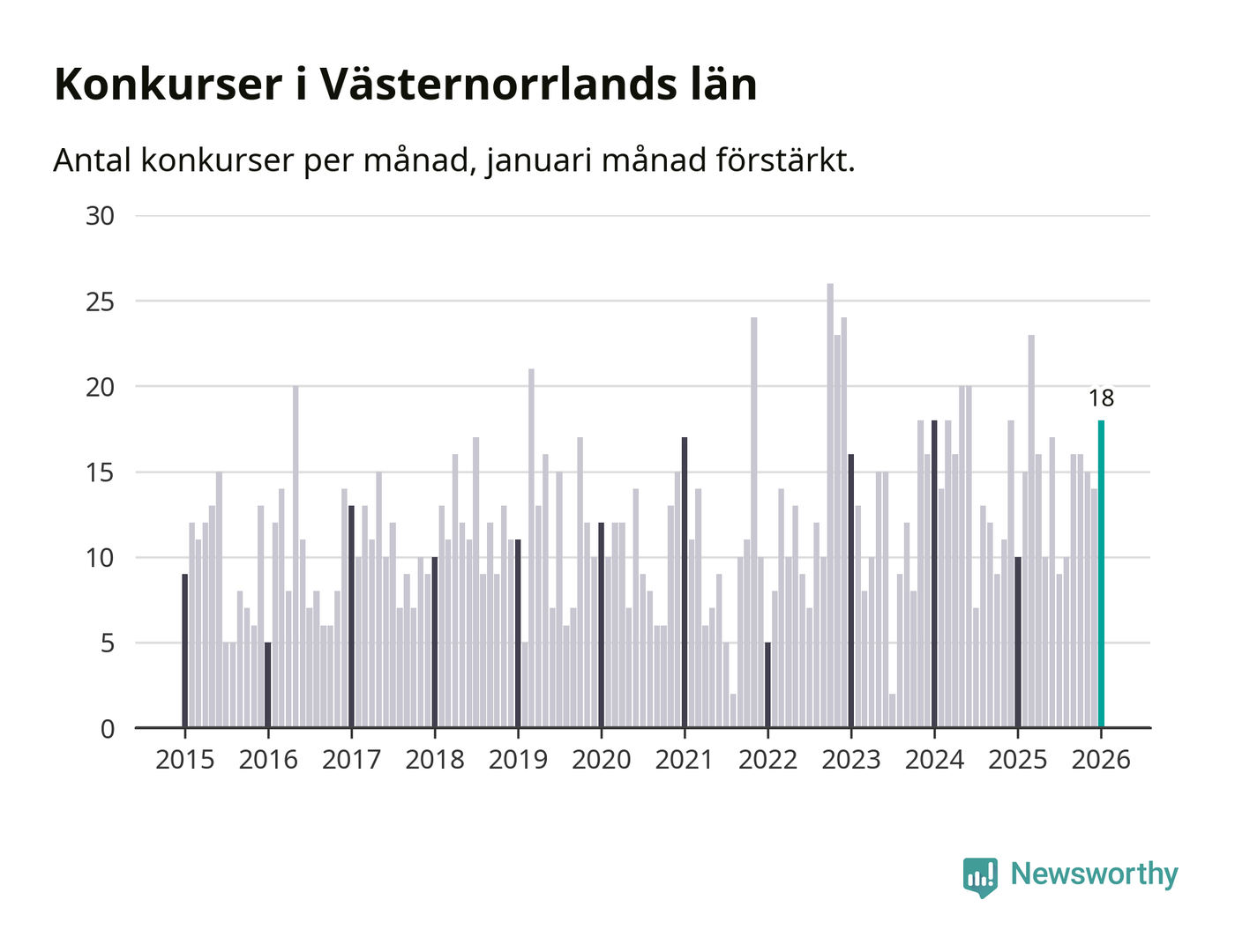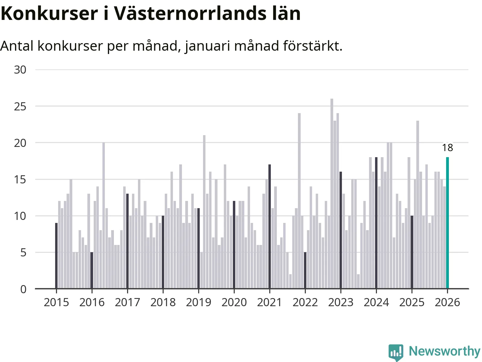 Under januari månad gick 18 bolag med säte i Västernorrland i konkurs. Det är fler än normalt för den här tiden på året sett till de senaste elva åren. I fjol noterades tio konkurser under januari.