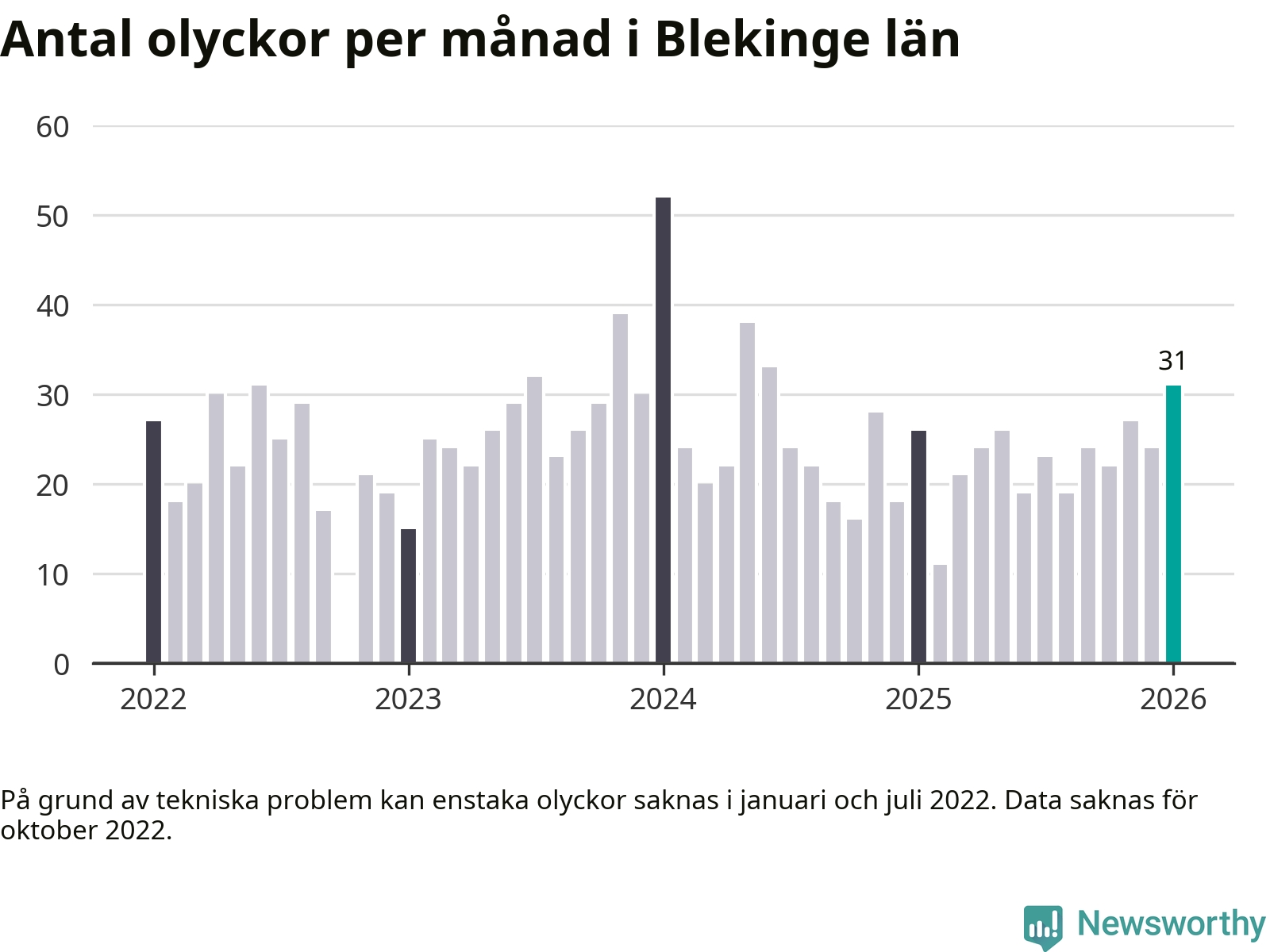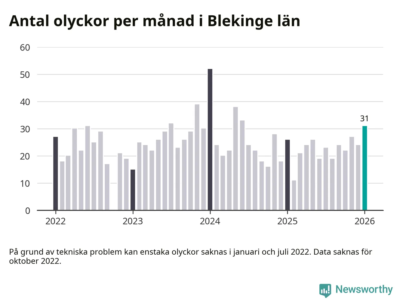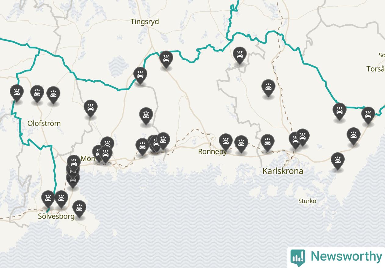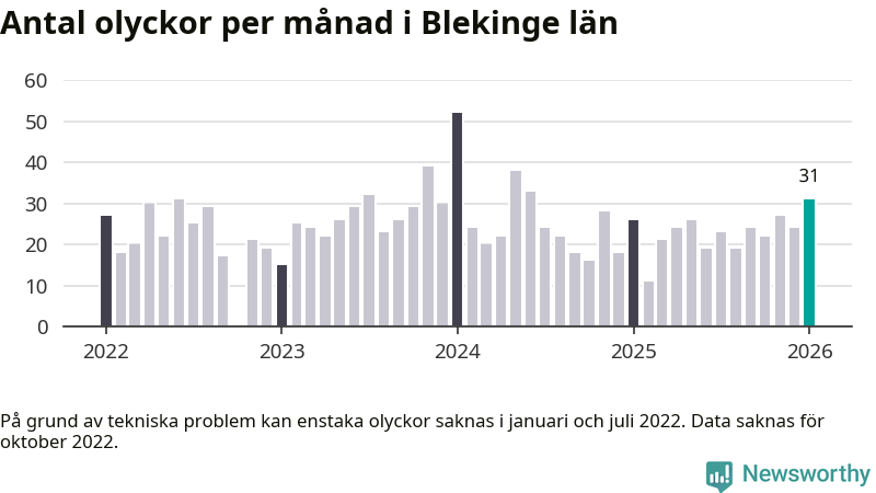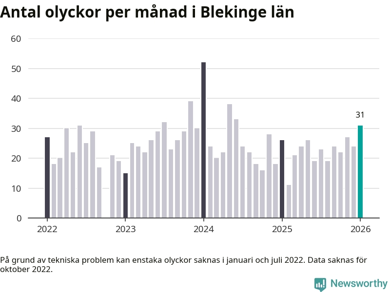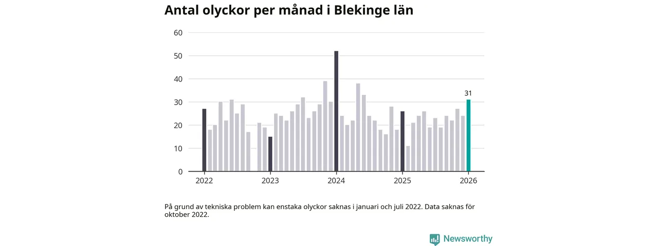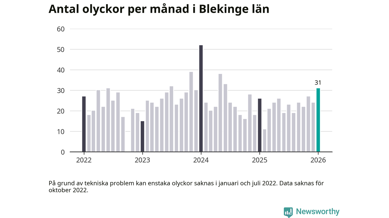 I Blekinge län var trafikolyckorna fler än under samma månad i fjol: 31 olyckor längs de stora vägarna i länet. Det visar data från Trafikverket som Newsworthy sammanställt.