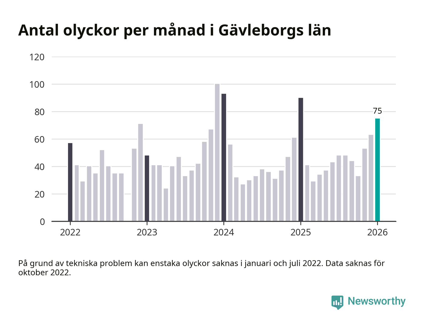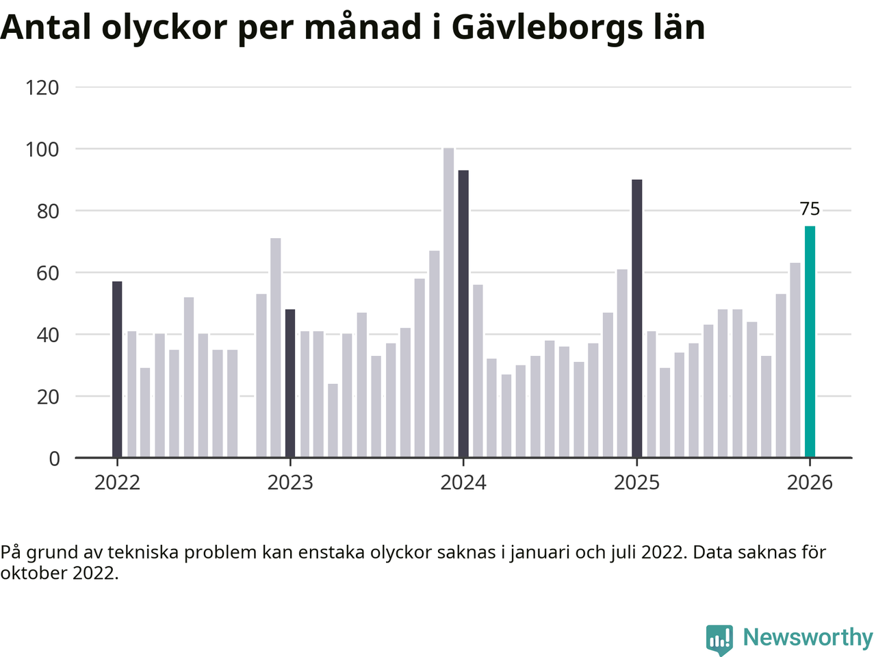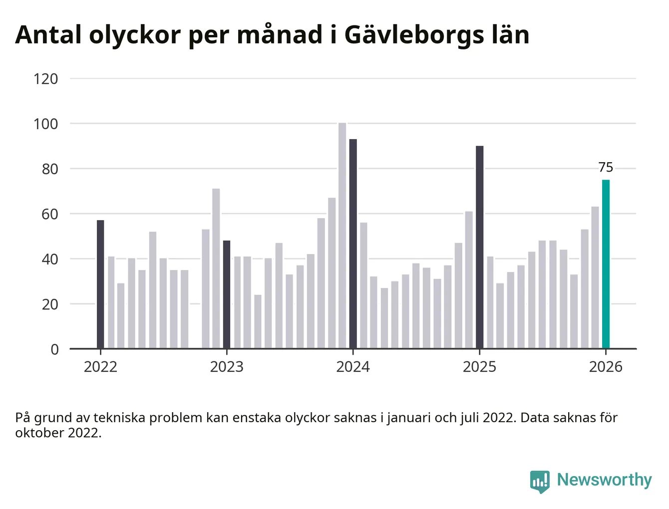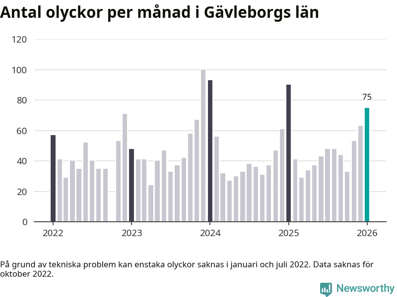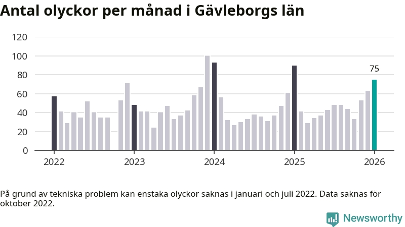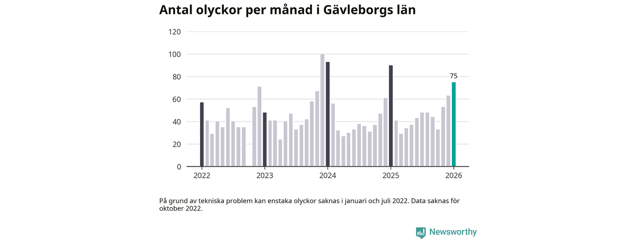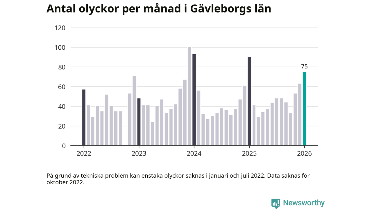 De senaste årens mest olycksdrabbade månad var december för tre år sedan, med 100 olyckor. I genomsnitt rapporteras omkring 48 olyckor per månad i länet, sedan början av 2022.