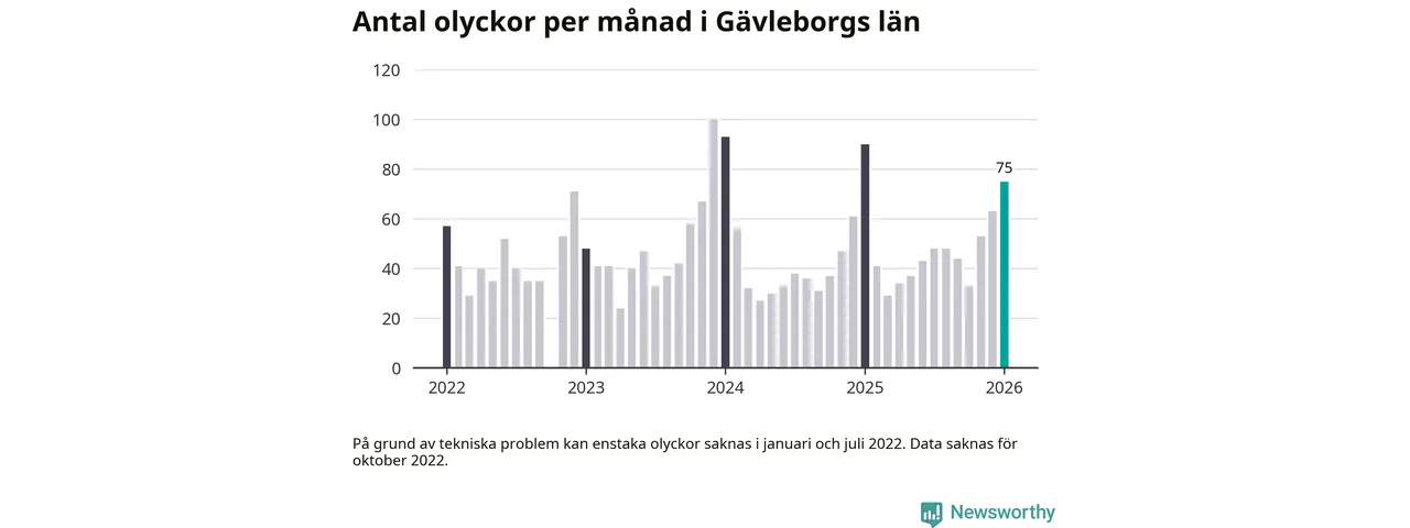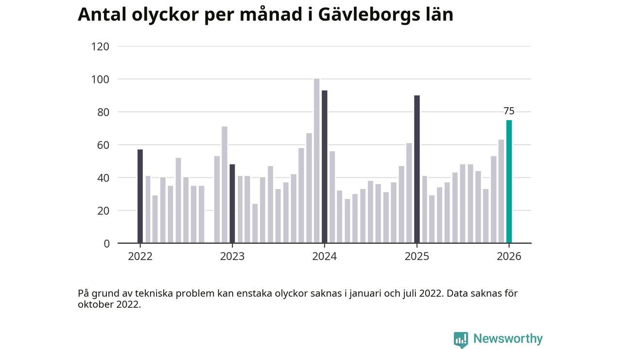 Under januari 2026 rapporterades 75 trafikolyckor längs eller i anslutning till de stora, statliga vägarna i Gävleborg. Det är färre än samma månad i fjol. Nerbrutet per kommun rapporterades flest olyckor, elva stycken, längs E4 genom Gävle kommun. Det är samma mönster som under tidigare månader de senaste åren.