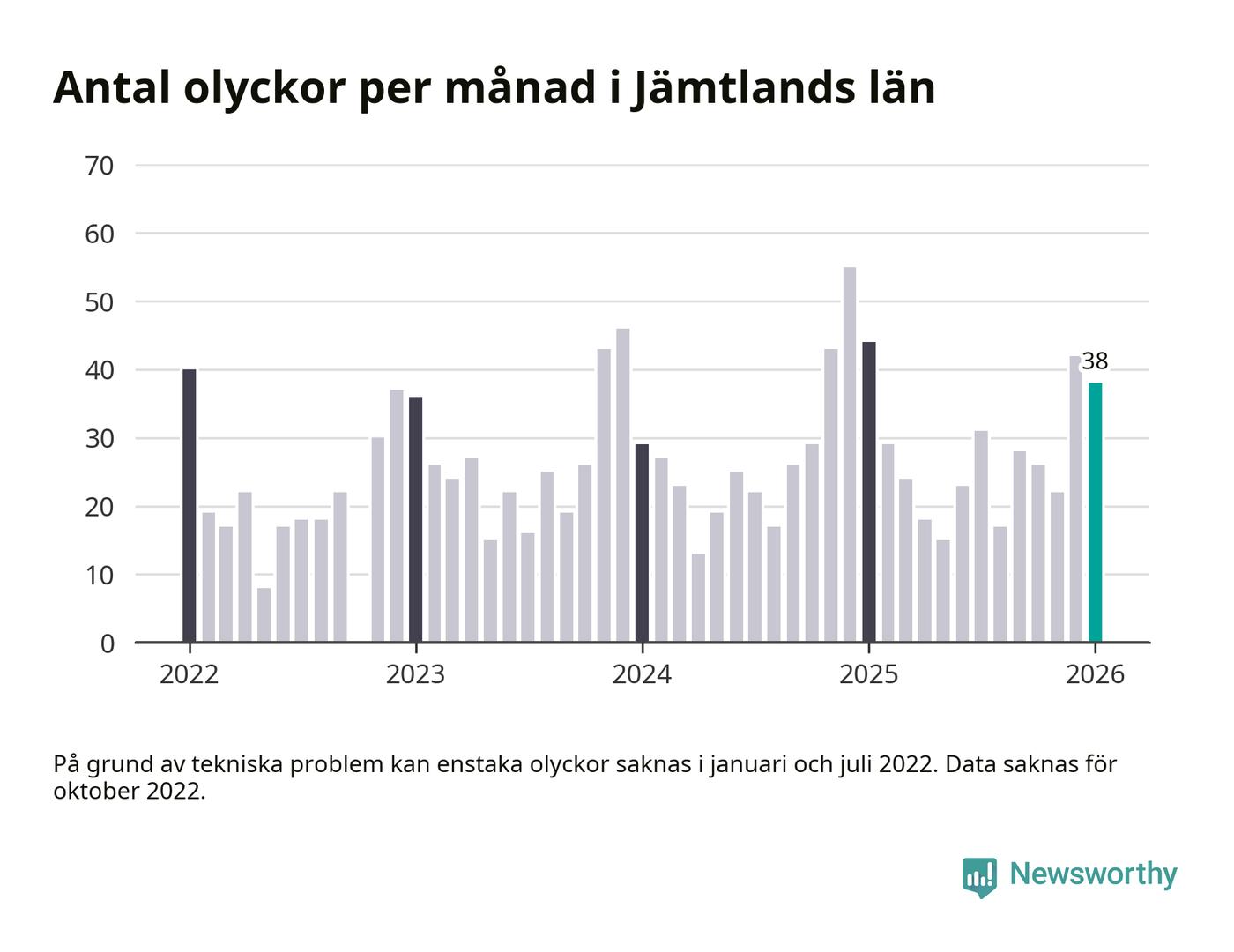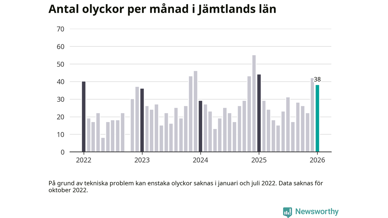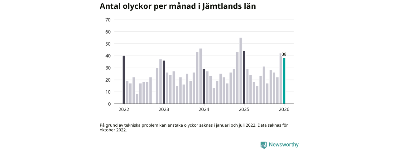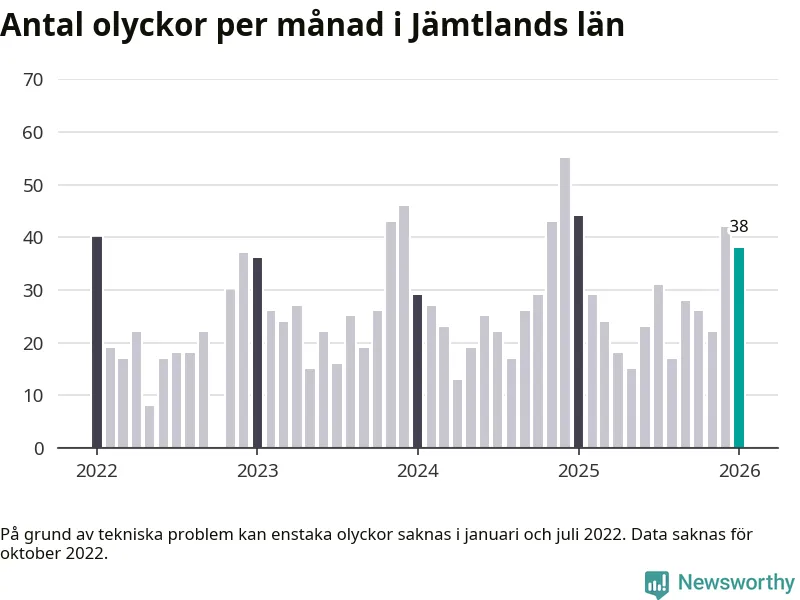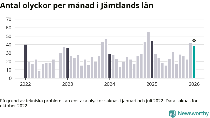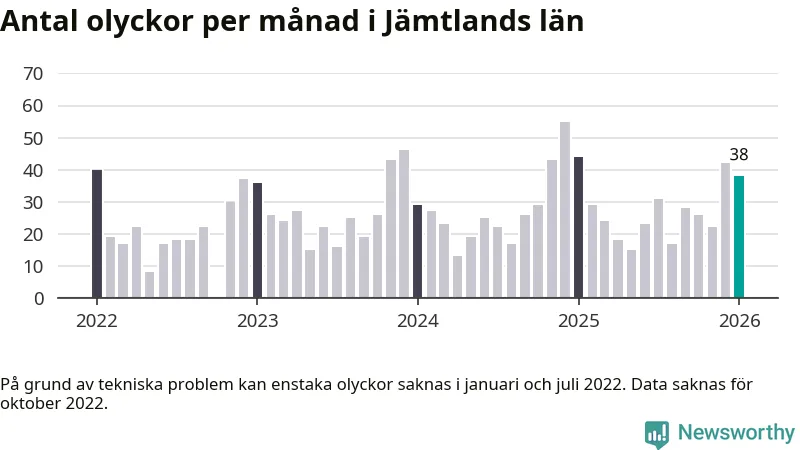 De senaste årens mest olycksdrabbade månad var december för två år sedan, med 55 olyckor. I genomsnitt rapporteras omkring 26 olyckor per månad i länet, sedan början av 2022.
