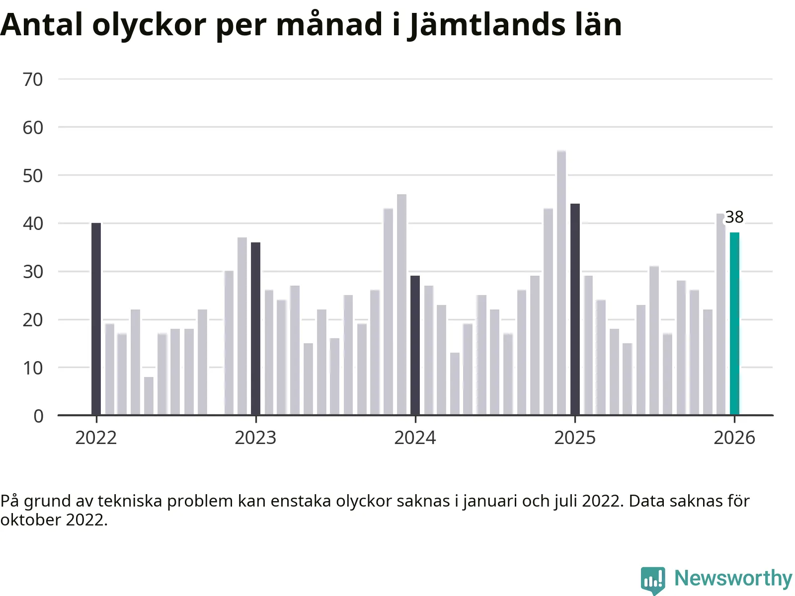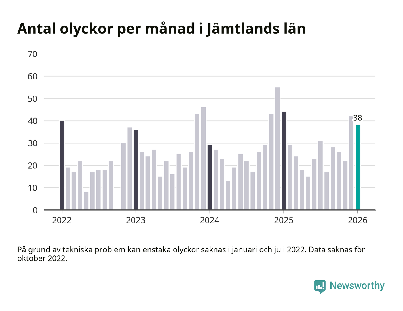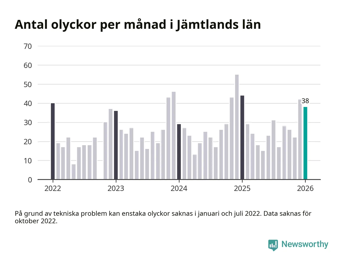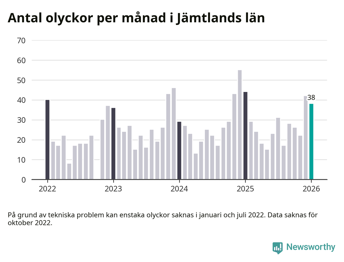 De senaste årens mest olycksdrabbade månad var december för två år sedan, med 55 olyckor. I genomsnitt rapporteras omkring 26 olyckor per månad i länet, sedan början av 2022.