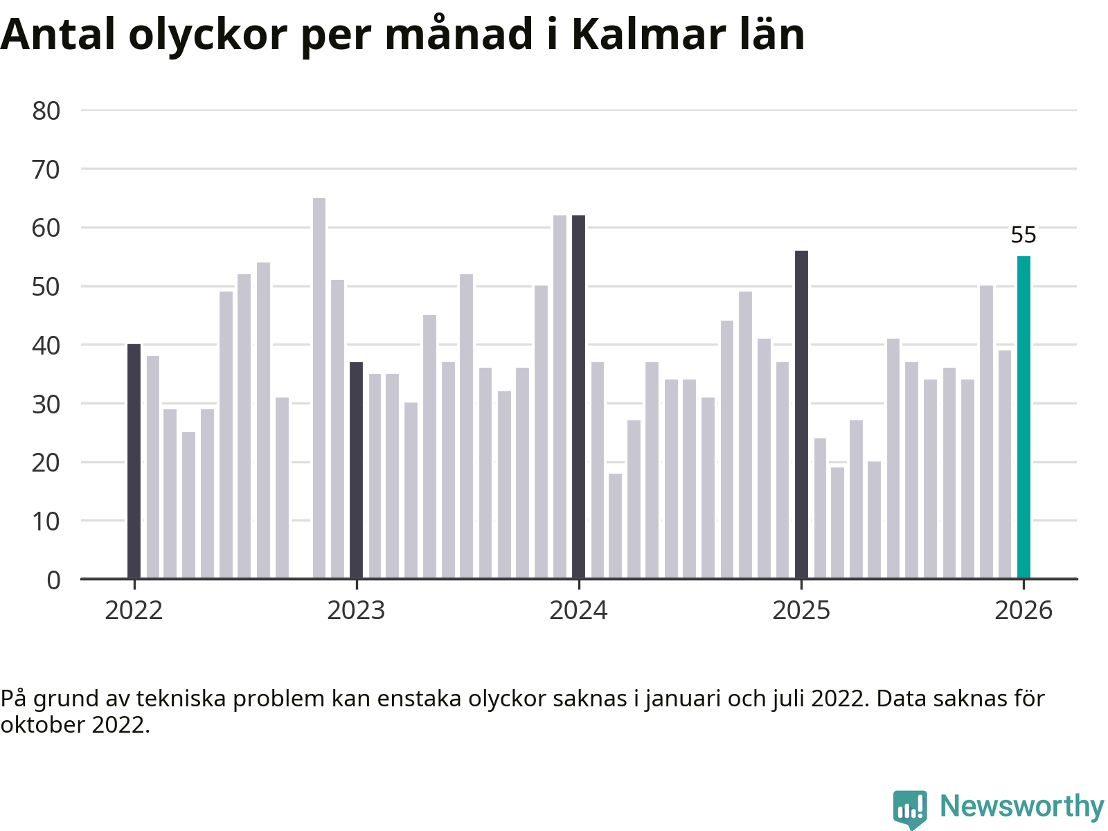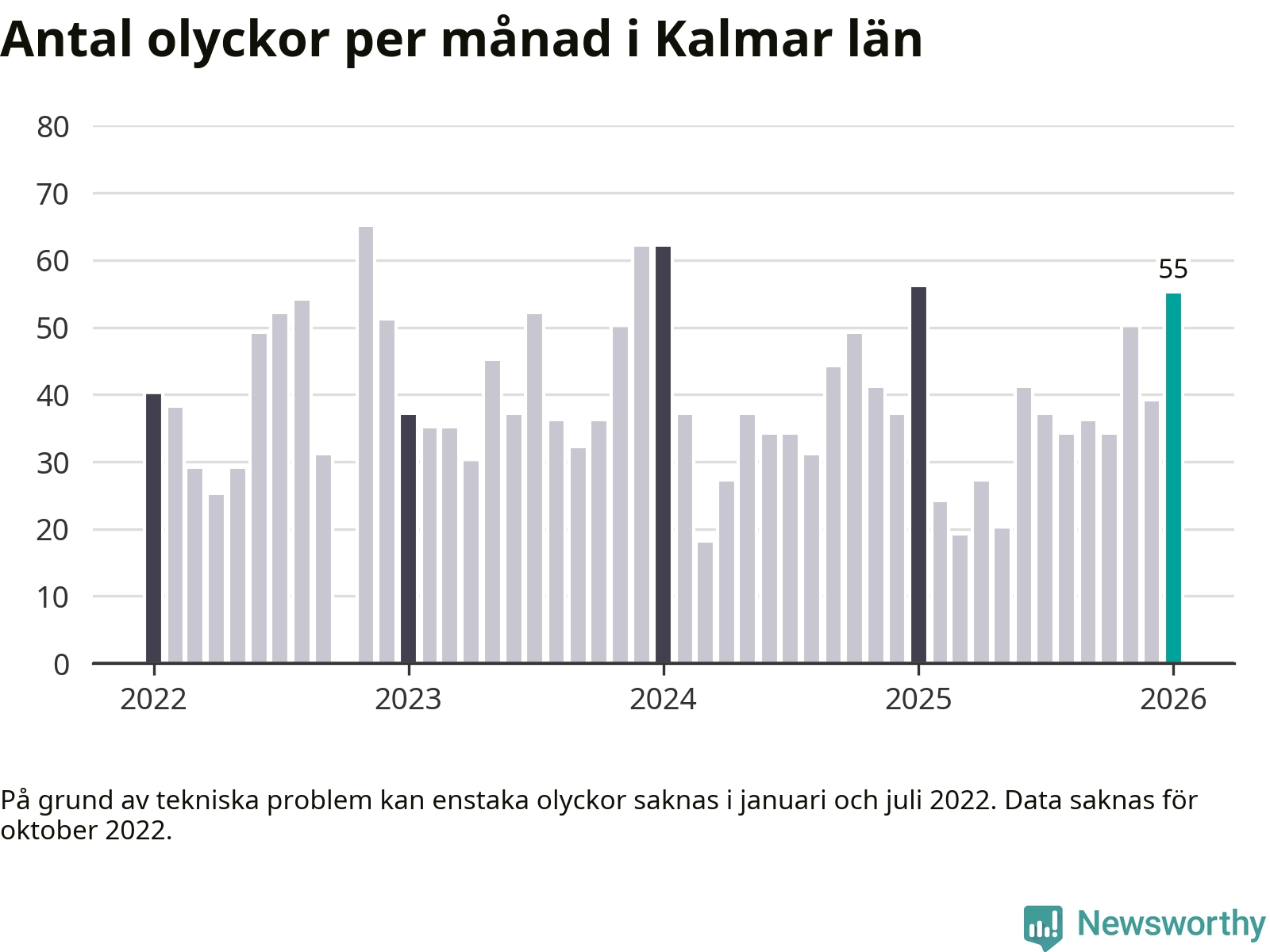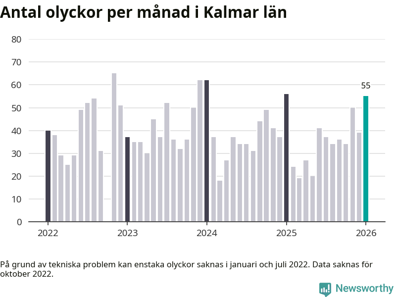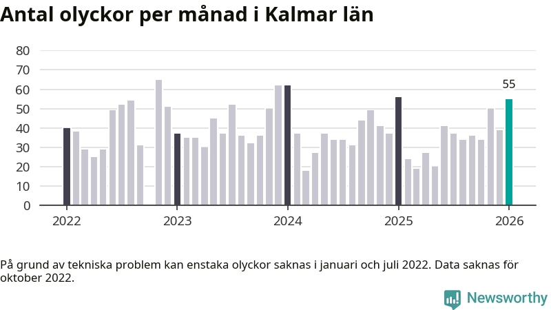 De senaste årens mest olycksdrabbade månad var november för fyra år sedan, med 65 olyckor. I genomsnitt rapporteras omkring 37 olyckor per månad i länet, sedan början av 2022.