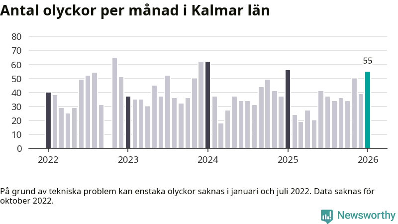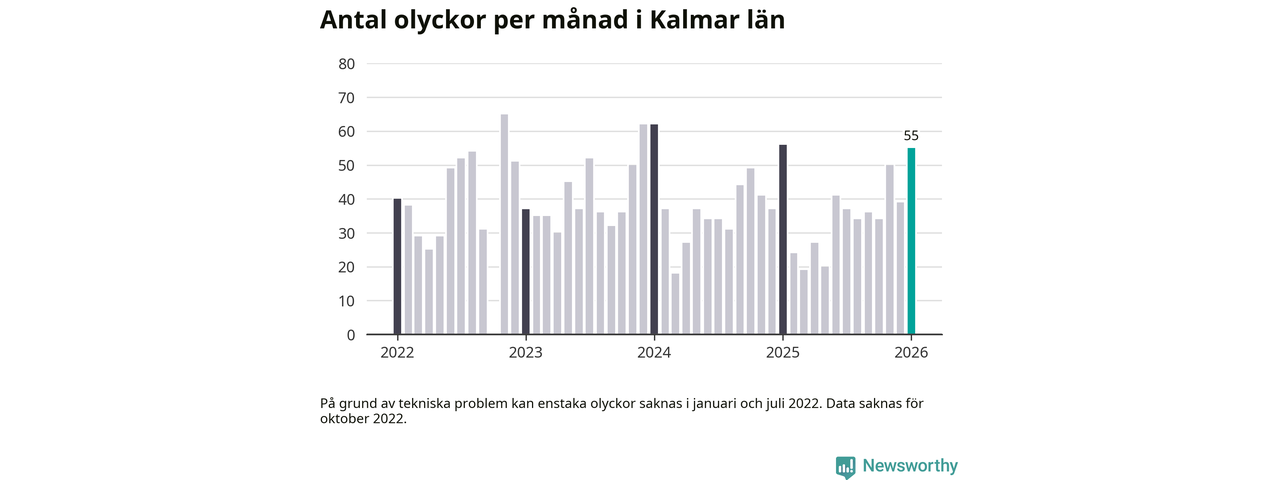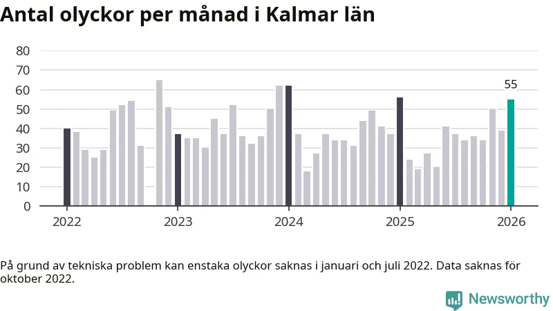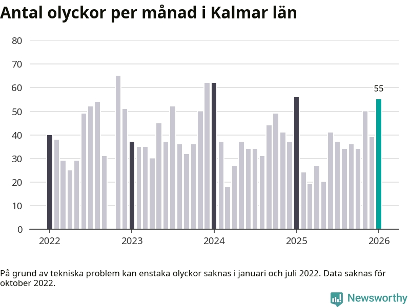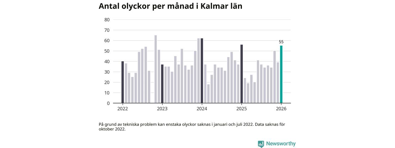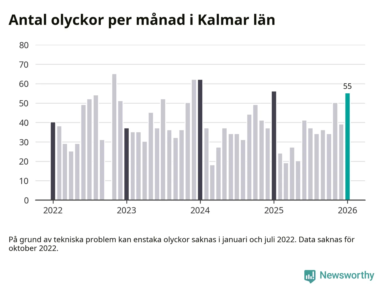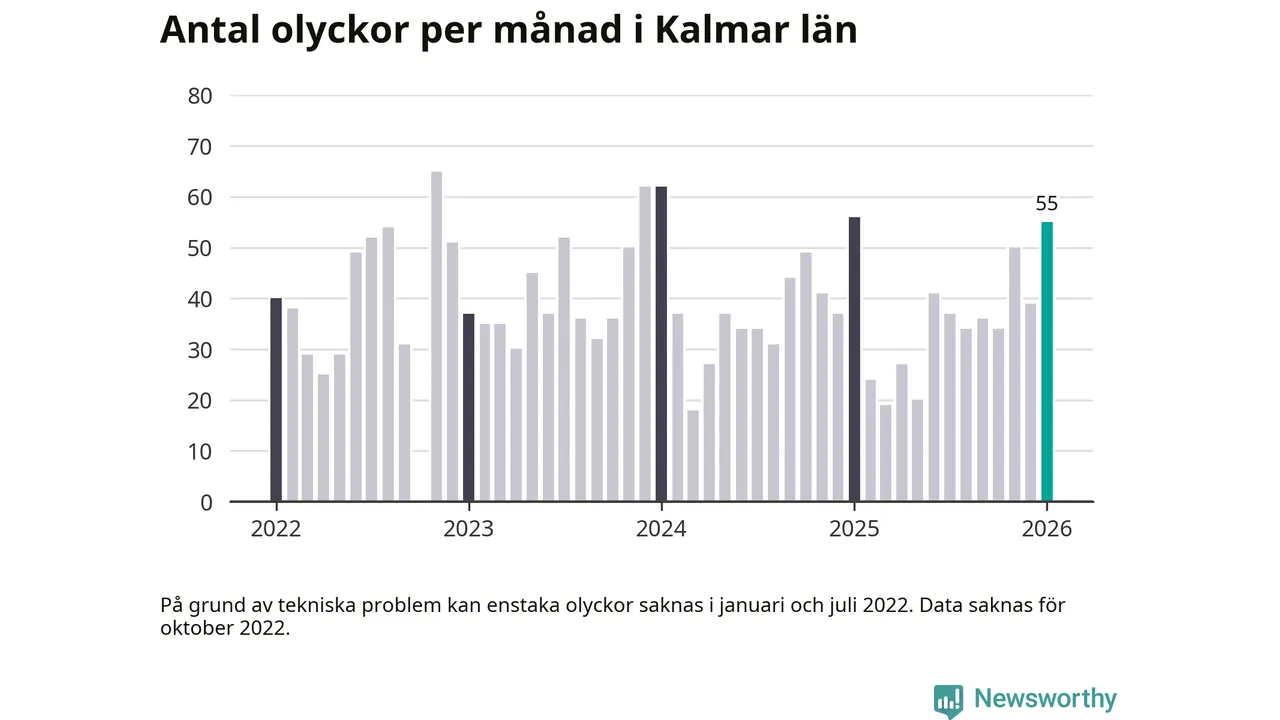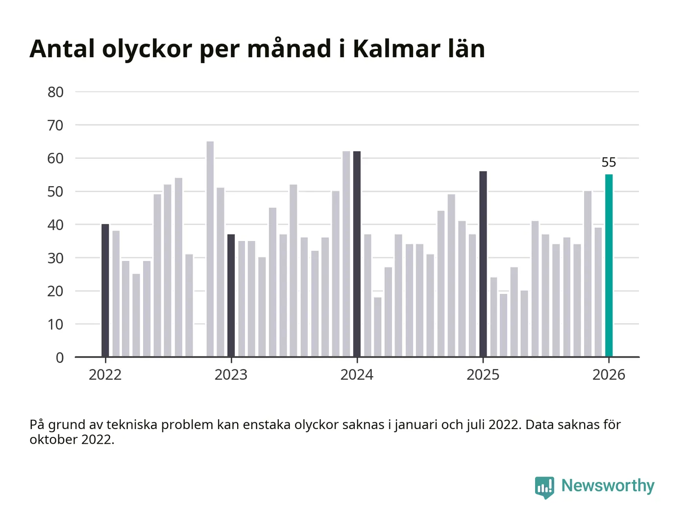 Under januari 2026 rapporterades 55 trafikolyckor längs eller i anslutning till de stora, statliga vägarna i Kalmar län. Nerbrutet per kommun rapporterades flest olyckor, sju stycken, längs E22 genom Kalmar kommun. Det är samma mönster som under tidigare månader de senaste åren.