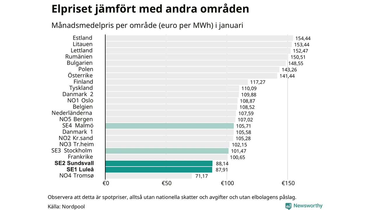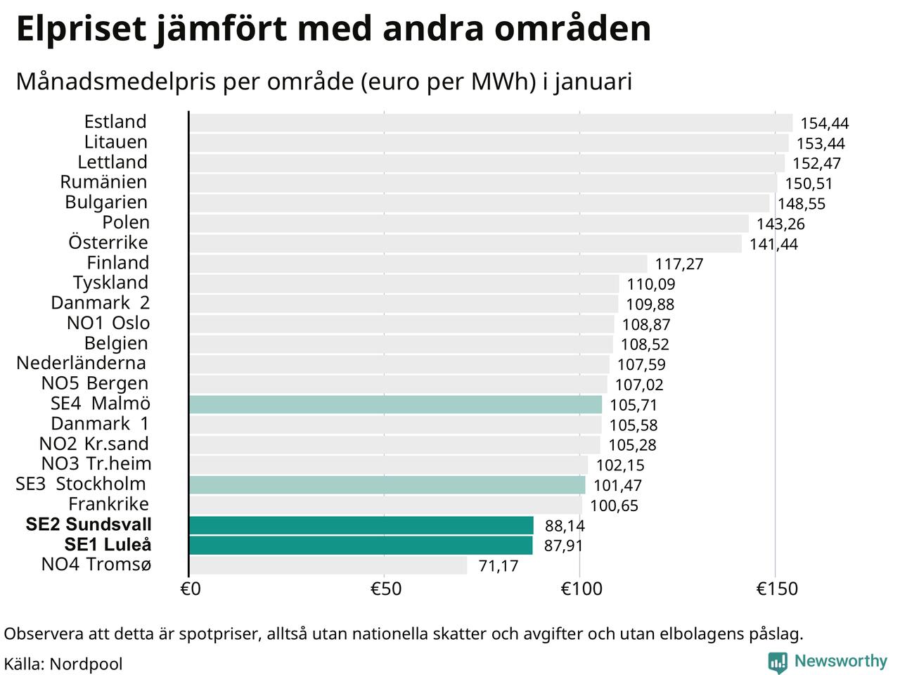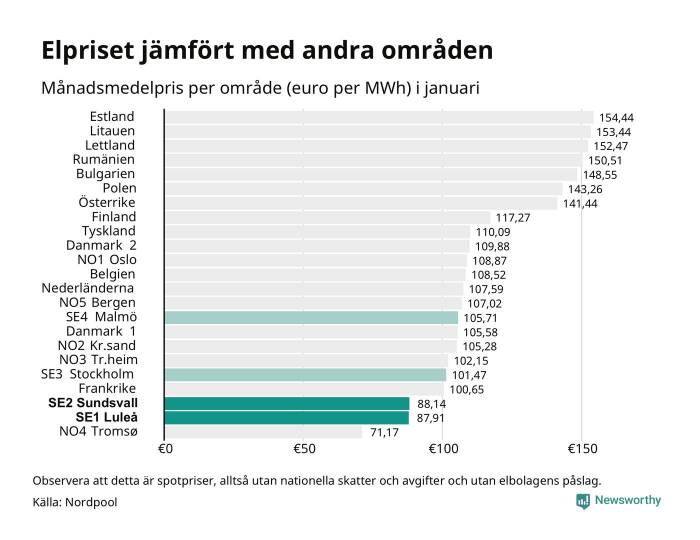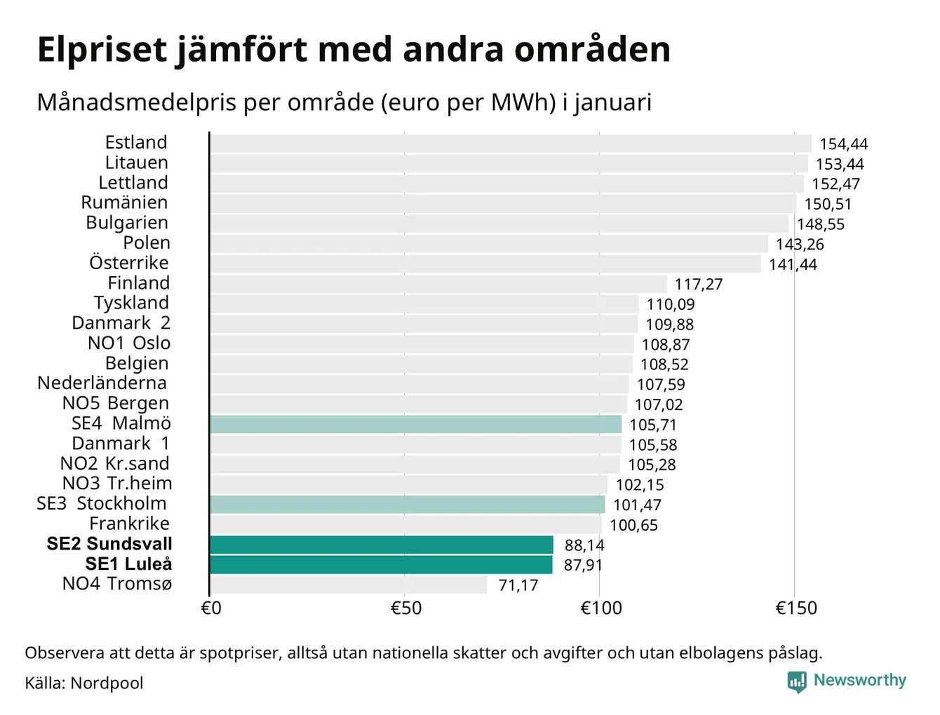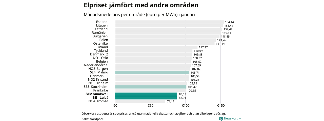 Om man tittar på månadsmedelpriset brukar de svenska elområdena oftast tillhöra de med lägst spotpriser i en europeisk jämförelse. Värt att notera är att detta handlar om spotpriser, de priser konsumenten sedan betalar beror på nationella avgifter och skatter samt elbolagens påslag. I praktiken ligger de svenska konsumentpriserna närmare det europeiska snittet efter skatter och påslag.