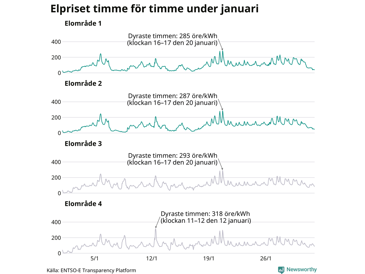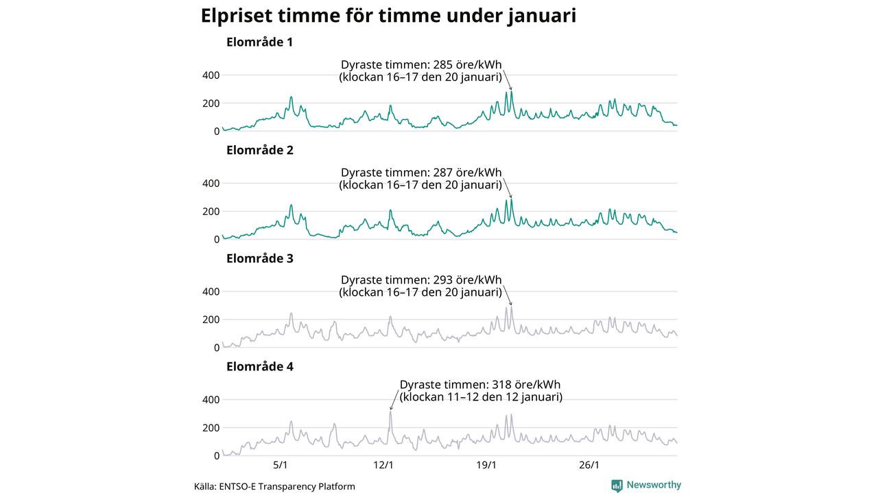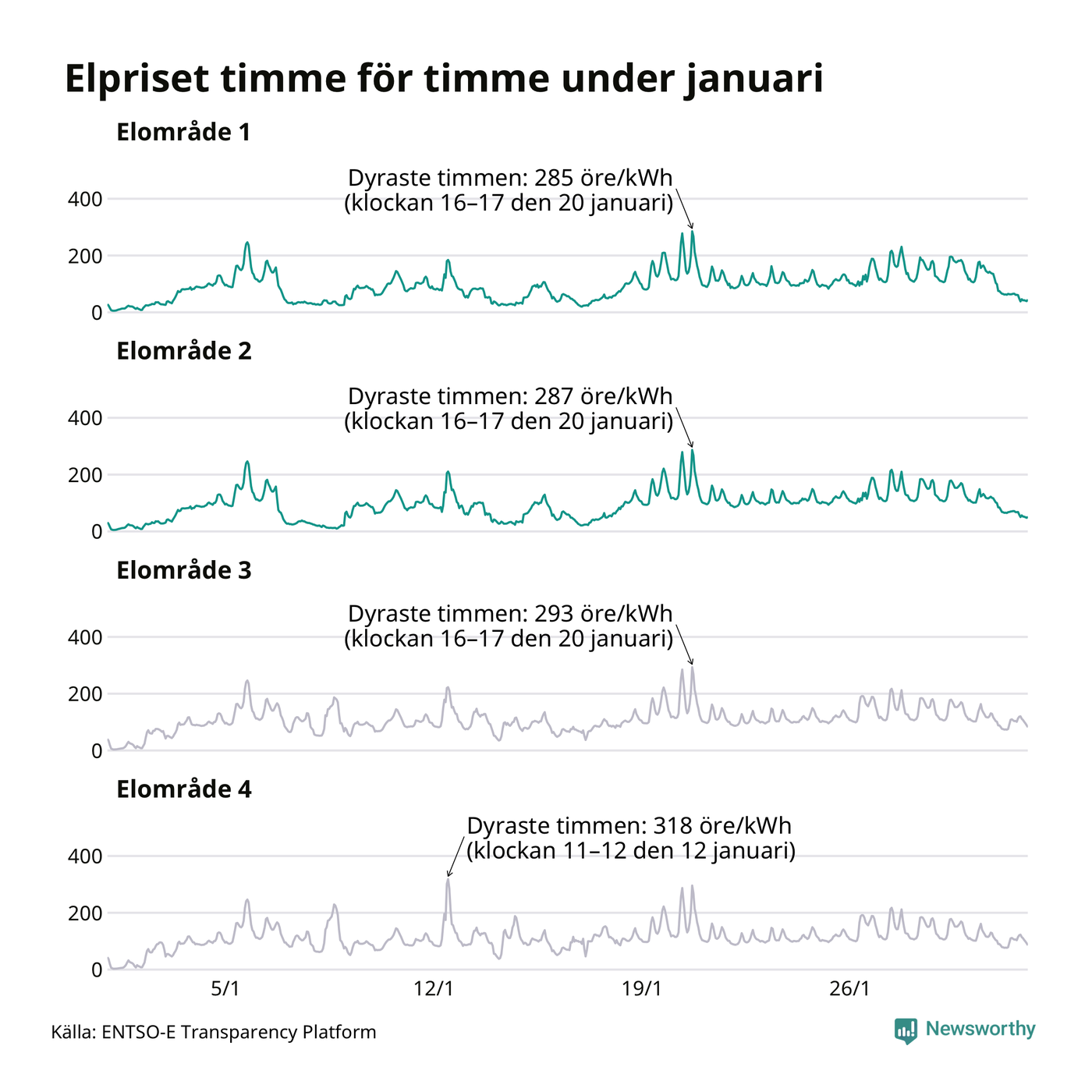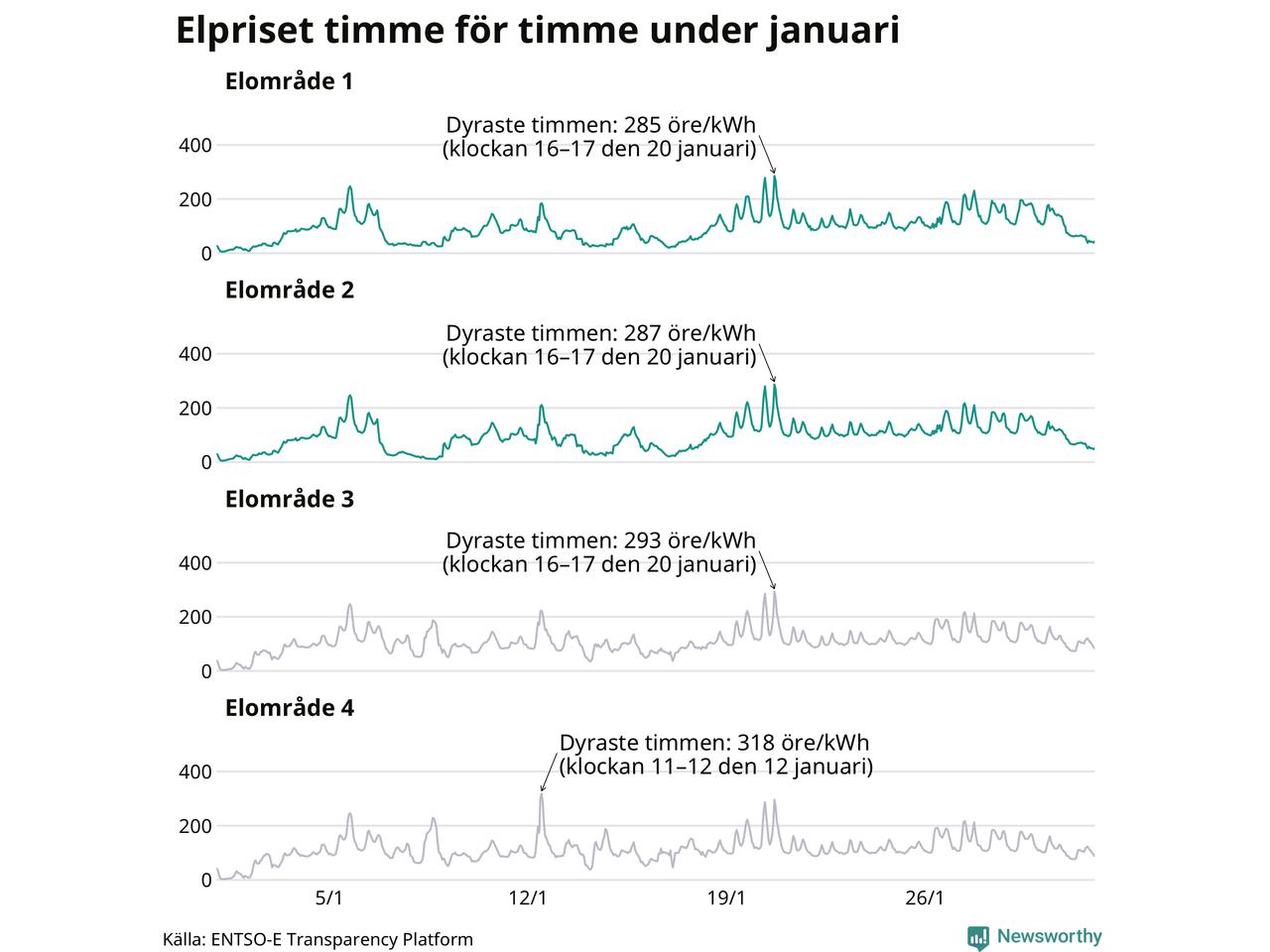 Det är inte bara prisskillnaderna mellan prisområdena som har ökat de senaste åren, även inom områdena pendlar priserna timme för timme – och skillnaderna mellan de dyraste och billigaste timmarna har blivit större sedan 2020. Dyraste timmen i januari i elområde 2 inträffade mellan klockan 15 och 16 den 20 januari, då kostade en kilowattimme 287 öre. Som lägst var priset i området 5 öre. I elområde 1 toppade priset samtidigt på 285 öre per kilowattimme. Som lägst kostade elen i området 6 öre per kilowattimme.