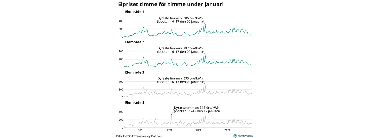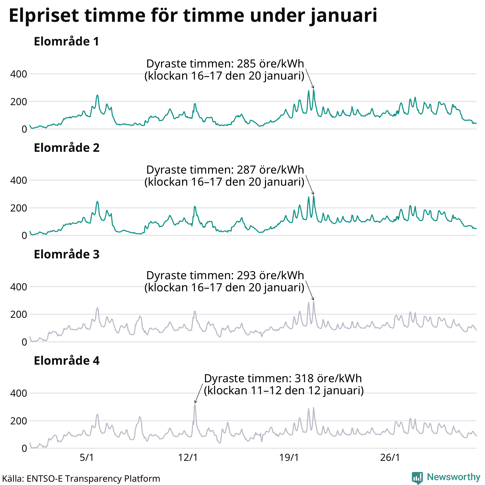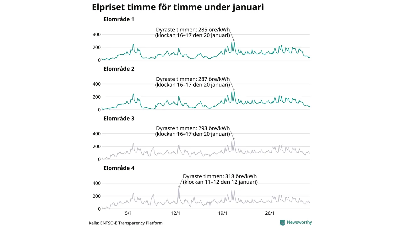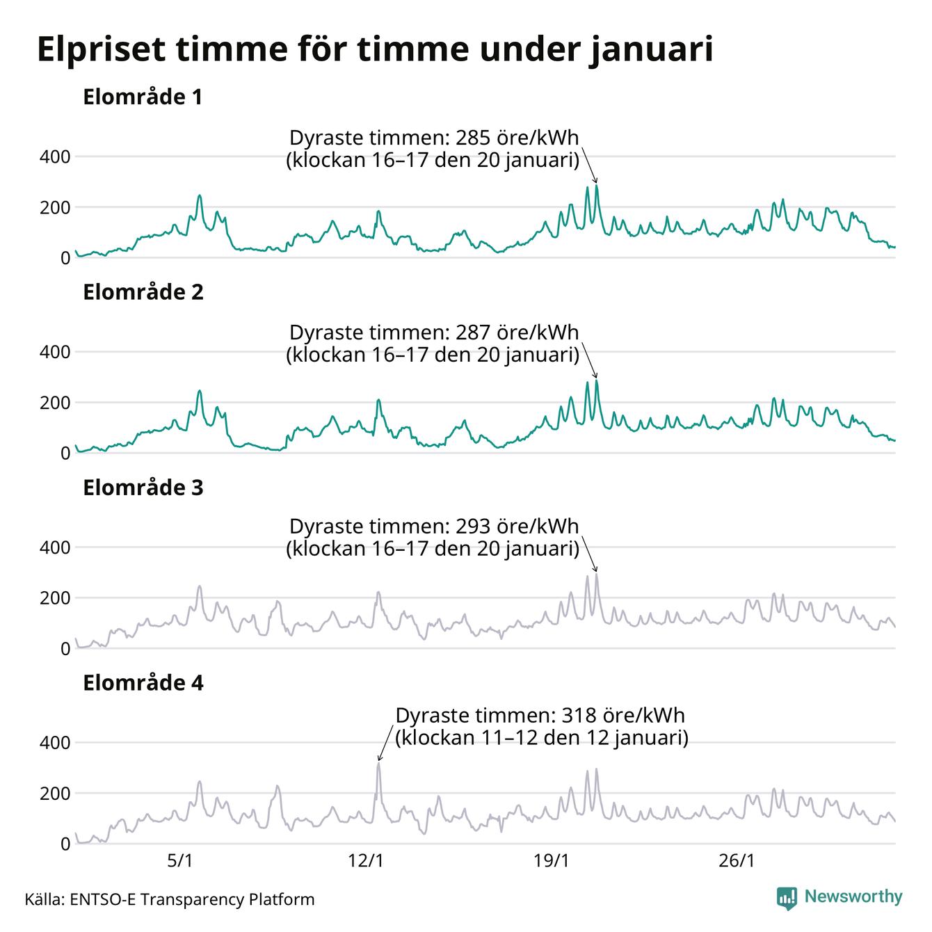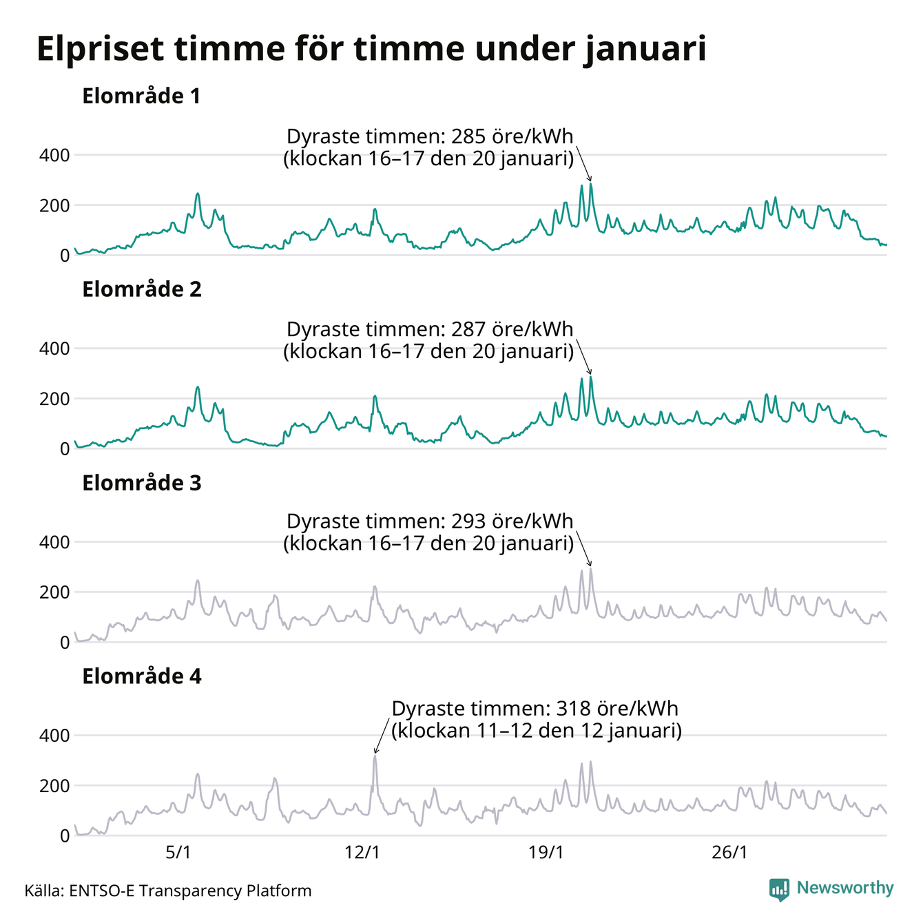 Det är inte bara prisskillnaderna mellan prisområdena som har ökat de senaste åren, även inom områdena pendlar priserna timme för timme – och skillnaderna mellan de dyraste och billigaste timmarna har blivit större sedan 2020. Dyraste timmen i januari i elområde 2 inträffade mellan klockan 15 och 16 den 20 januari, då kostade en kilowattimme 287 öre. Som lägst var priset i området 5 öre. I elområde 1 toppade priset samtidigt på 285 öre per kilowattimme. Som lägst kostade elen i området 6 öre per kilowattimme.