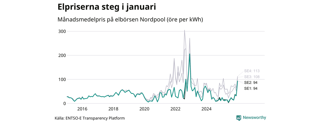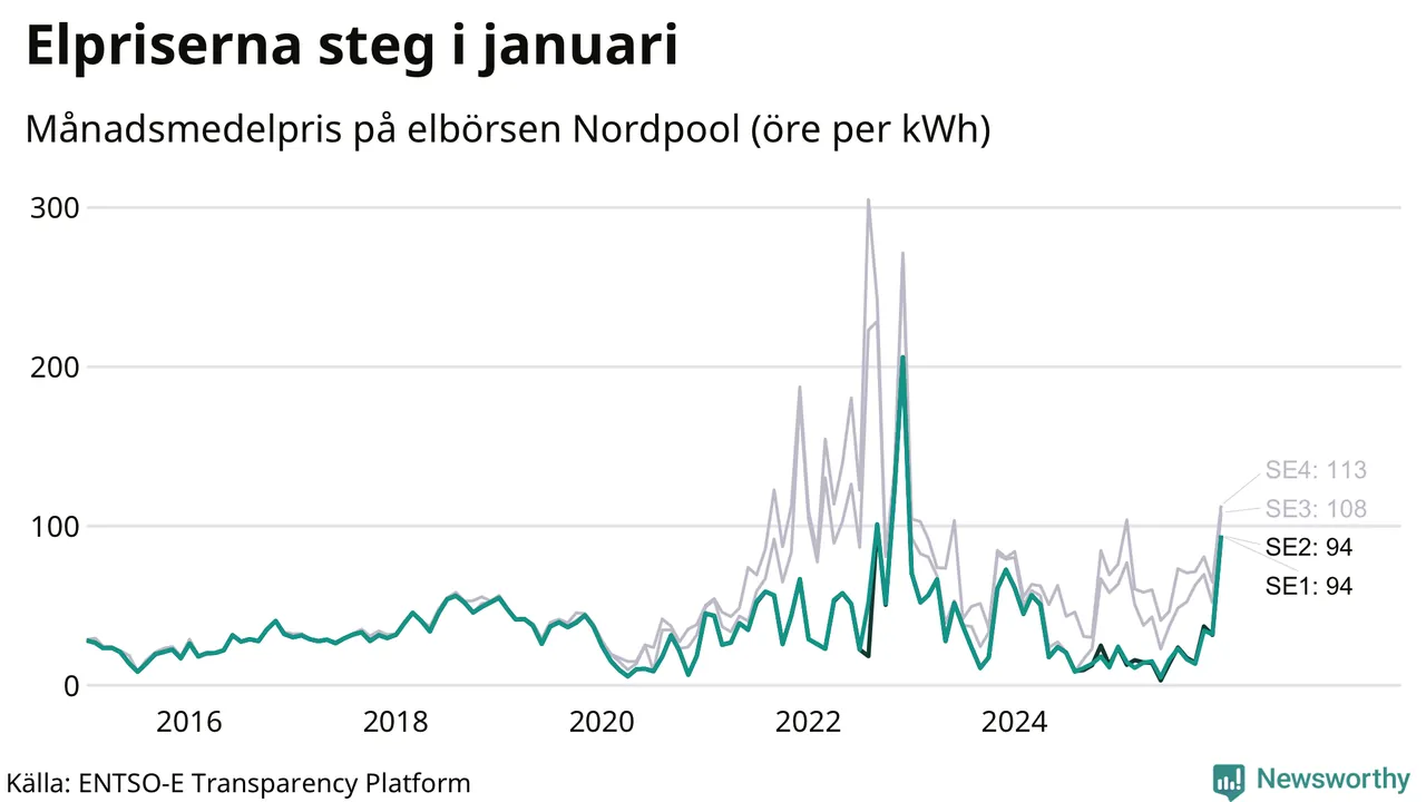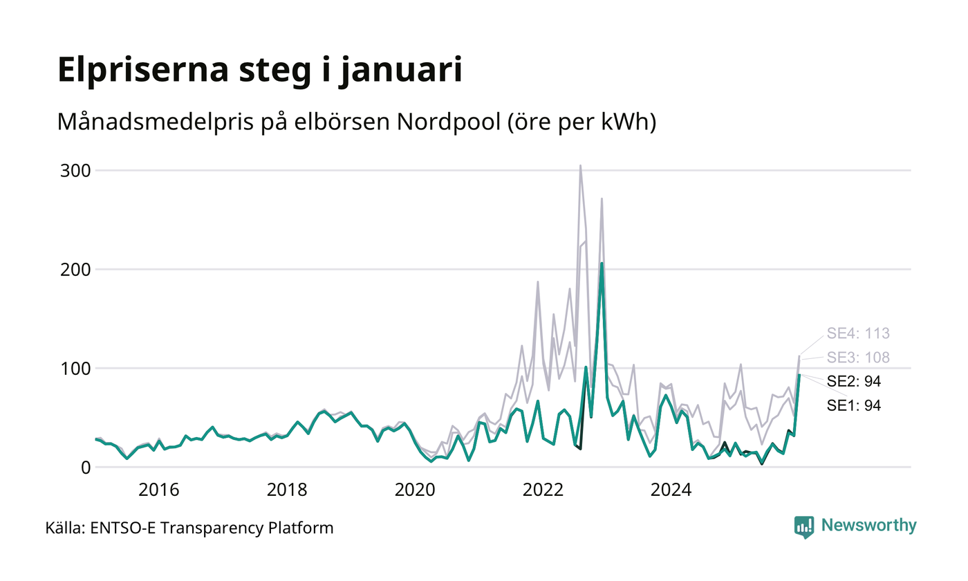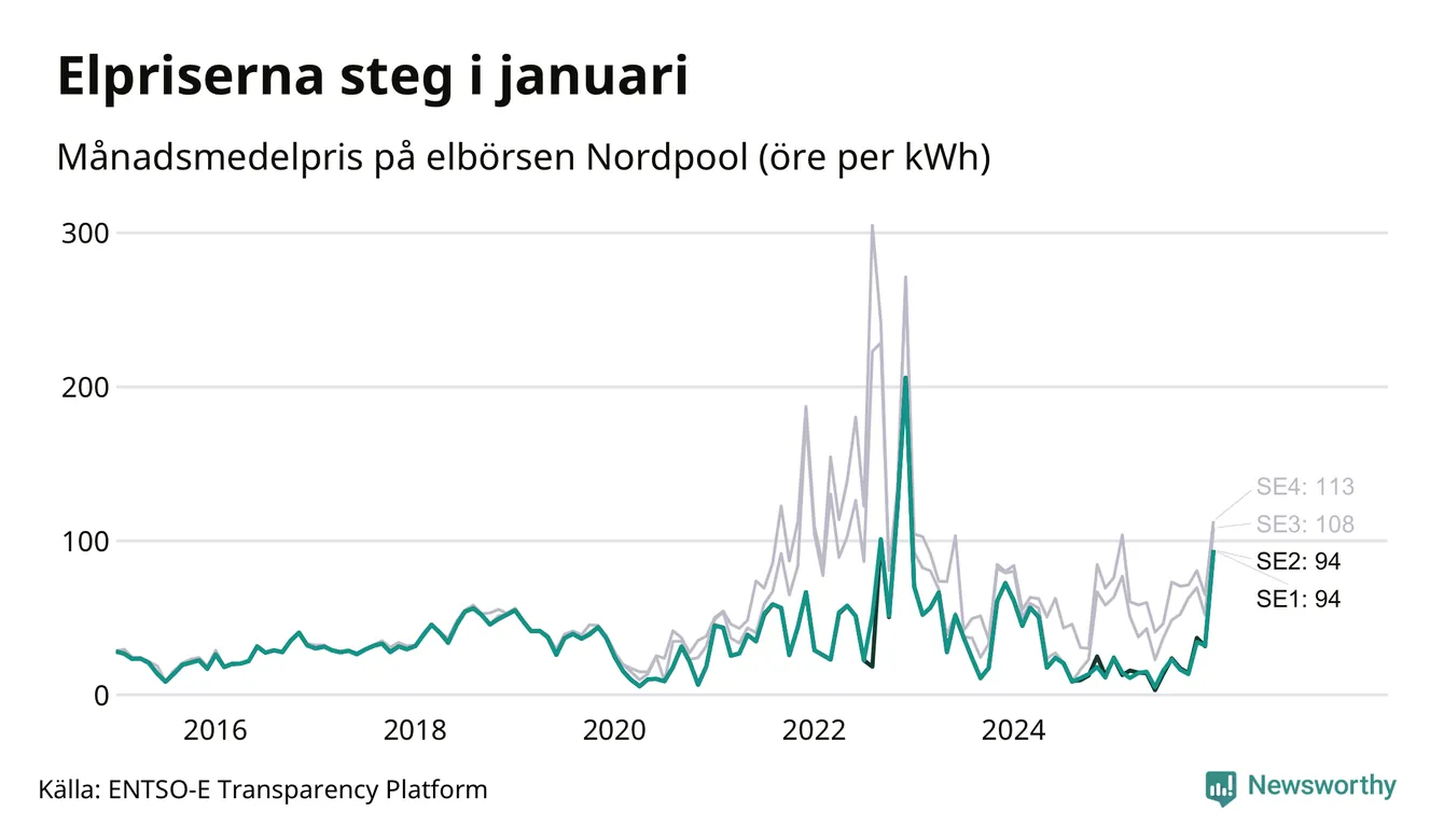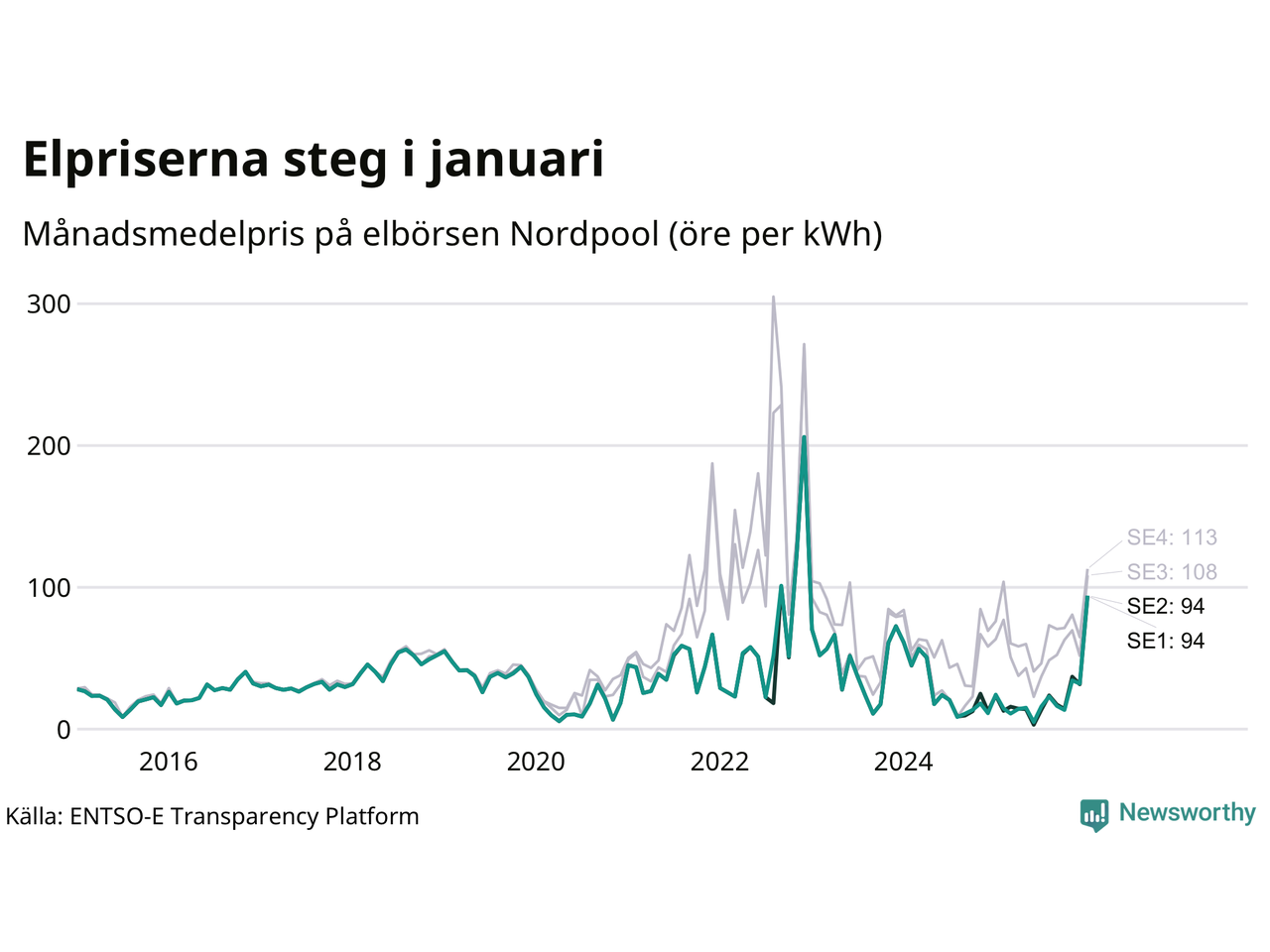 Umeå kommun tillhör två elområden, tätorten Umeå ligger i elområde 2, medan till exempel Botsmark tillhör elområde 1. Spotpriset – alltså priset som elbolagen köper in elen för – steg i båda områdena i januari: I båda elområdena landande månadsmedelpriset per kilowattimme på 94 öre. Det kan jämföras med 32 öre december. Rekordnoteringarna för områdena är på 206 öre per kilowattimme i december 2022 – och faktum är att medelpriset den senaste månaden är det högsta som noterats sedan dess. För ett år sedan, i januari 2025, var snittpriset 24 öre per kilowattimme i elområde 2 och 24 öre per kilowattimme i elområde 1.