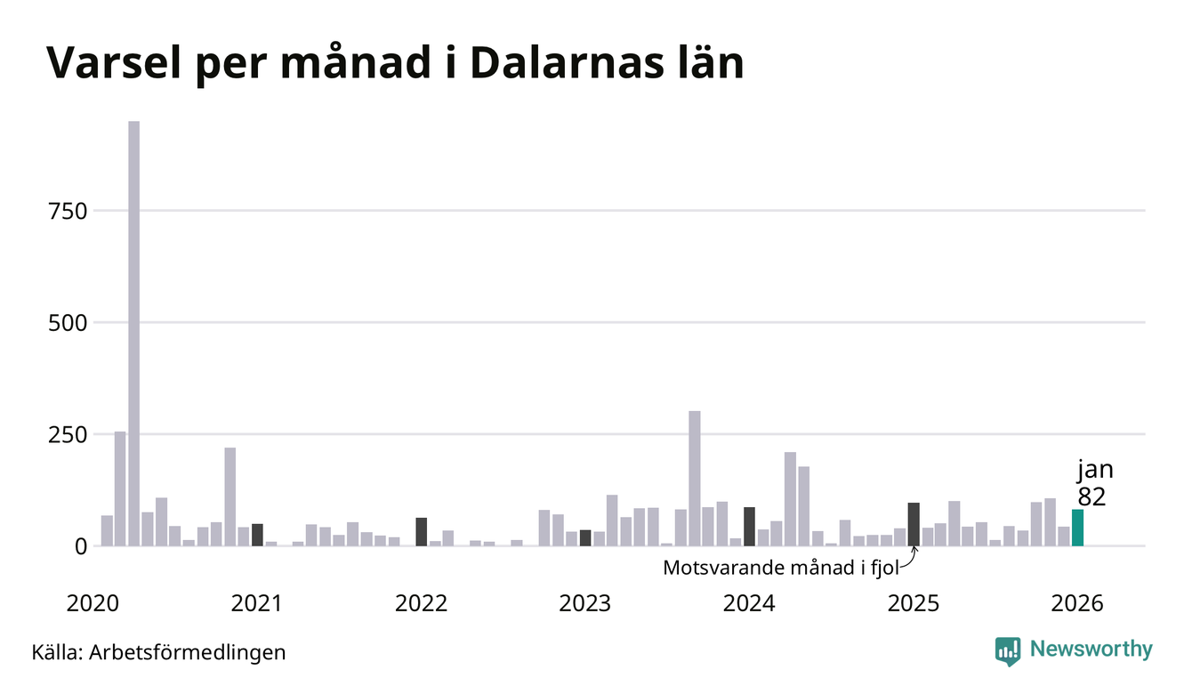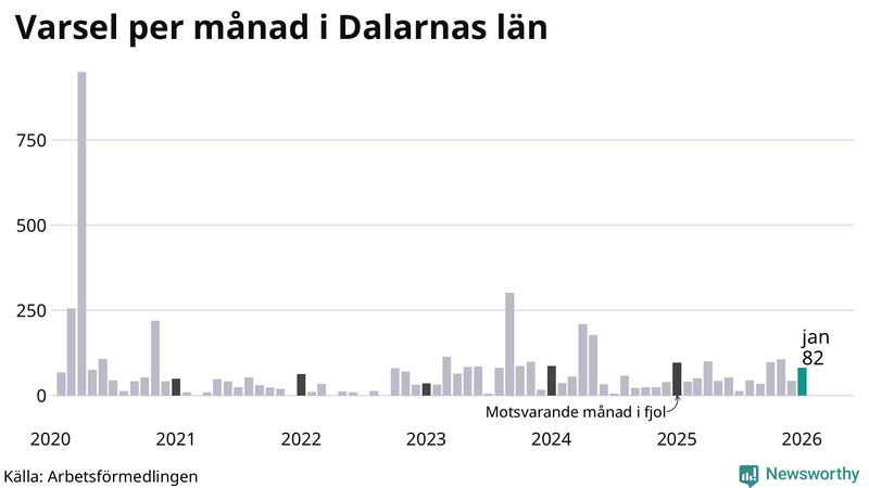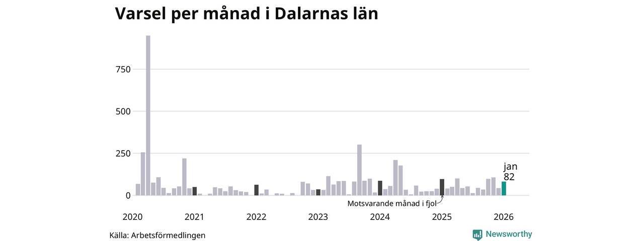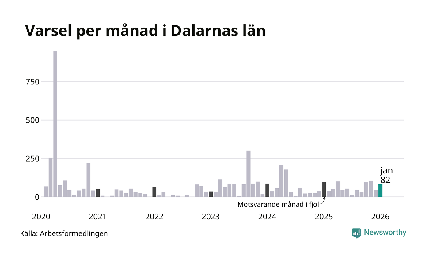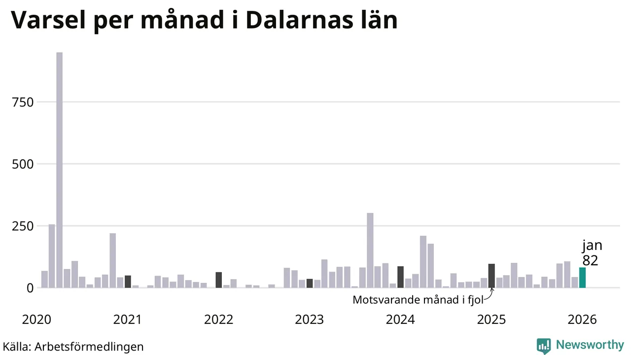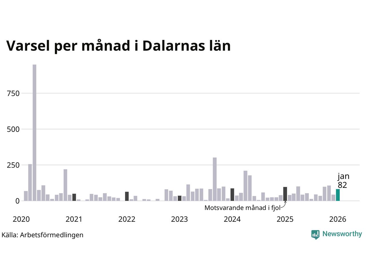 82 personer varslades om uppsägning i Dalarna under januari 2026. Det är 39 fler än i december. För ett år sedan var antalet varsel 97 i länet. Sett över de tre senaste månaderna har totalt 231 varsel rapporterats i Dalarna, vilket är 71 fler än motsvarande period 2025. I början av pandemin, i april 2020, varslades som mest 949 personer under en månad i Dalarna.