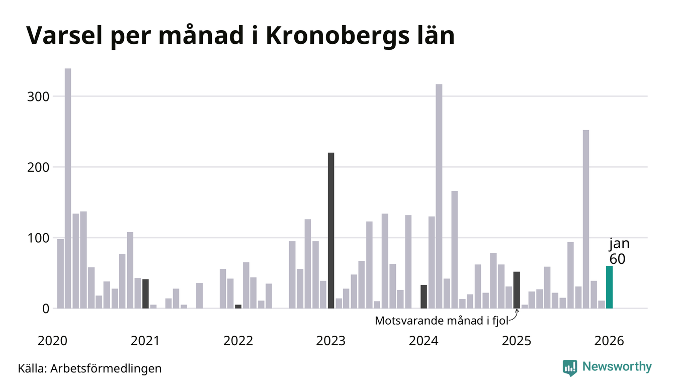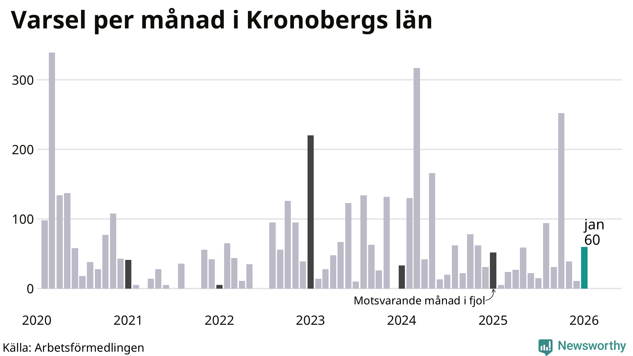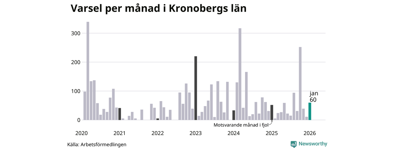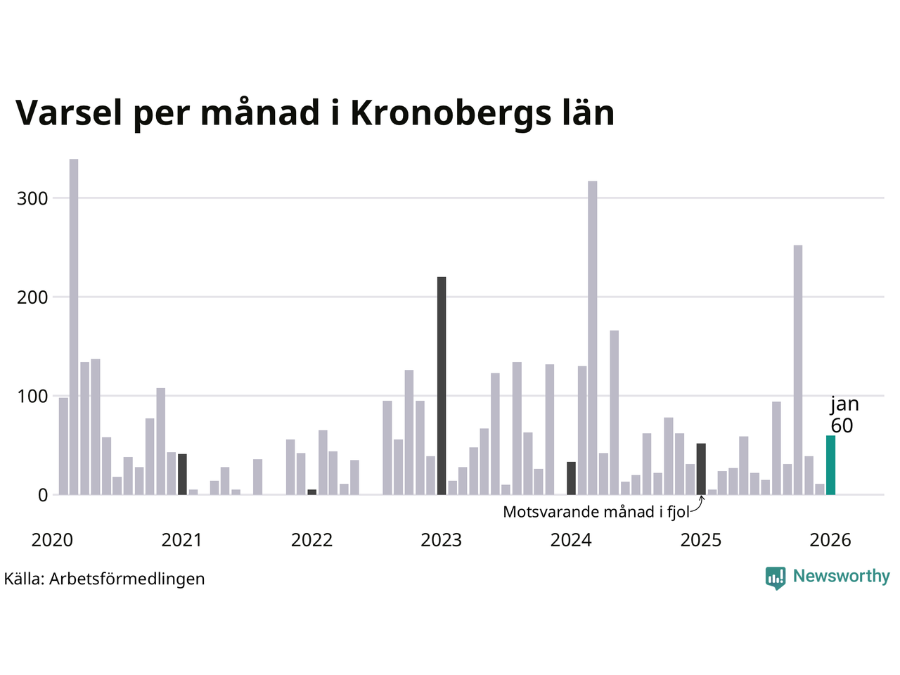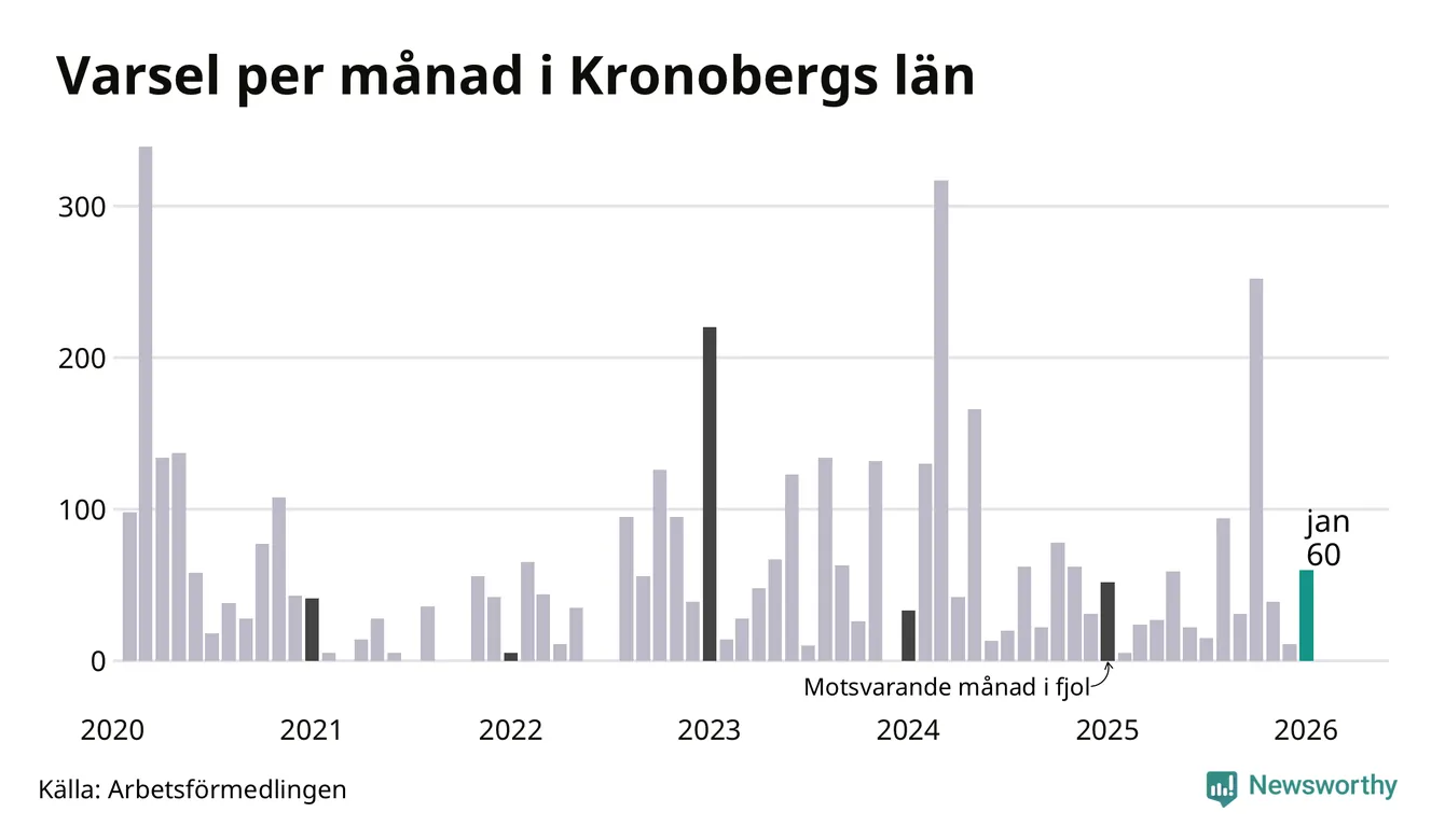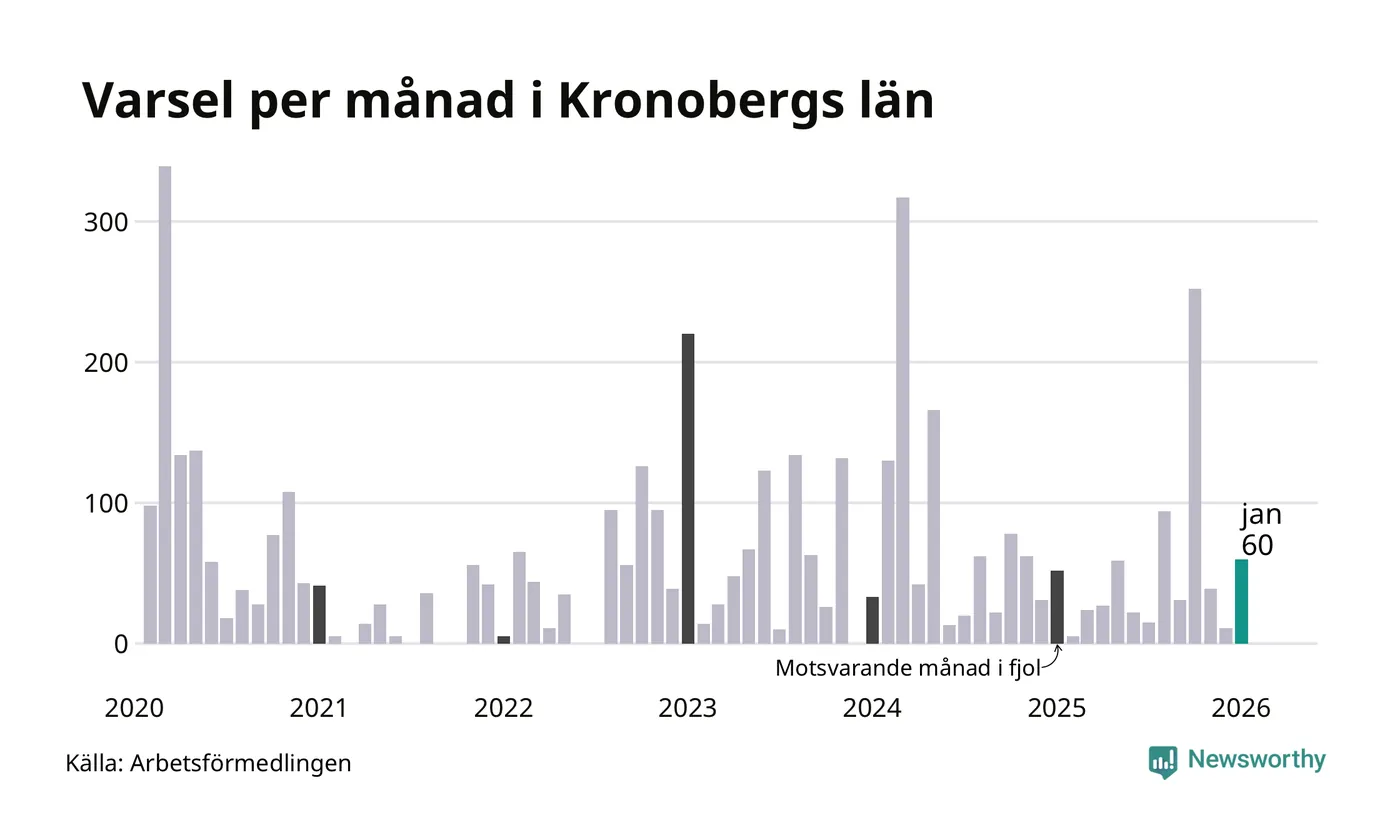 60 personer varslades om uppsägning i Kronoberg under januari 2026. Det är 49 fler än i december. För ett år sedan var antalet varsel 52 i länet. Sett över de tre senaste månaderna har totalt 110 varsel rapporterats i Kronoberg, vilket är 35 färre än motsvarande period 2025. I början av pandemin, i mars 2020, varslades som mest 339 personer under en månad i Kronoberg.