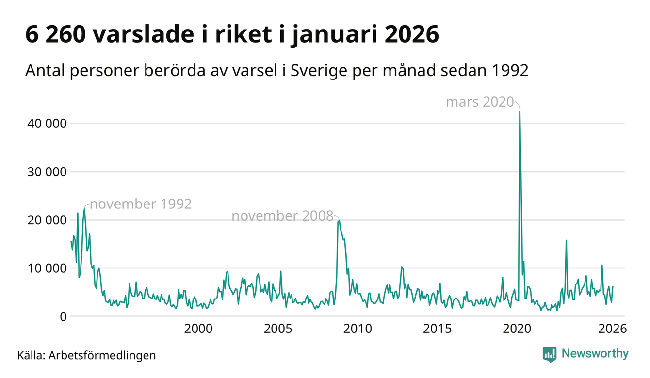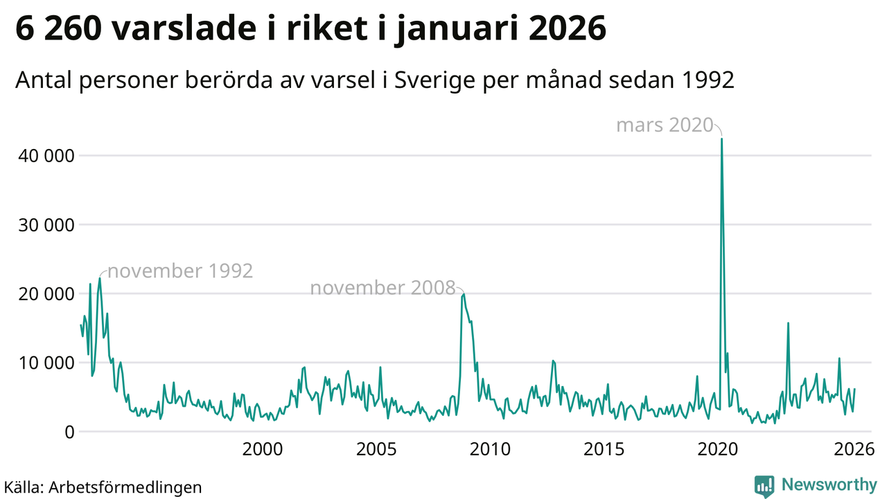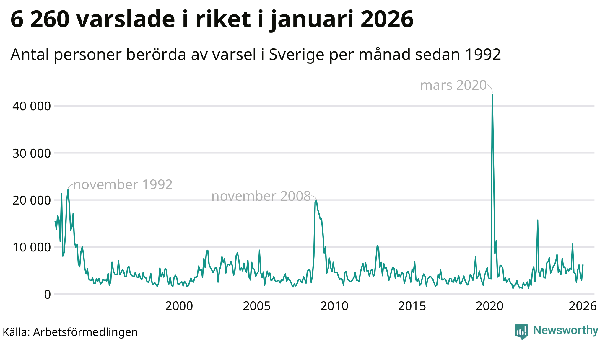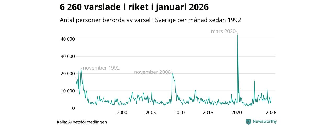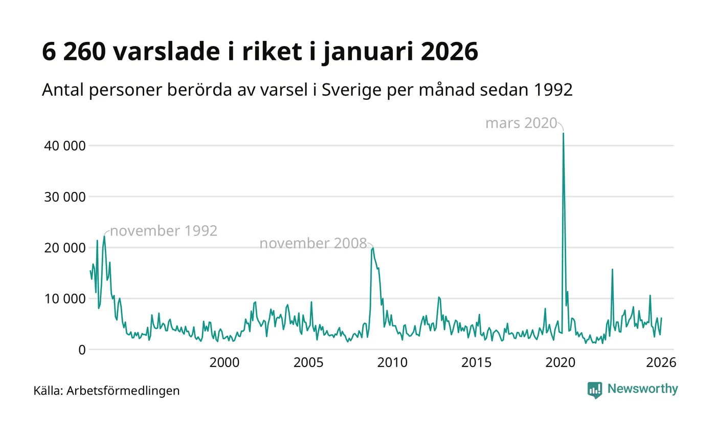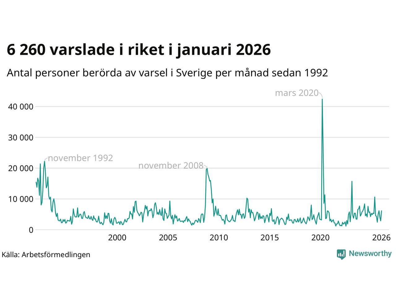 I hela riket varslades 6 260 personer under januari 2026, vilket är omkring 3 400 fler än i december och mer än 900 fler än i januari 2025. Under de tre senaste månaderna har totalt omkring 13 200 varslats om uppsägning i Sverige. Det är drygt 2 100 färre än motsvarande period i fjol.