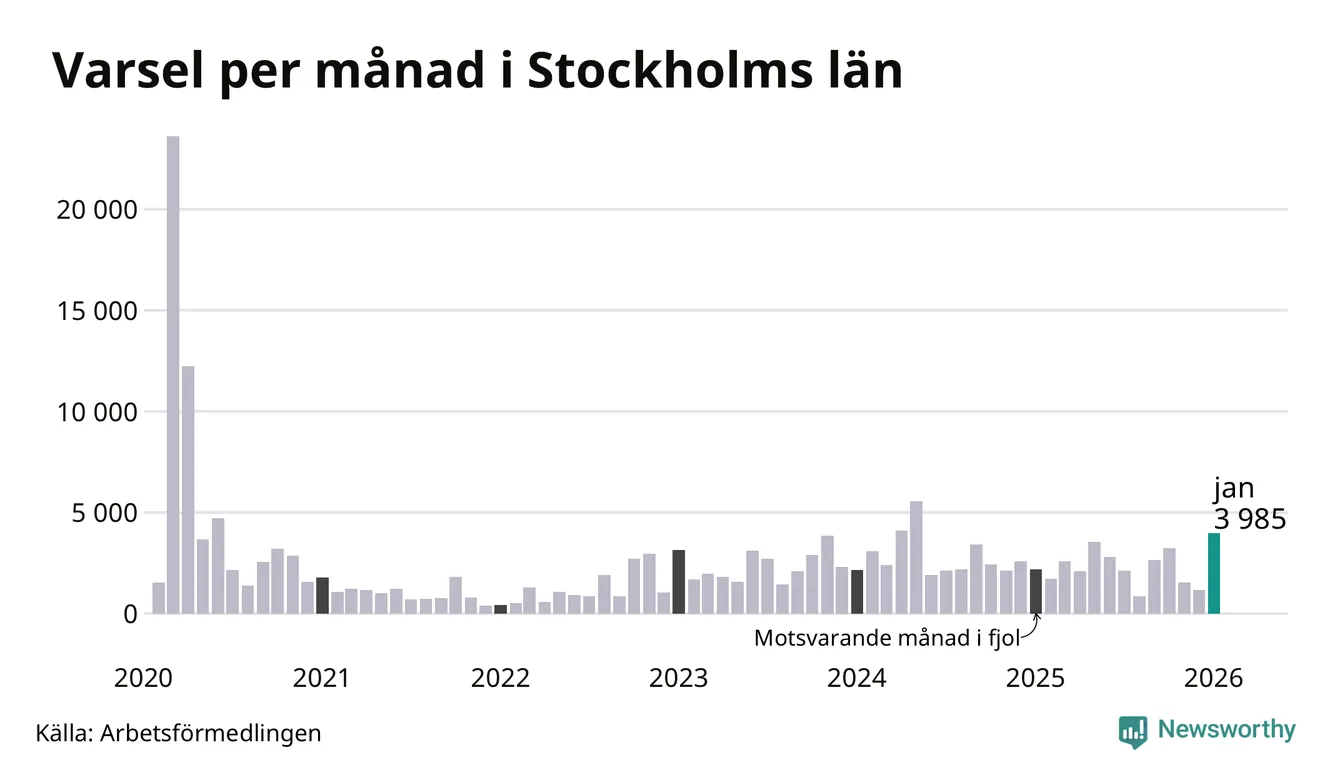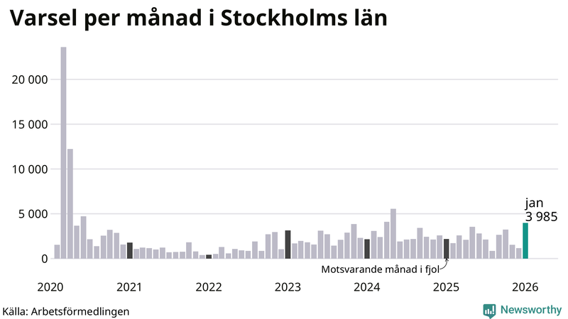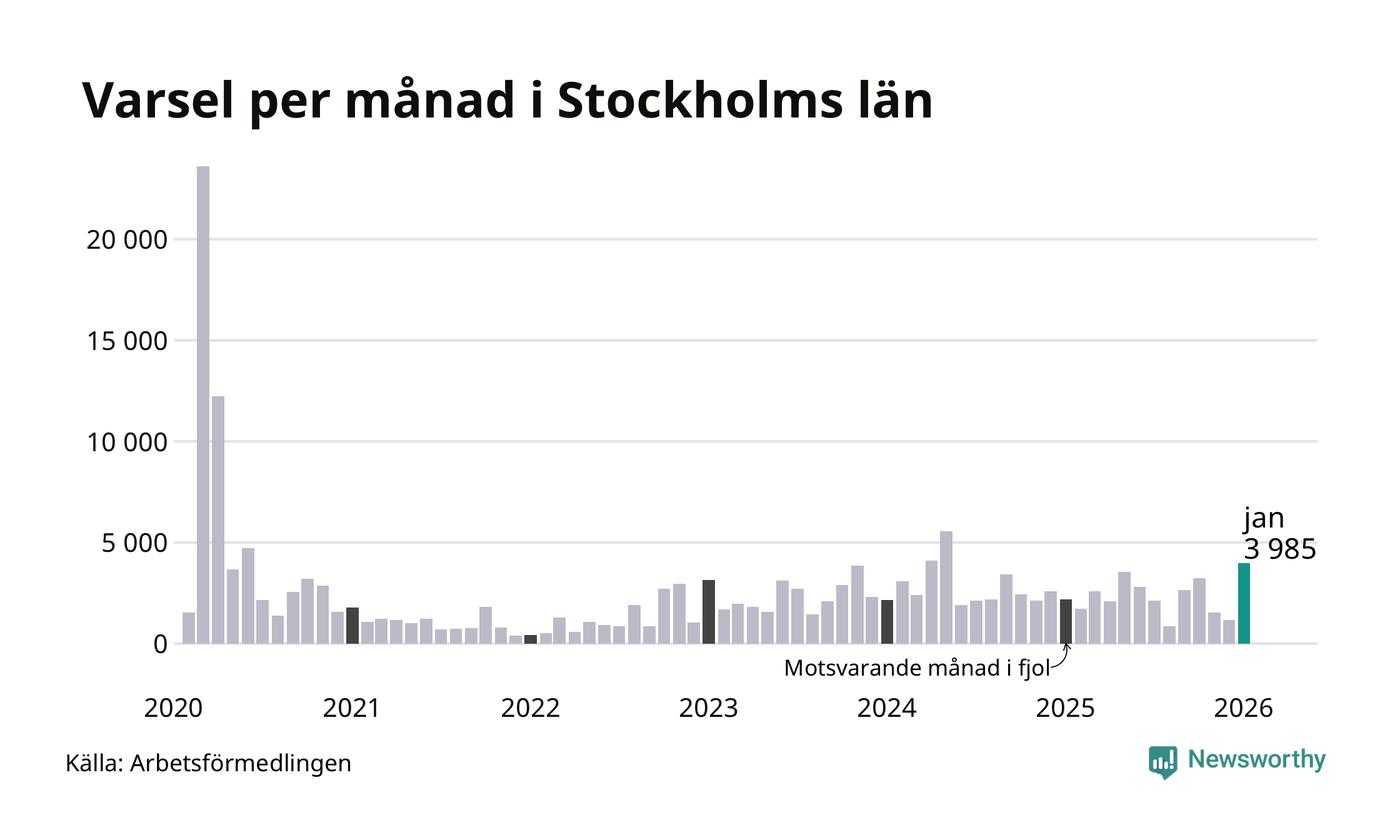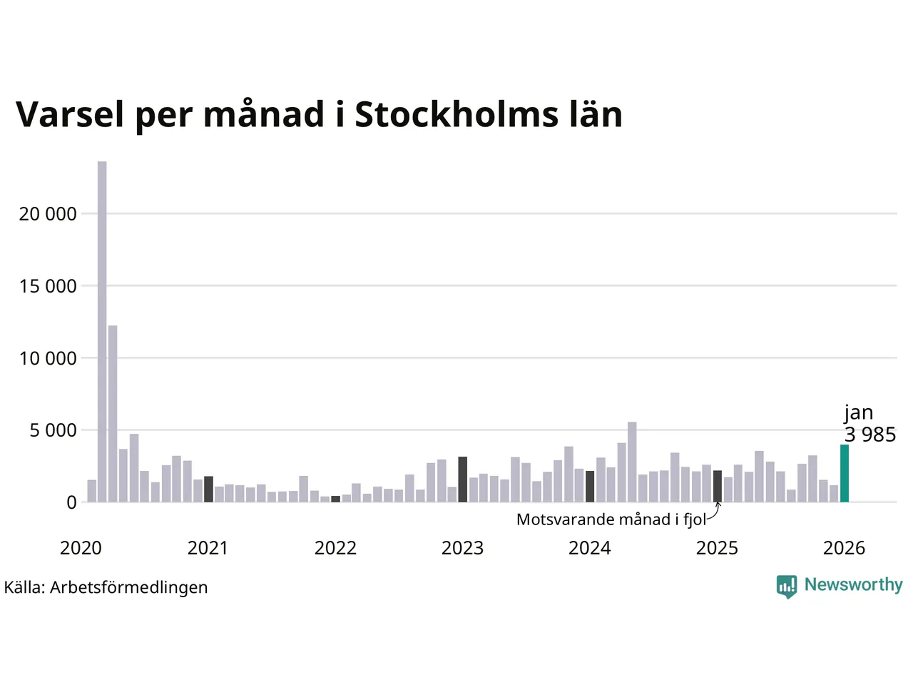 3 985 personer varslades om uppsägning i Stockholms län under januari 2026. Det är 2 833 fler än i december och den högsta siffran sedan maj 2024. Däremot är det fortfarande betydligt färre än i början av pandemin, i mars 2020, då 23 595 personer varslades i Stockholms län. Sett över de tre senaste månaderna har totalt 6 659 varsel rapporterats i Stockholms län, vilket är 255 färre än motsvarande period 2025.