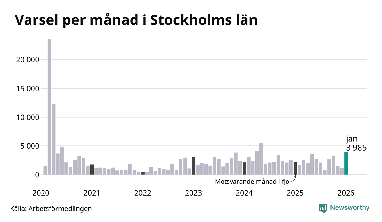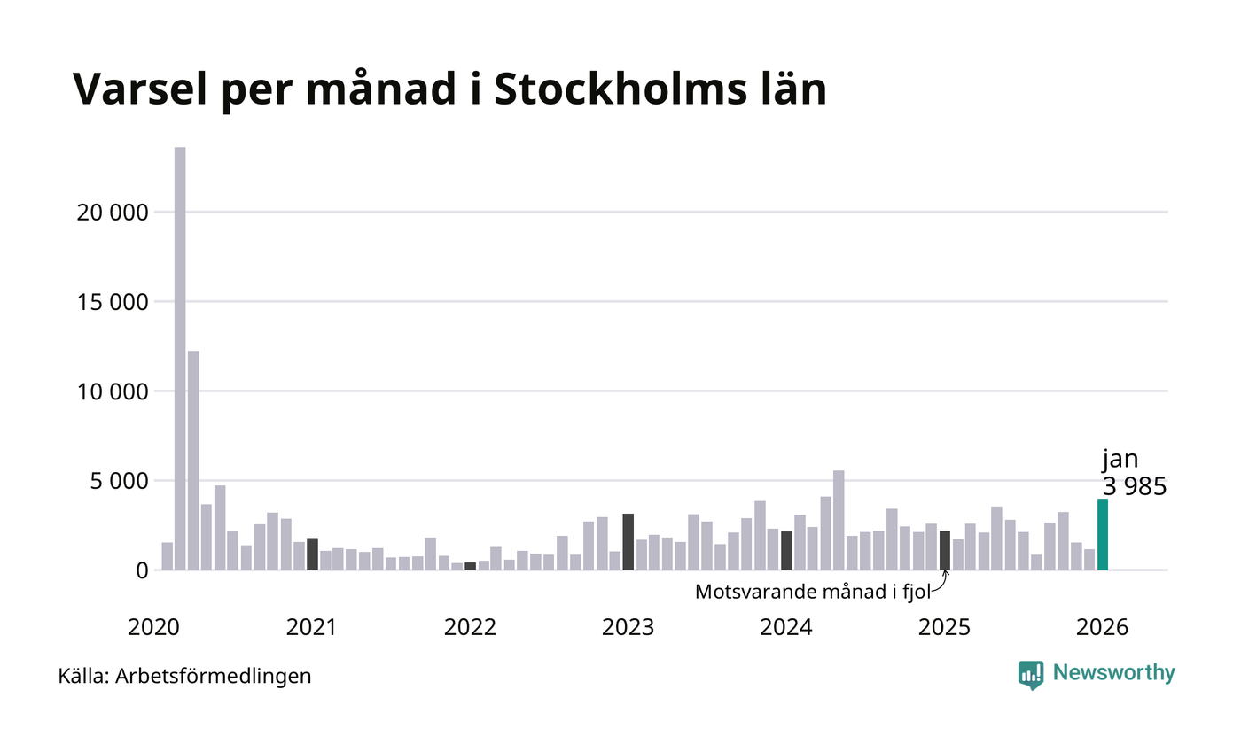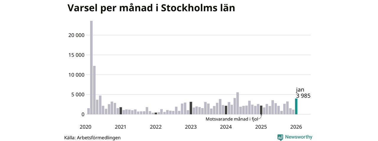 3 985 personer varslades om uppsägning i Stockholms län under januari 2026. Det är 2 833 fler än i december och den högsta siffran sedan maj 2024. Däremot är det fortfarande betydligt färre än i början av pandemin, i mars 2020, då 23 595 personer varslades i Stockholms län. Sett över de tre senaste månaderna har totalt 6 659 varsel rapporterats i Stockholms län, vilket är 255 färre än motsvarande period 2025.