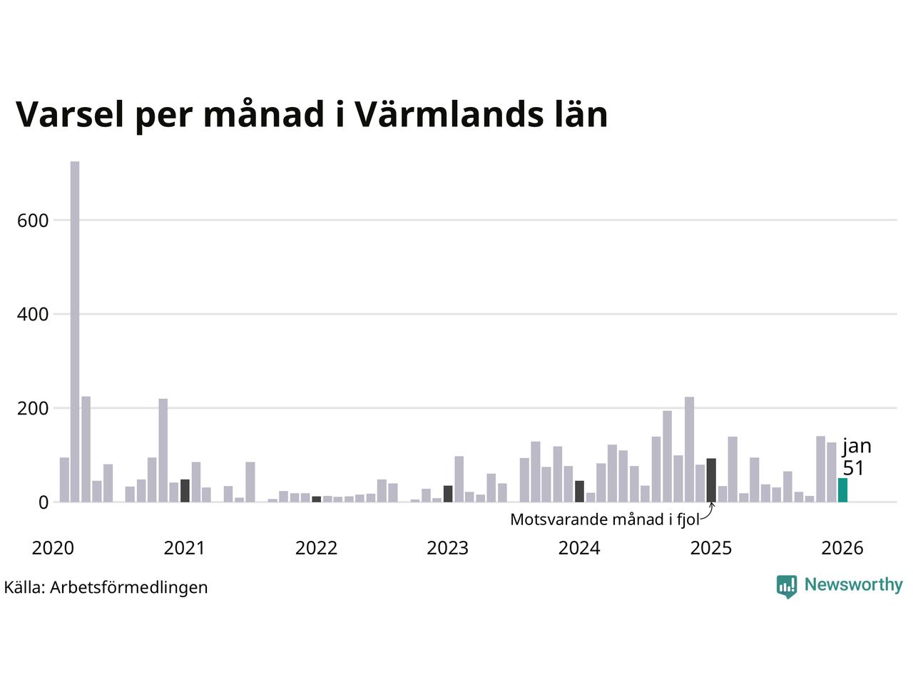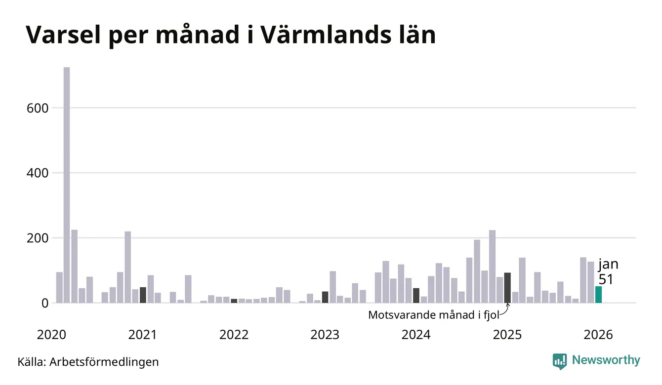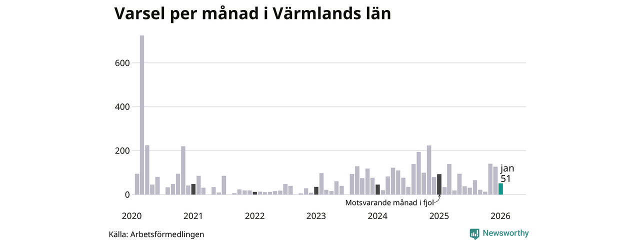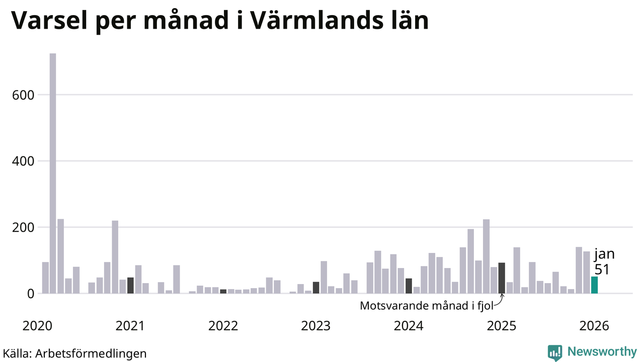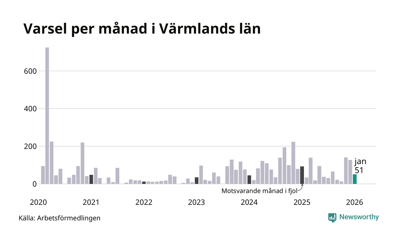 51 personer varslades om uppsägning i Värmland under januari 2026. Det är 76 färre än i december. För ett år sedan var antalet varsel 93 i länet. Sett över de tre senaste månaderna har totalt 318 varsel rapporterats i Värmland, vilket är 78 färre än motsvarande period 2025. I början av pandemin, i mars 2020, varslades som mest 724 personer under en månad i Värmland.