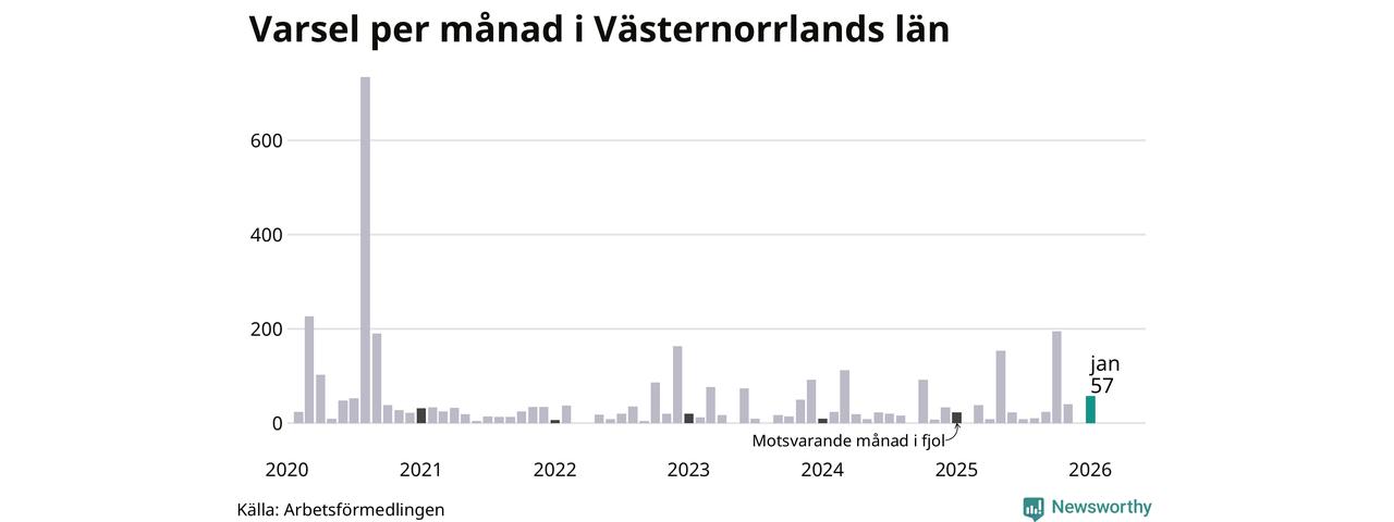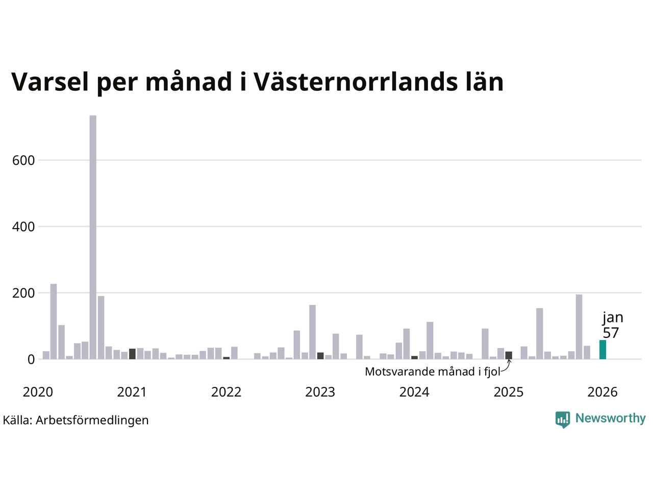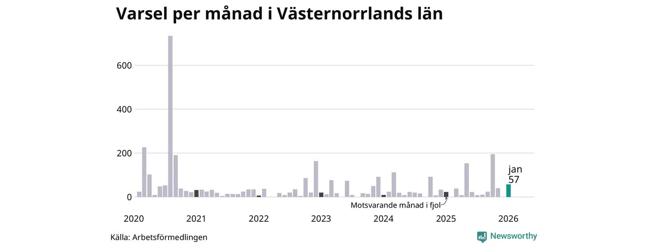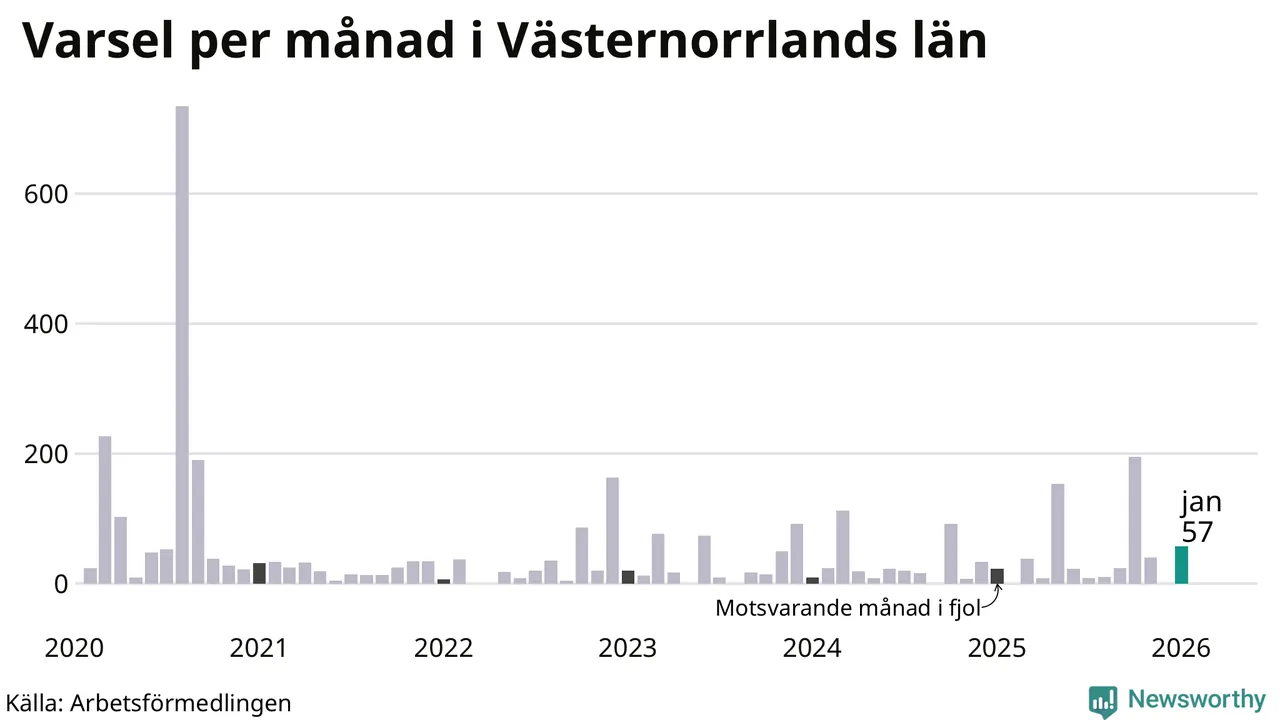57 personer varslades om uppsägning i Västernorrland under januari 2026. Det är 57 fler än i december. För ett år sedan var antalet varsel 23 i länet. Sett över de tre senaste månaderna har totalt 97 varsel rapporterats i Västernorrland, vilket är 34 fler än motsvarande period 2025. I början av pandemin, i augusti 2020, varslades som mest 734 personer under en månad i Västernorrland.