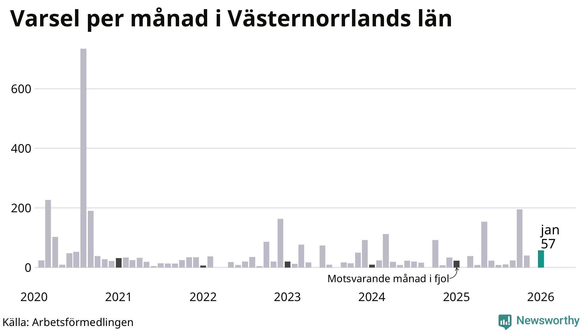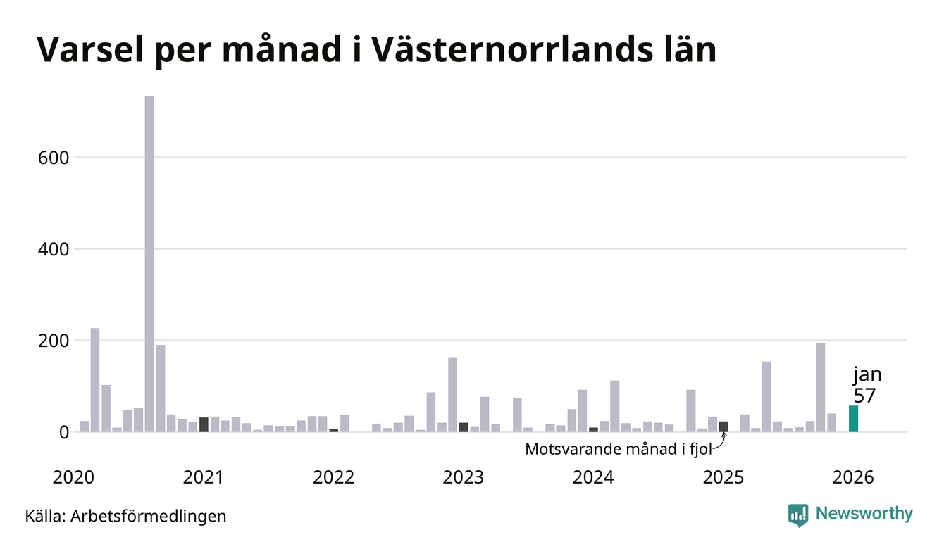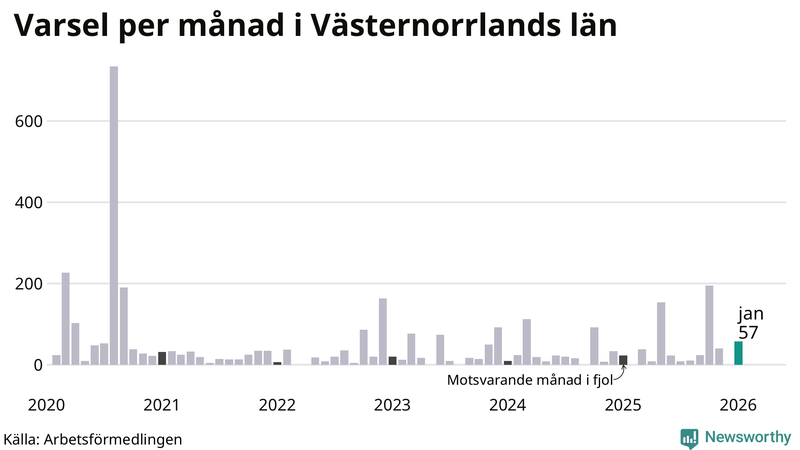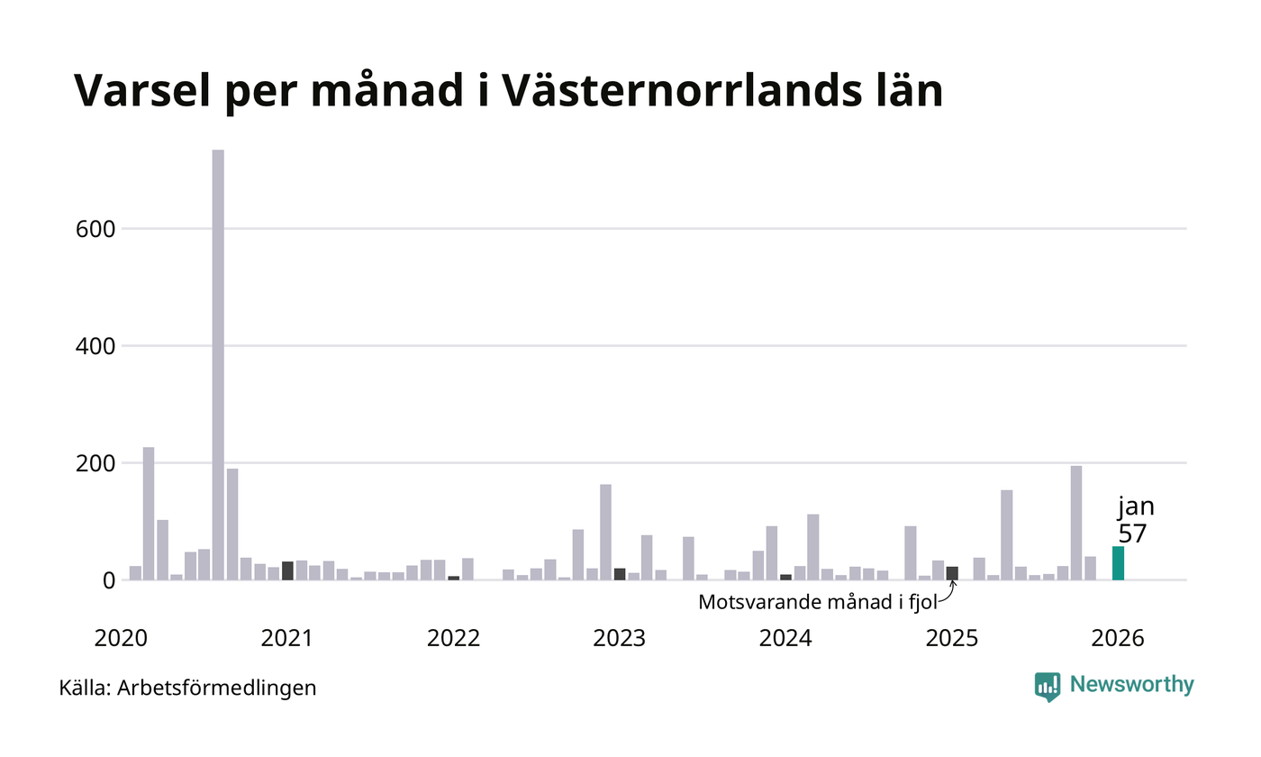 57 personer varslades om uppsägning i Västernorrland under januari 2026. Det är 57 fler än i december. För ett år sedan var antalet varsel 23 i länet. Sett över de tre senaste månaderna har totalt 97 varsel rapporterats i Västernorrland, vilket är 34 fler än motsvarande period 2025. I början av pandemin, i augusti 2020, varslades som mest 734 personer under en månad i Västernorrland.