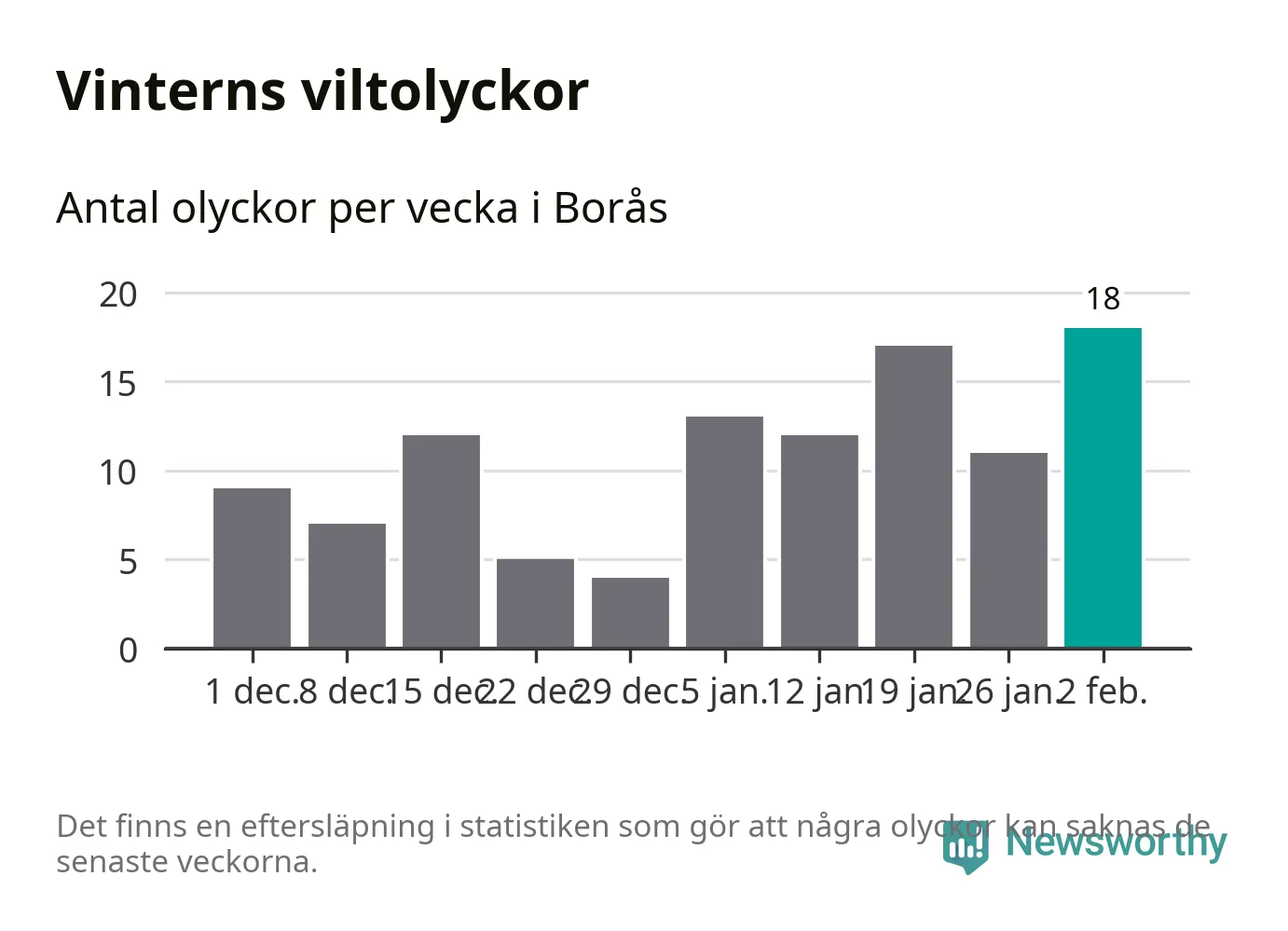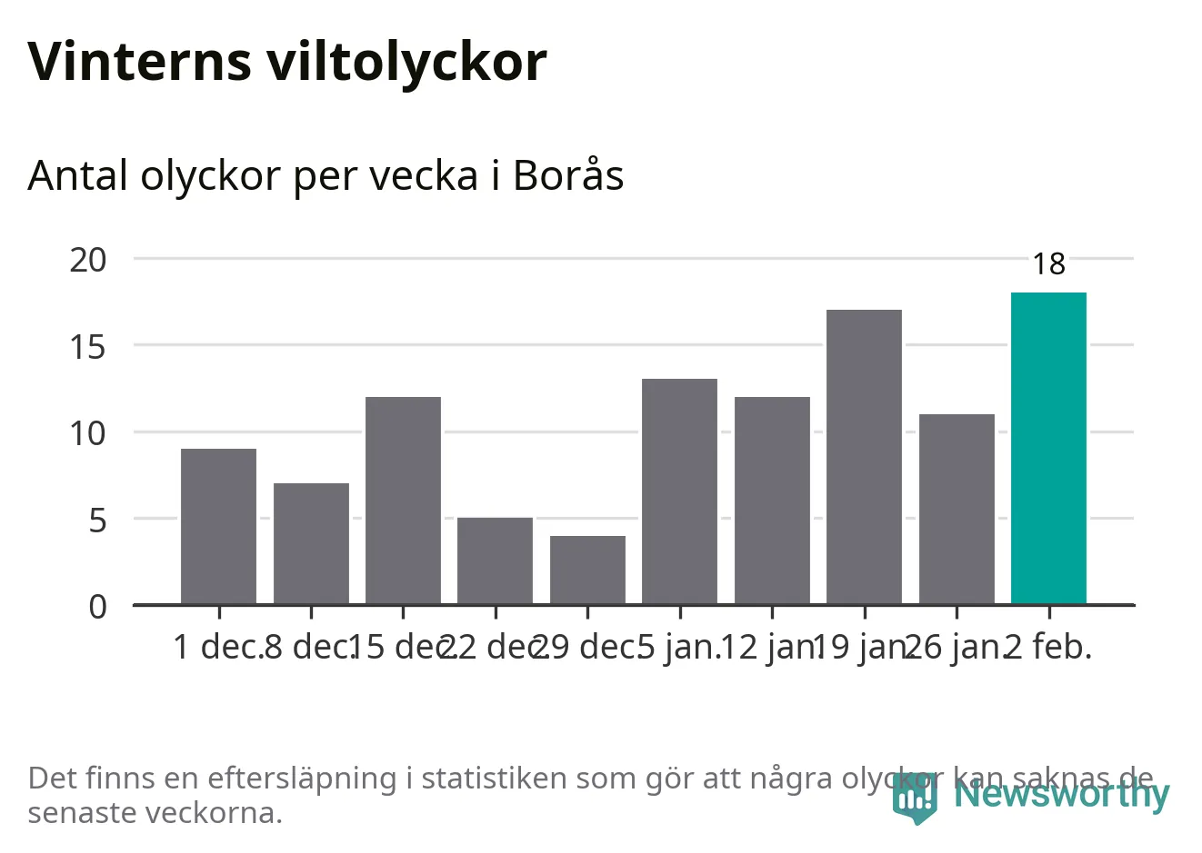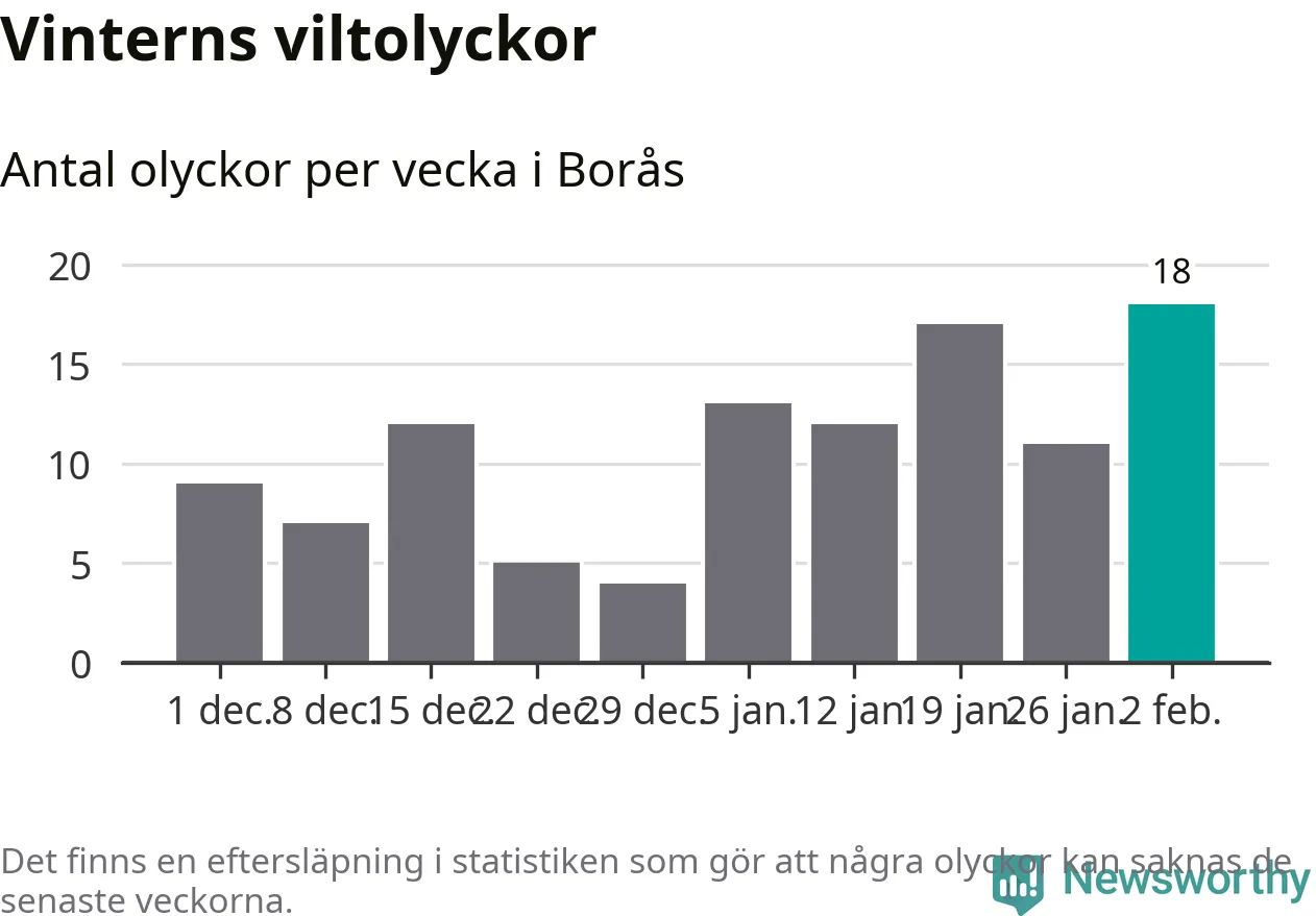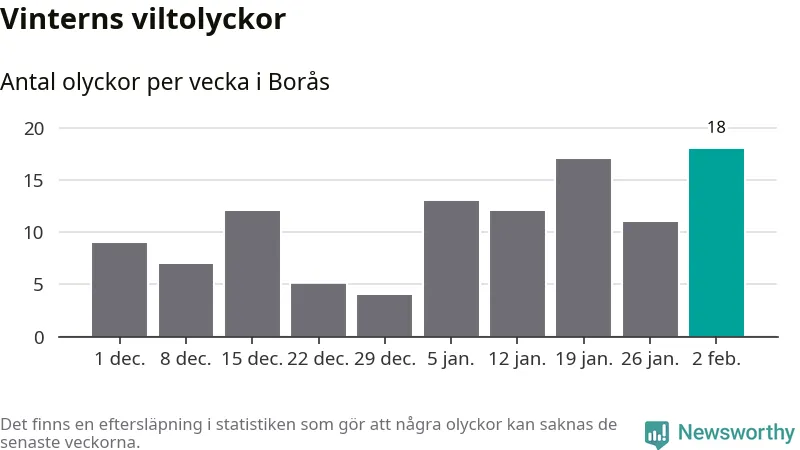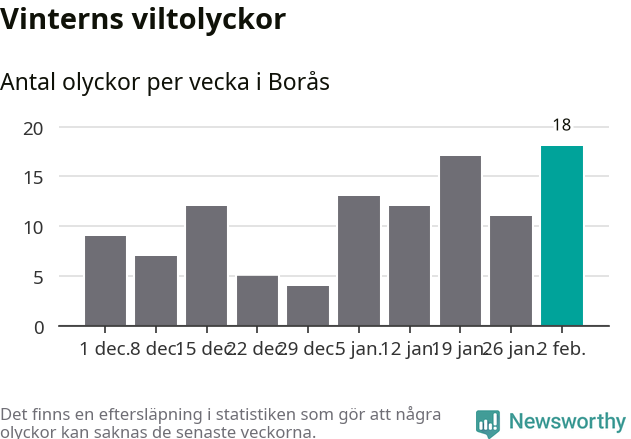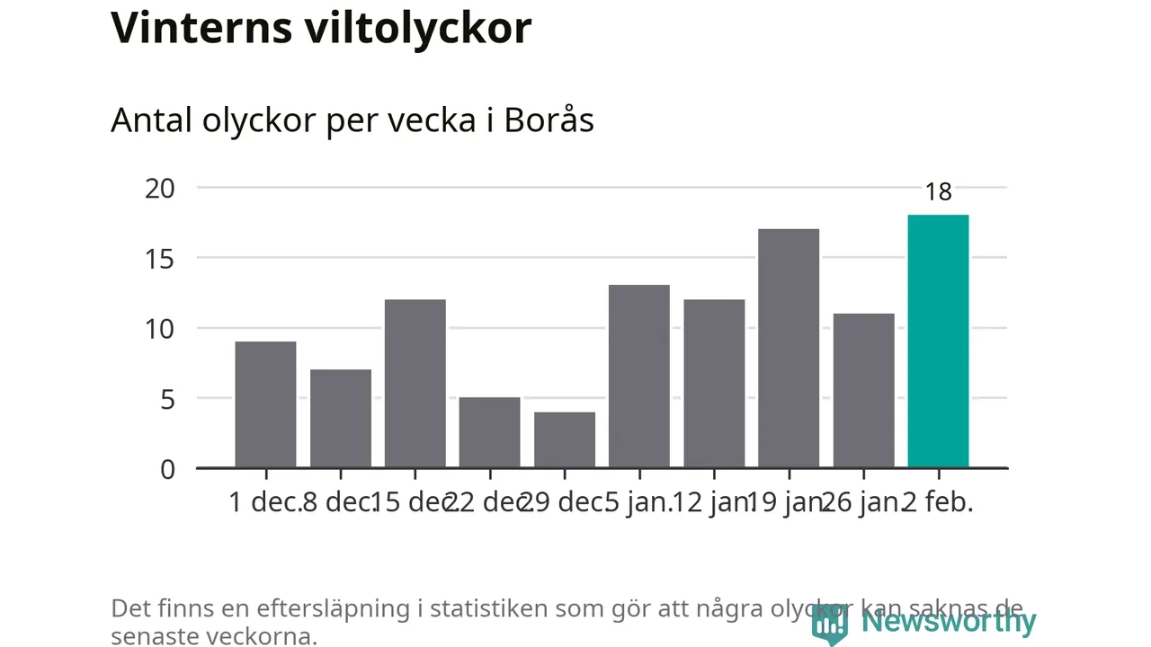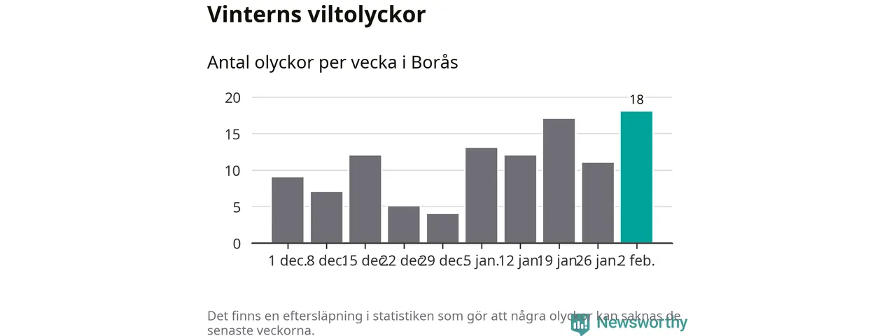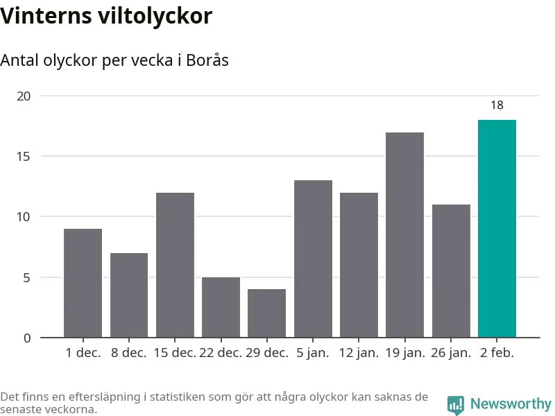 Under vecka 6 rapporterades 18 viltolyckor in i Borås kommun. Det är det största antalet på en vecka den här vintern.