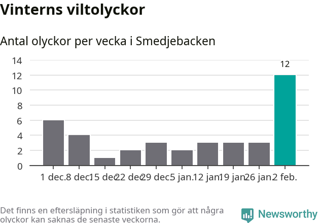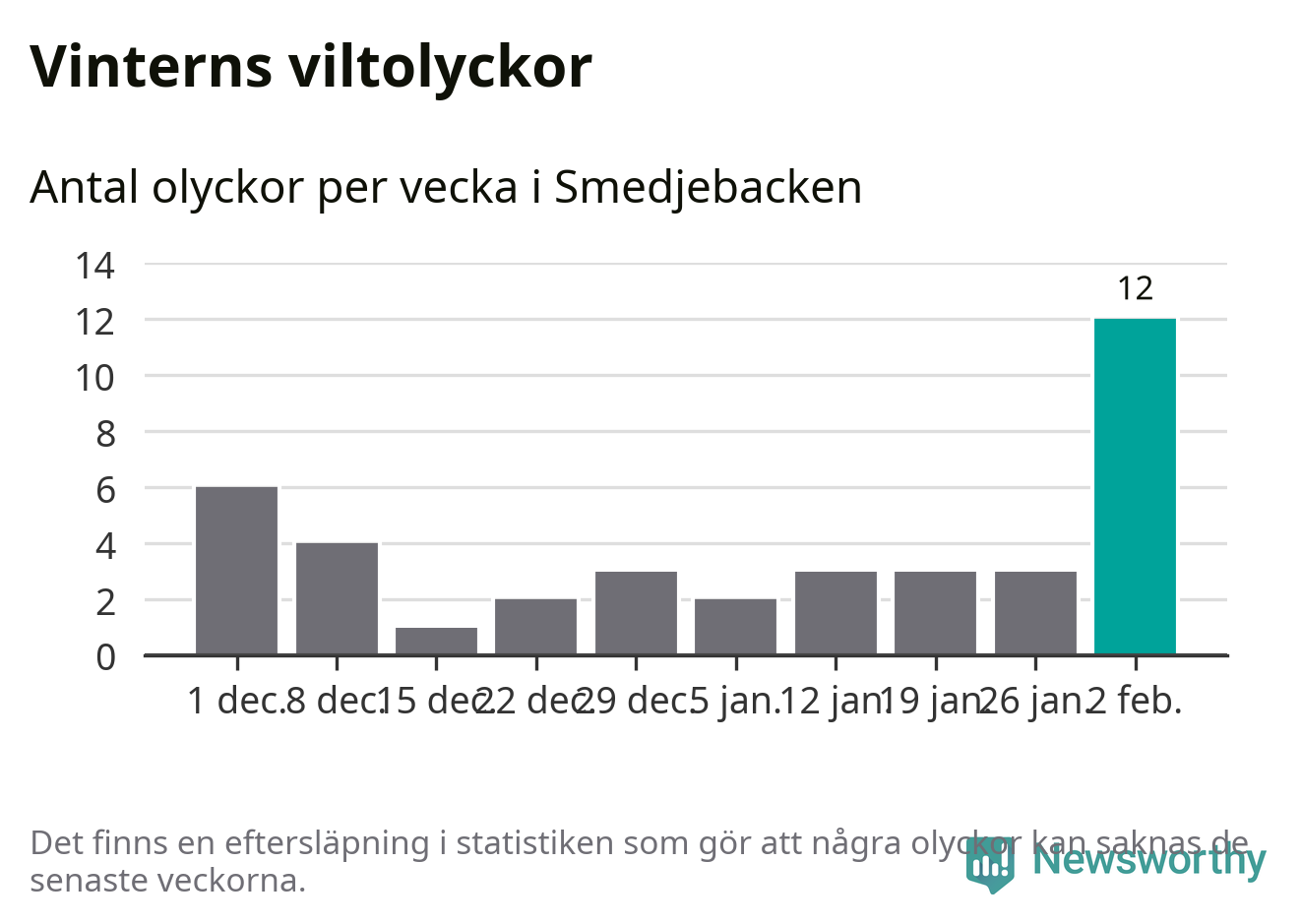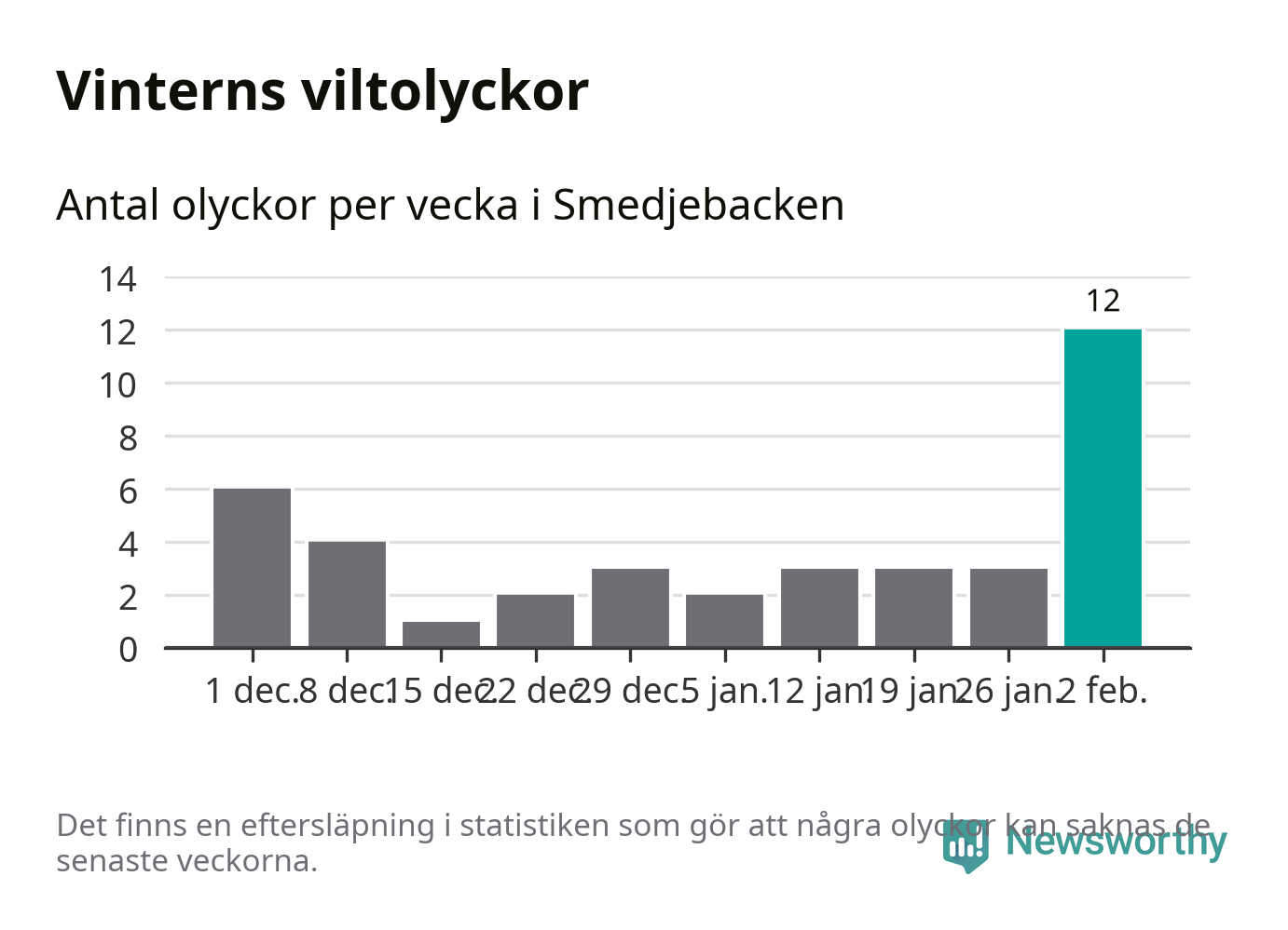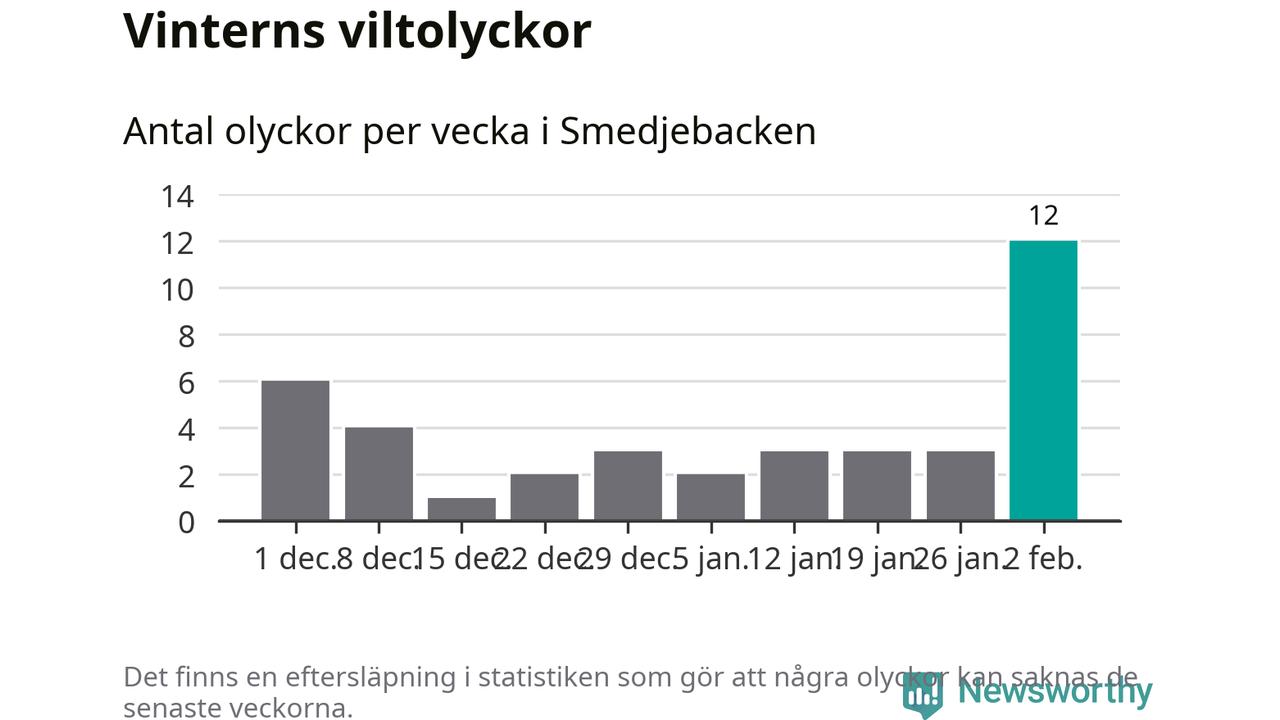 Hittills har tolv viltolyckor rapporterats in i Smedjebackens kommun från vecka 6. Det är en av de högsta vintersiffrorna för en enskild vecka på över tio år.