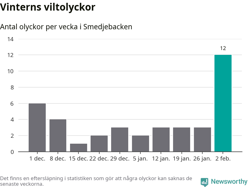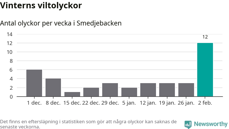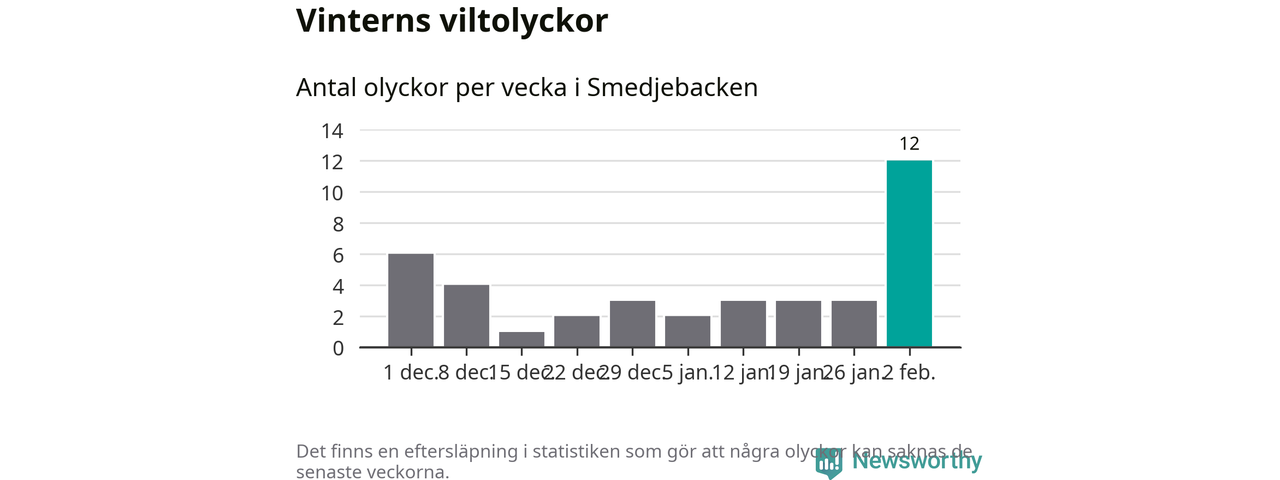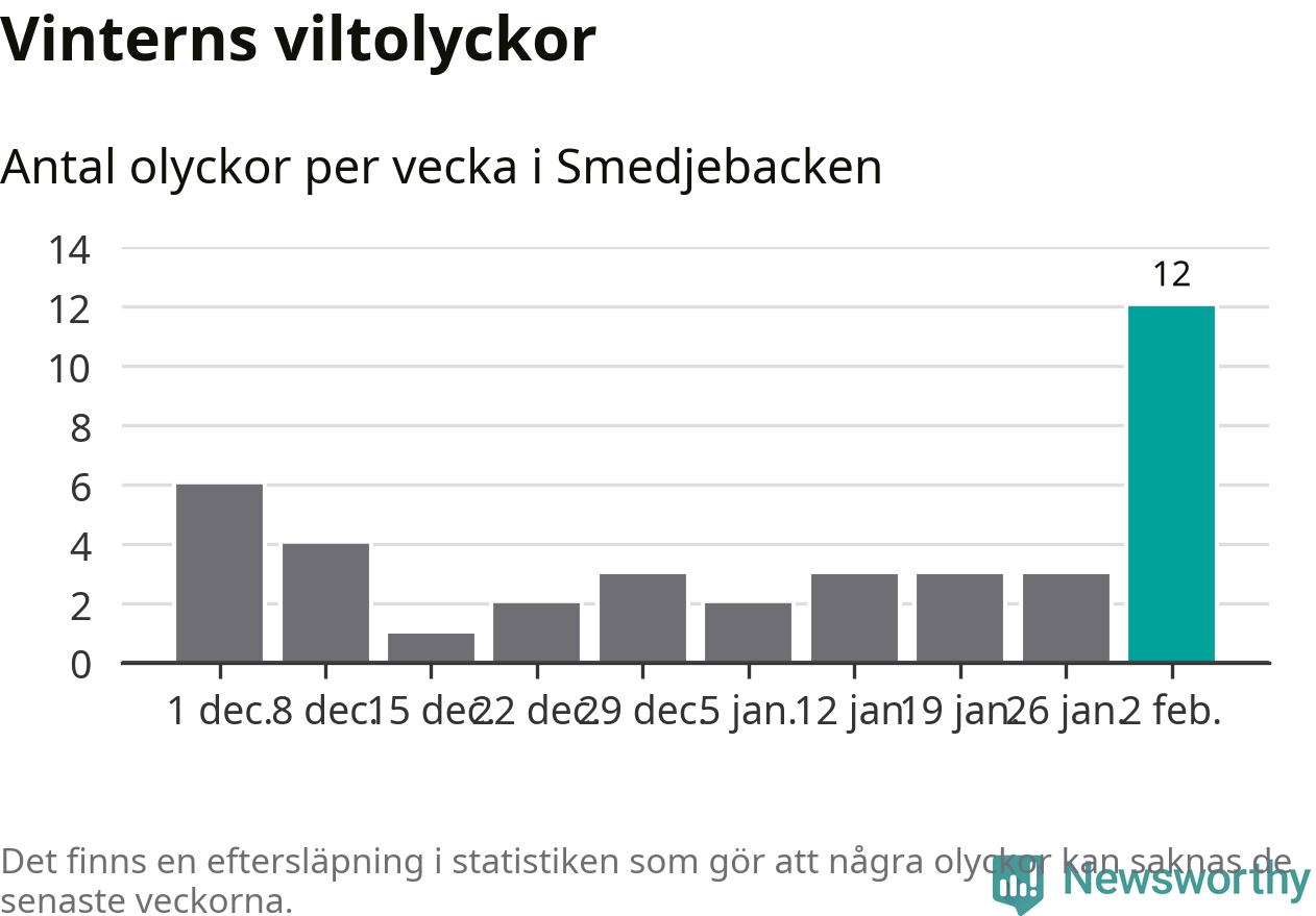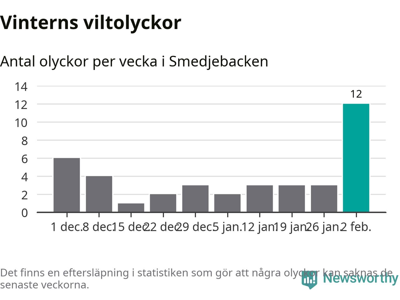 Hittills har tolv viltolyckor rapporterats in i Smedjebackens kommun från vecka 6. Det är en av de högsta vintersiffrorna för en enskild vecka på över tio år.