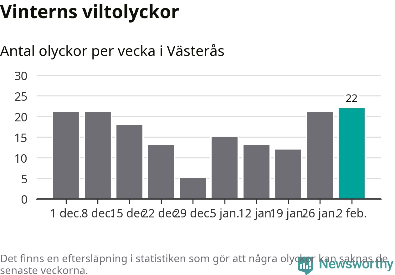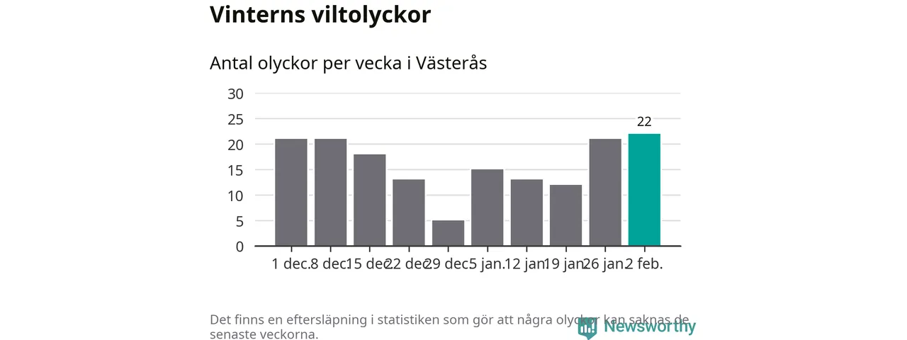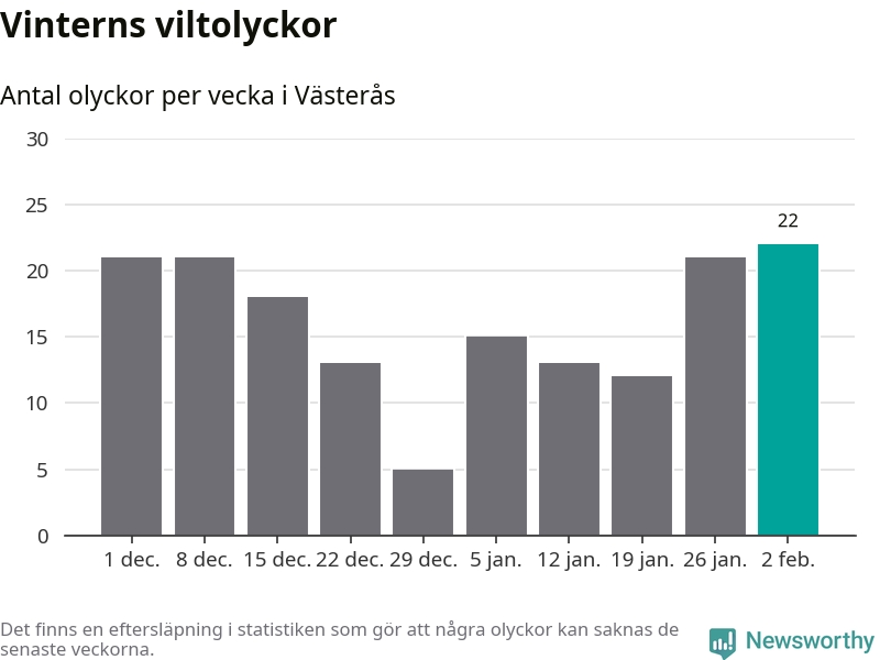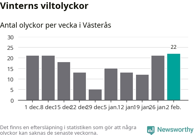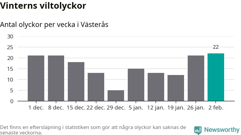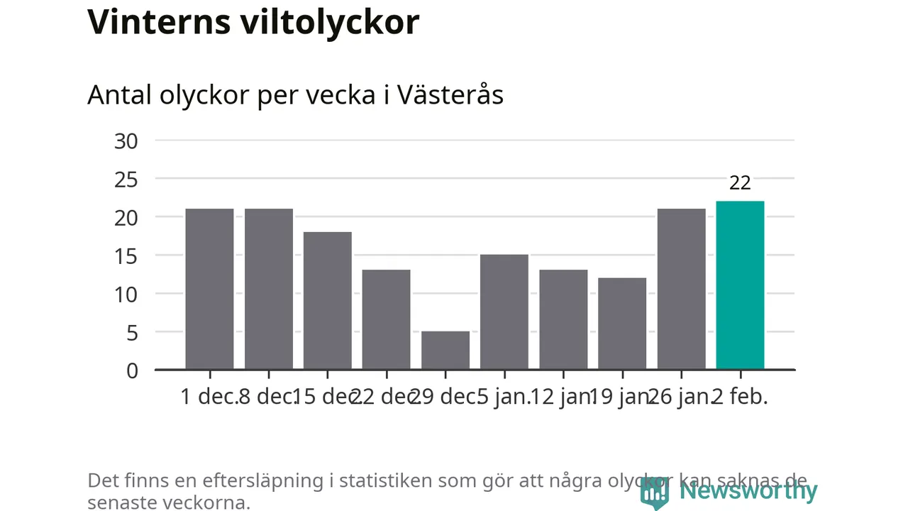 Under vecka 6 rapporterades 22 viltolyckor in i Västerås kommun. Det är det största antalet på en vecka den här vintern.