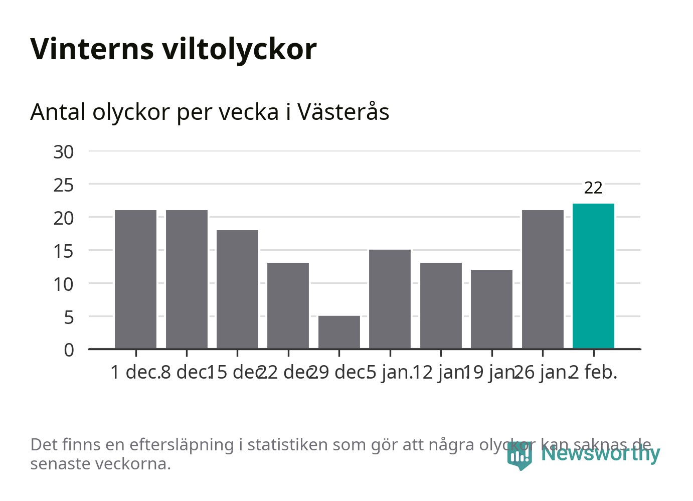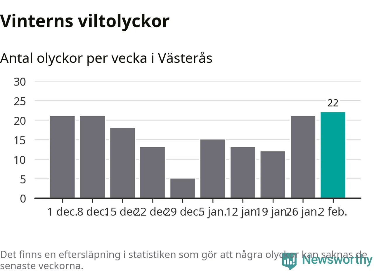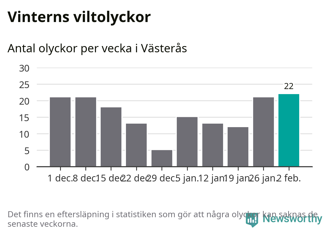 Under vecka 6 rapporterades 22 viltolyckor in i Västerås kommun. Det är det största antalet på en vecka den här vintern.