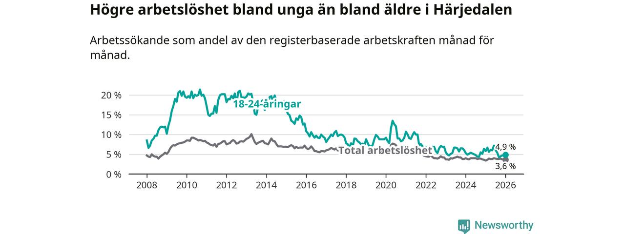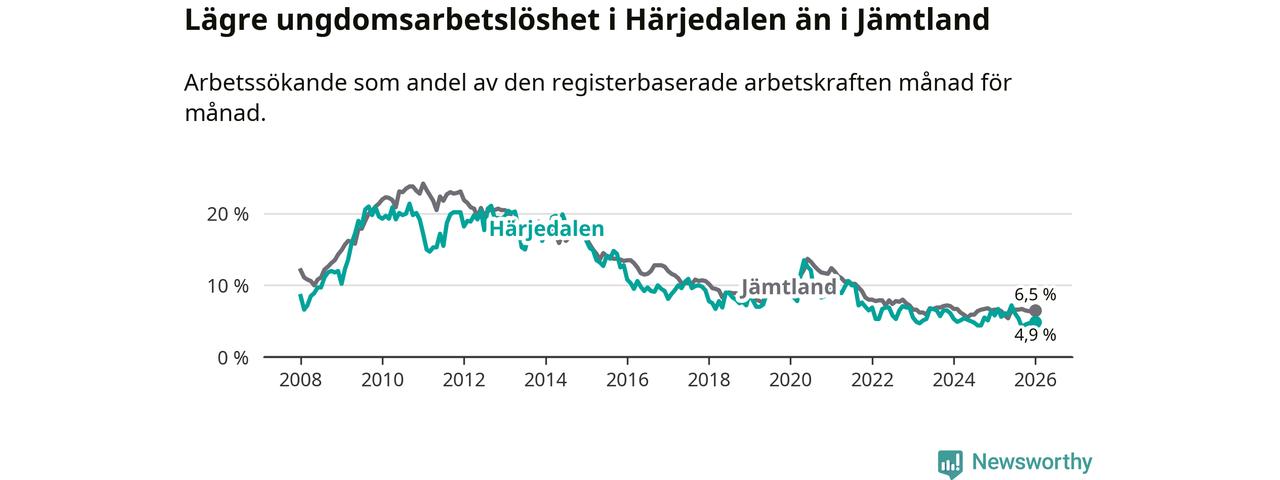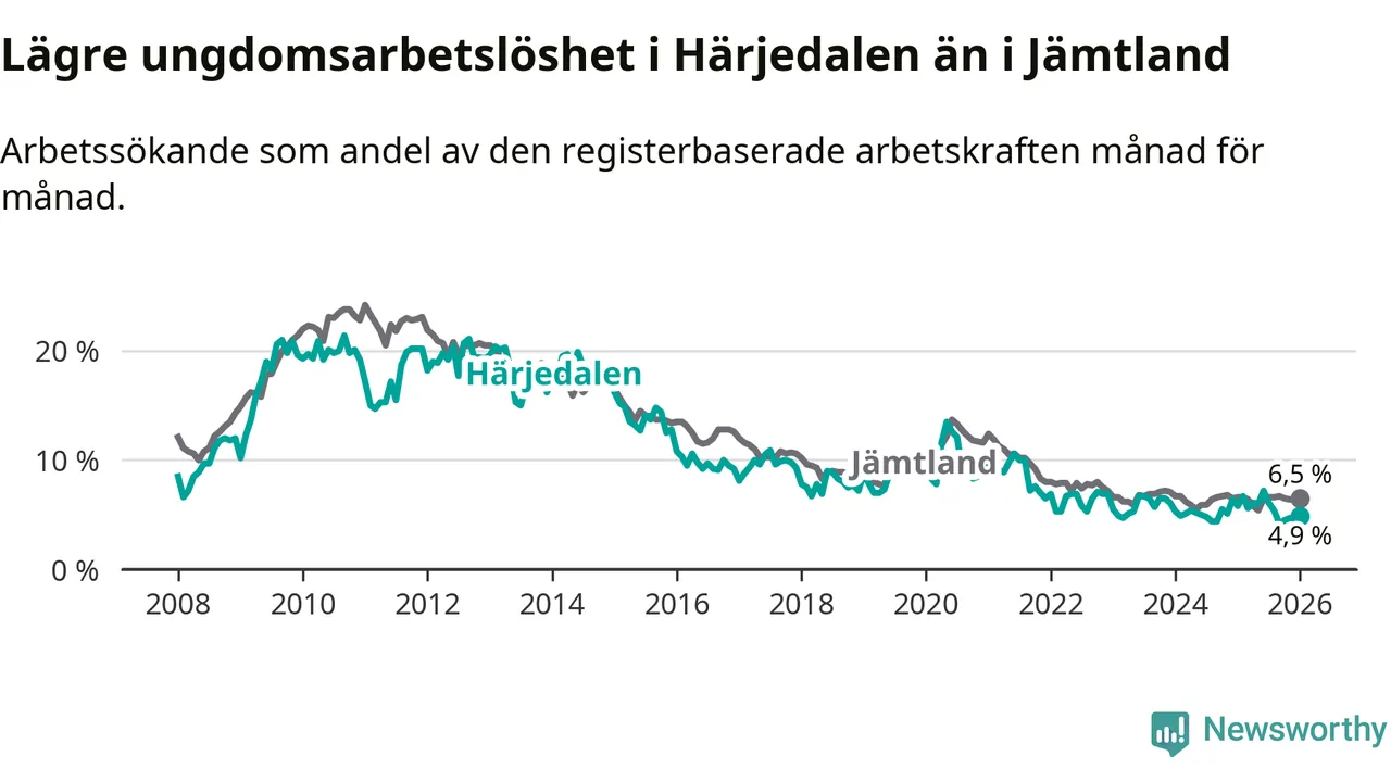 Precis som den totala arbetslösheten ligger ungdomsarbetslösheten i Härjedalen lägre än i Jämtland som helhet. Skillnaden mellan kommunen och länet är 1,6 procentenheter.