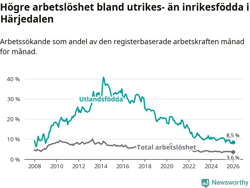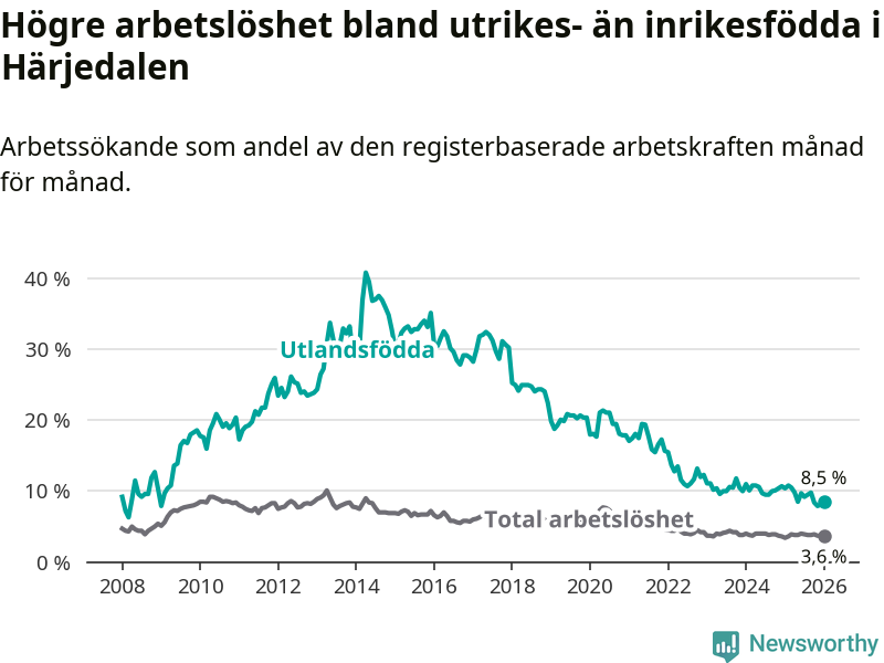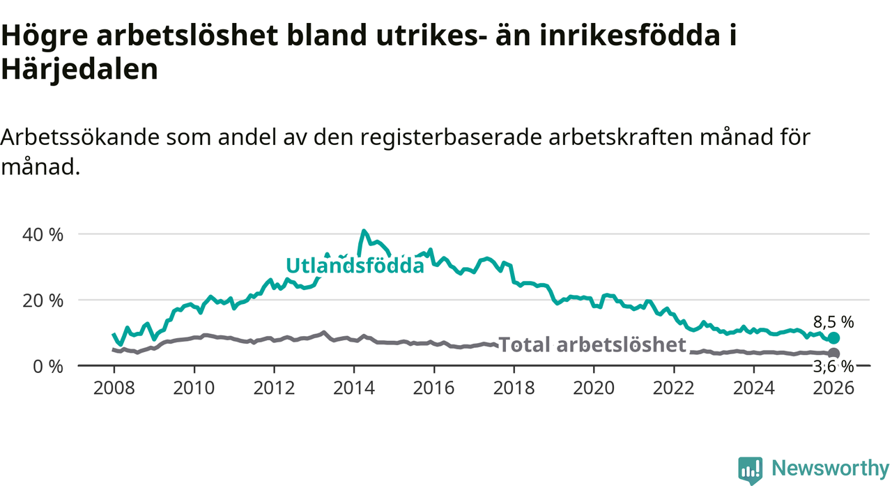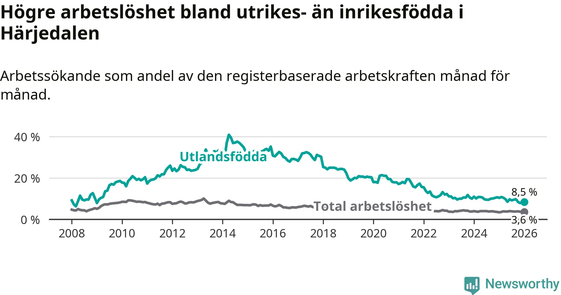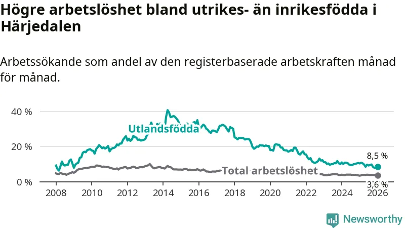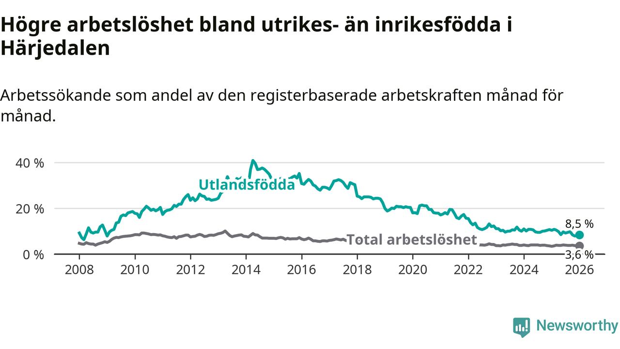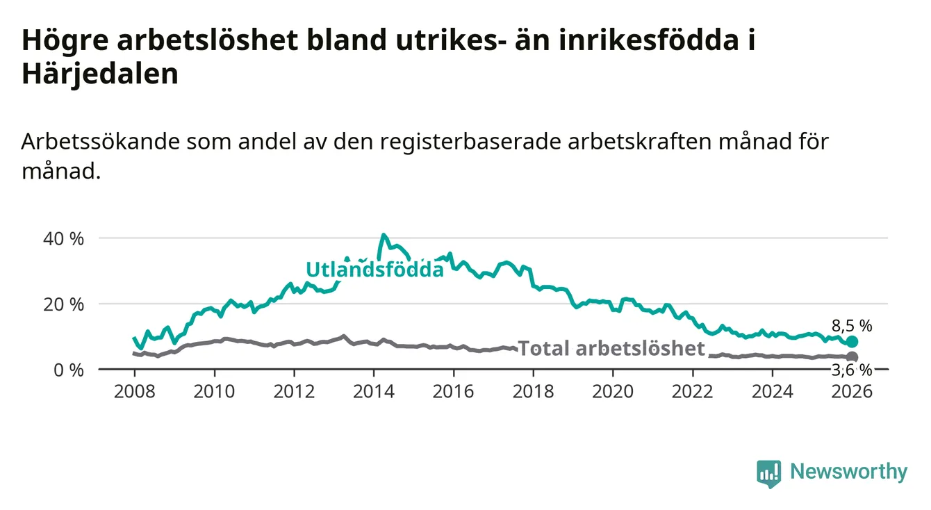 Arbetslösheten bland utlandsfödda var 8,5 procent i Härjedalen under januari månad, motsvarande 53 av 624 personer. Det är 1,9 procentenheter färre än vid samma tidpunkt i fjol (−11 om man räknar personer).