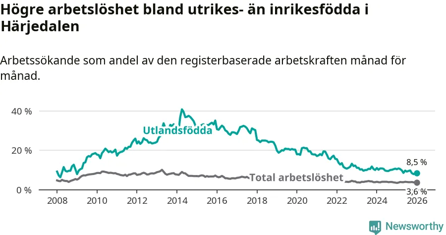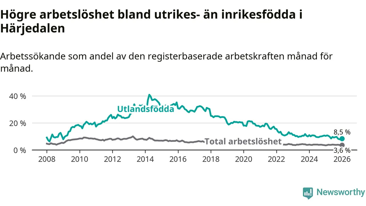 Skillnaden i arbetslöshet mellan utrikesfödda och hela befolkningen är 4,9 procentenheter i Härjedalen. Det är en betydligt mindre skillnad än för ett år sedan (−2,1 procentenheter).
