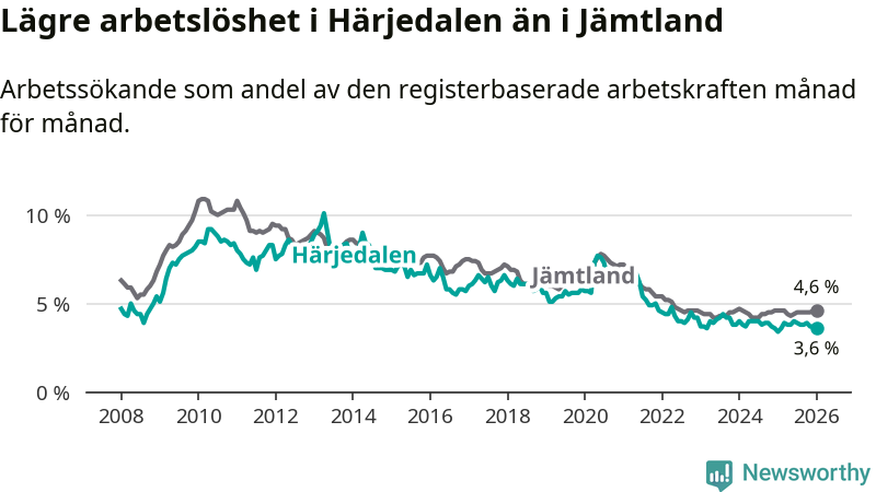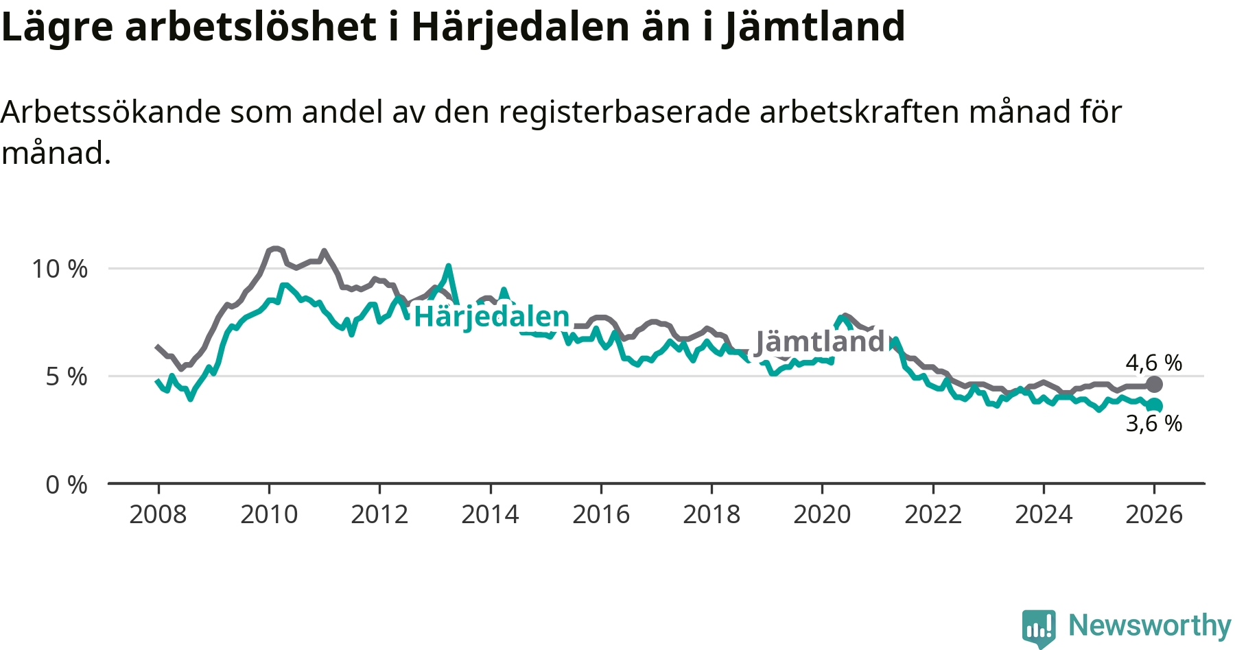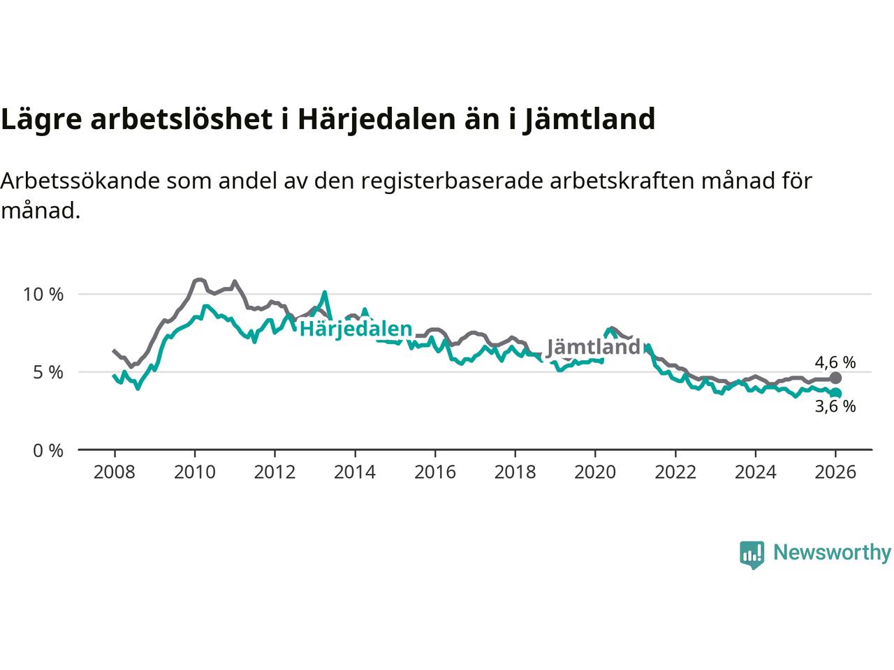 i hela Jämtlands län (3,6 procent i kommunen, jämfört med 4,6 procent i hela länet). Krokom har den lägsta arbetslösheten i länet (3,2 procent), medan Strömsund har den högsta (6,4 procent). För att Härjedalen skulle komma ner i samma arbetslöshetsnivå som Krokom skulle 19 personer behöva sysselsättas.