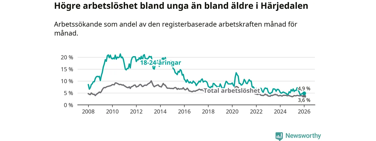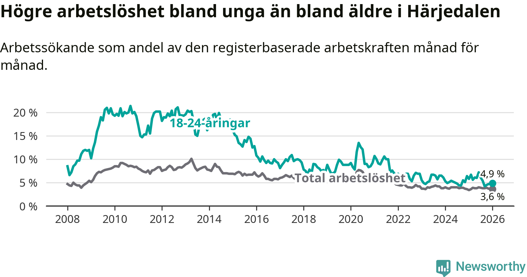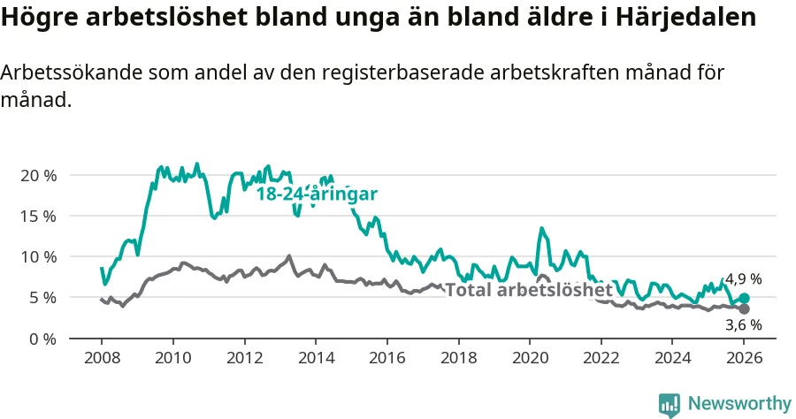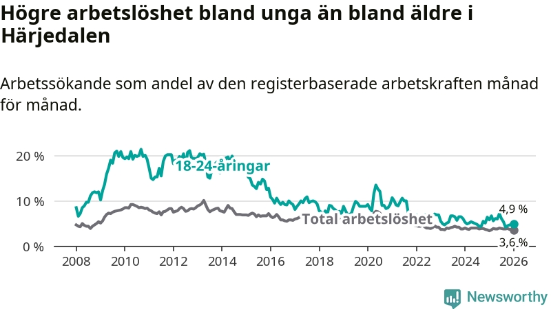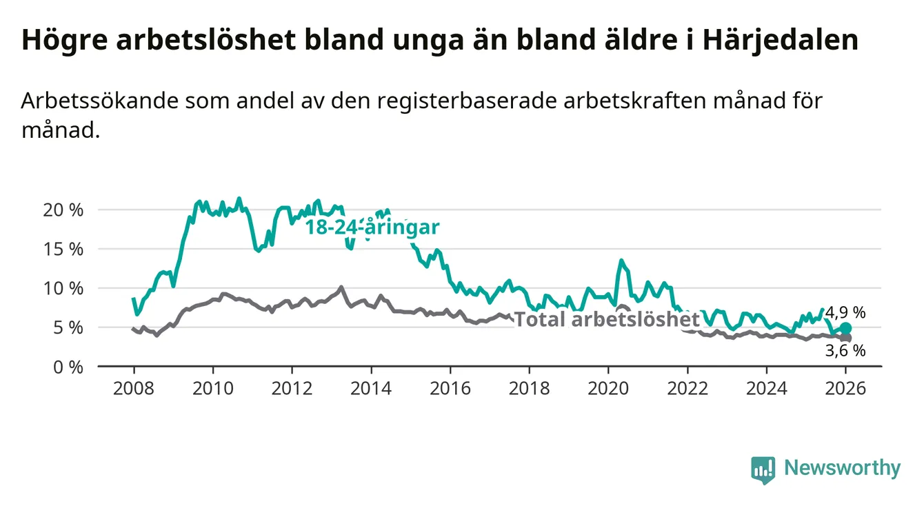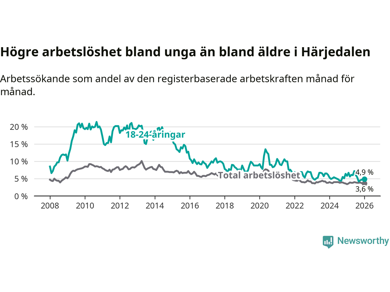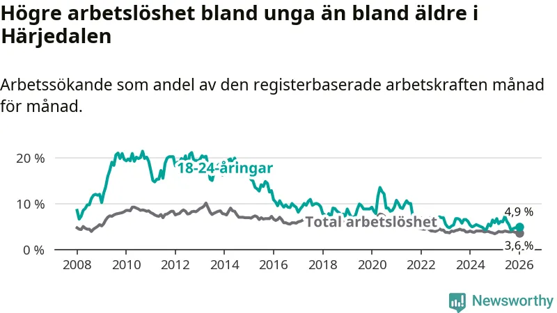 I januari var 4,9 procent av 18–24-åringarna inskrivna som arbetssökande (motsvarande 22 personer). Mäter vi antalet inskrivna ser vi en minskning med fyra personer på ett års sikt.
