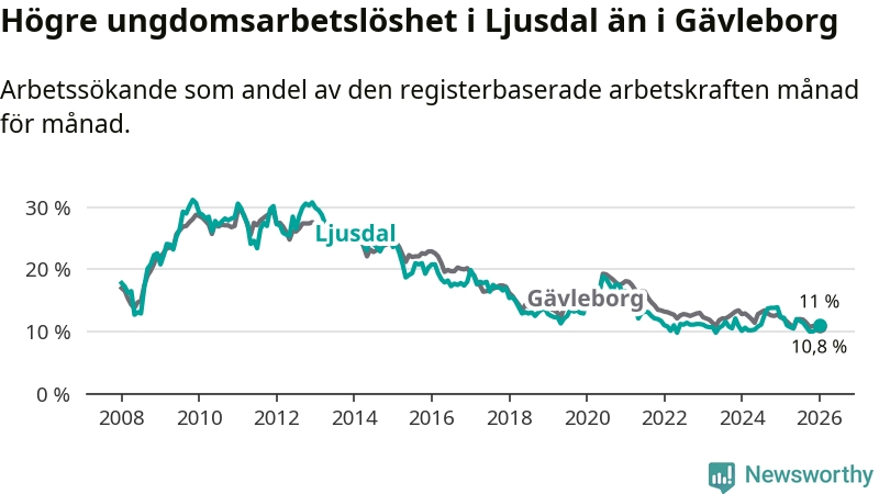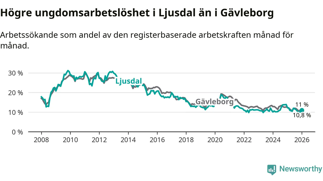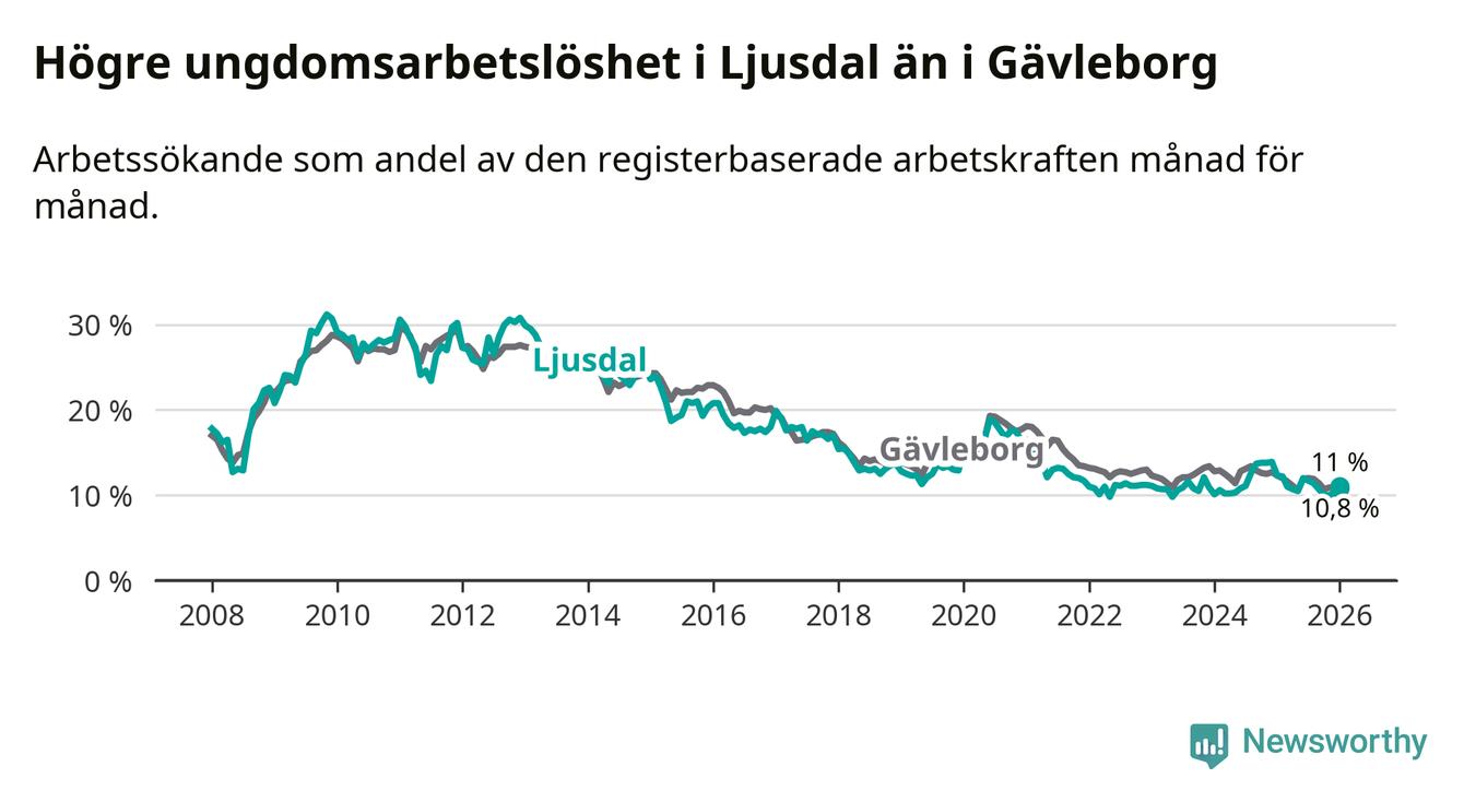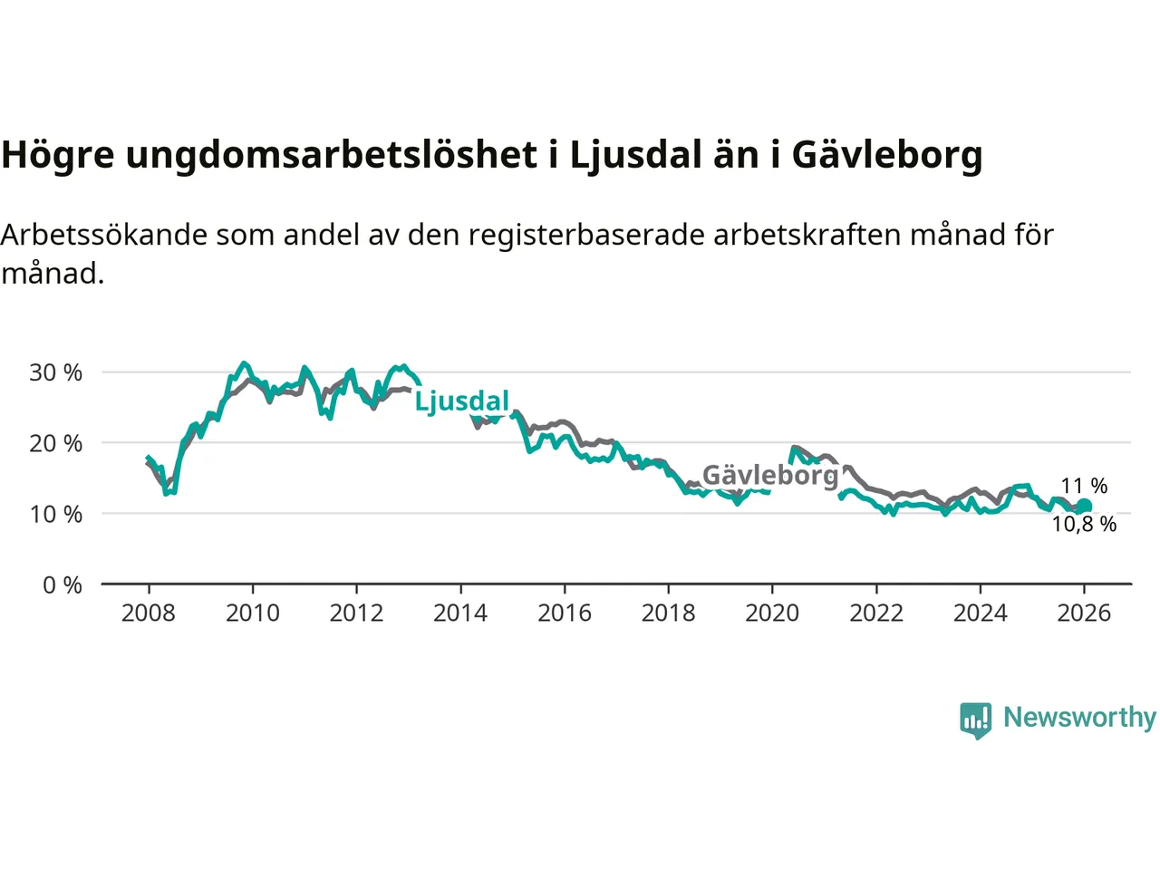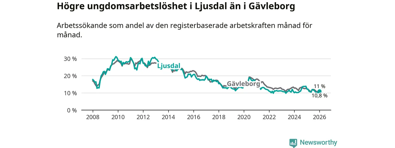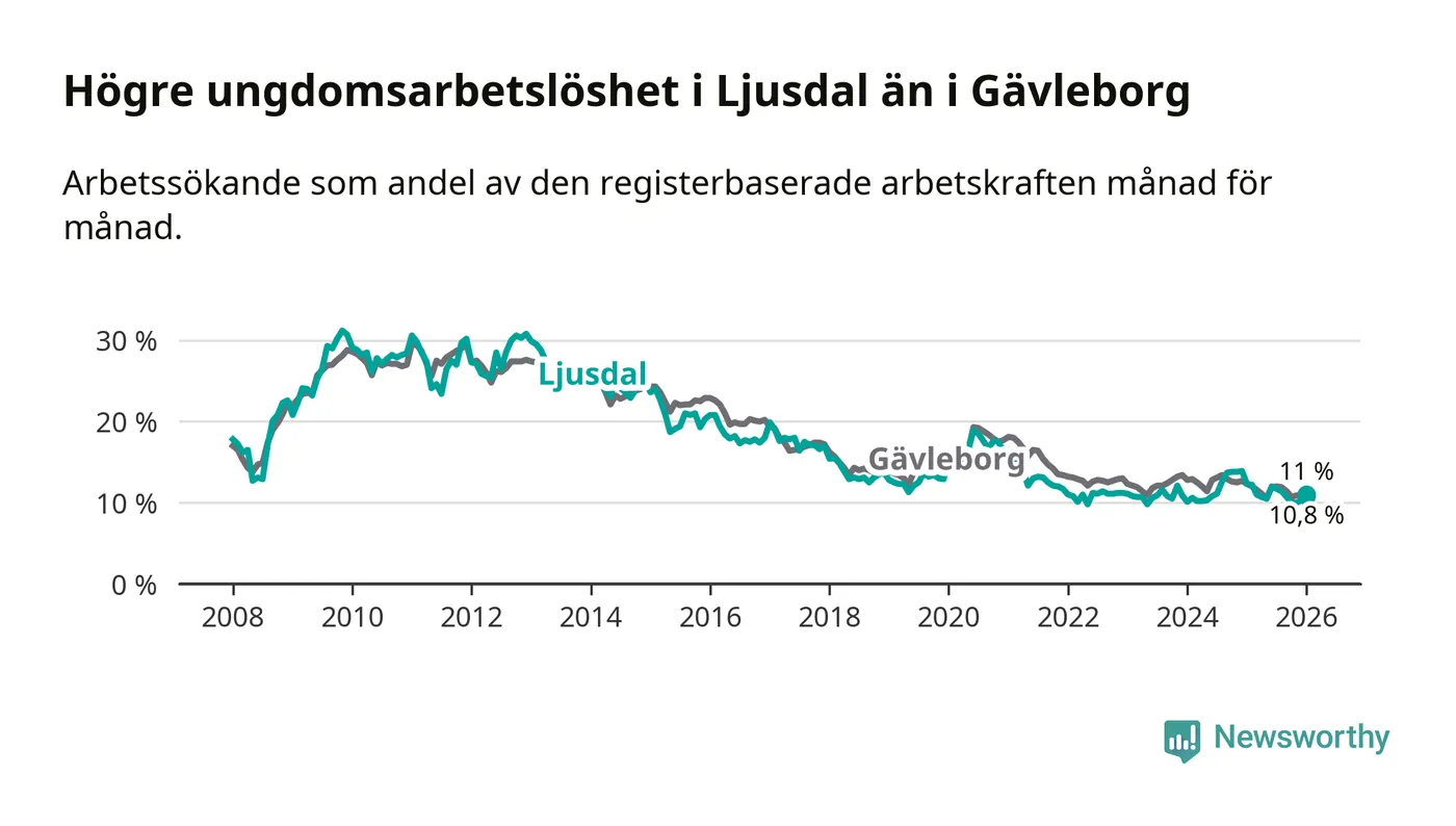 Medan Ljusdal har lägre total arbetslöshet än Gävleborg, ligger ungdomsarbetslösheten 0,2 procentenheter högre i Ljusdal.