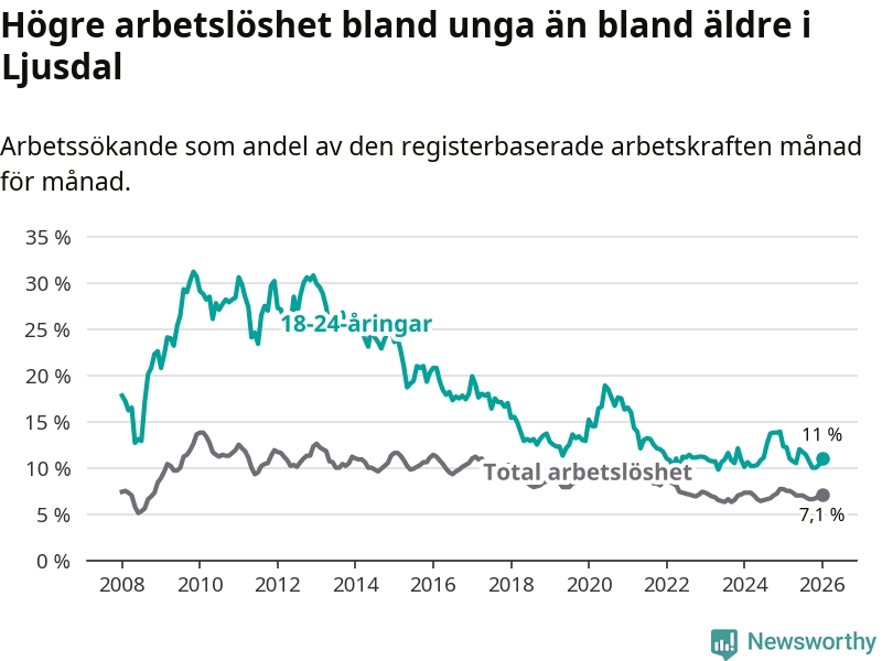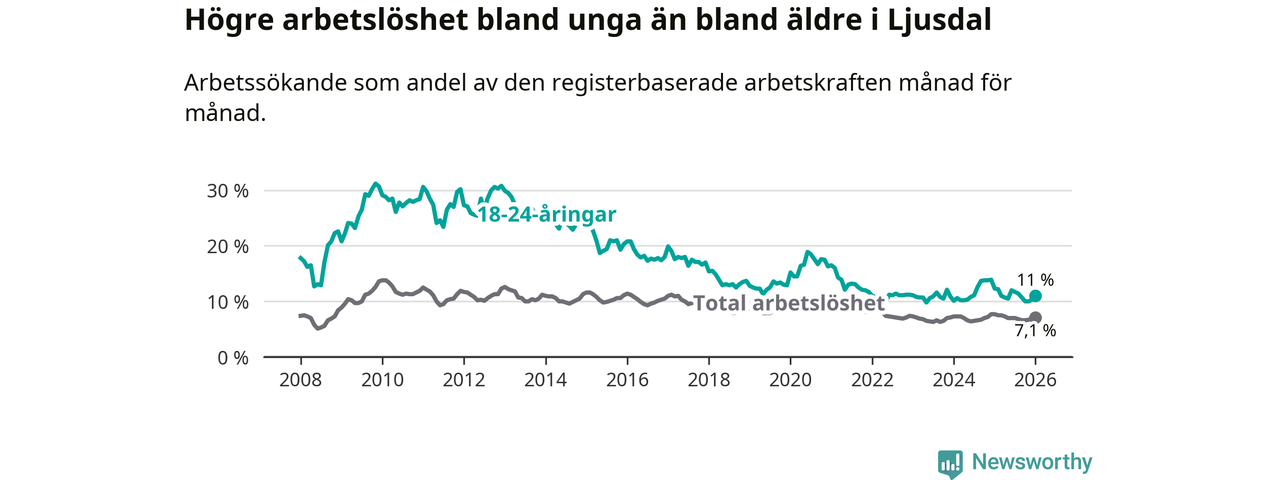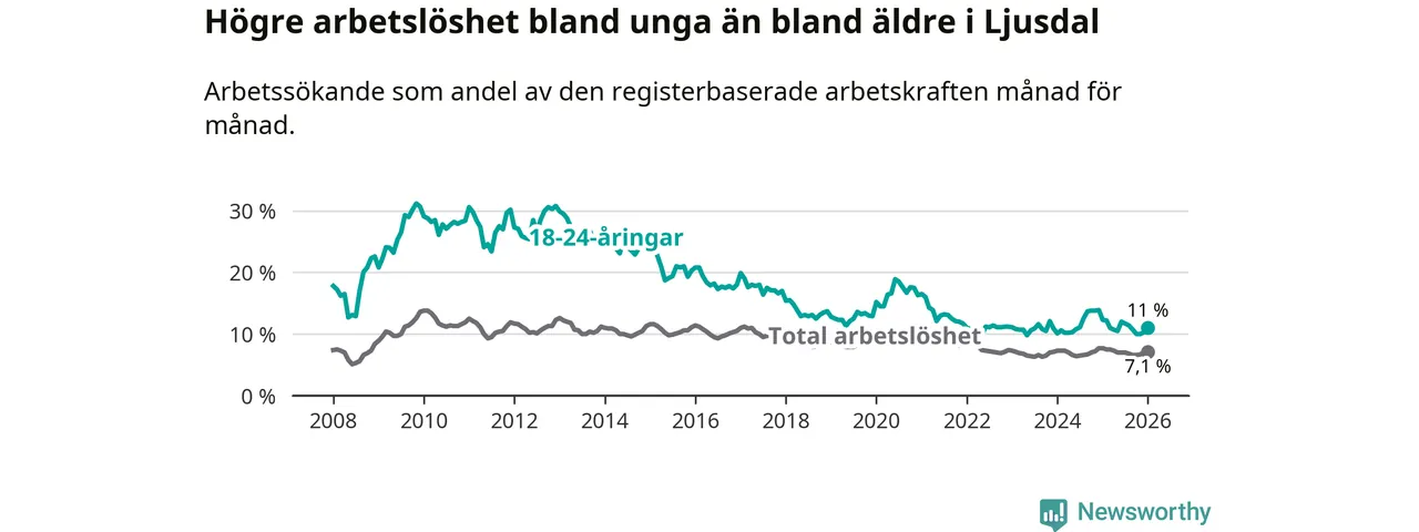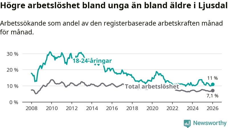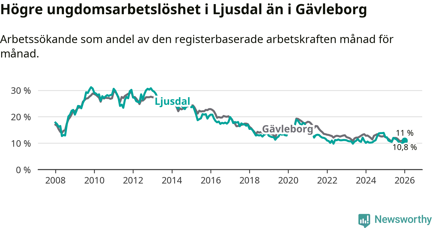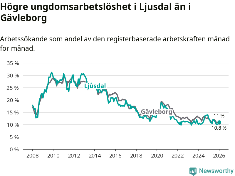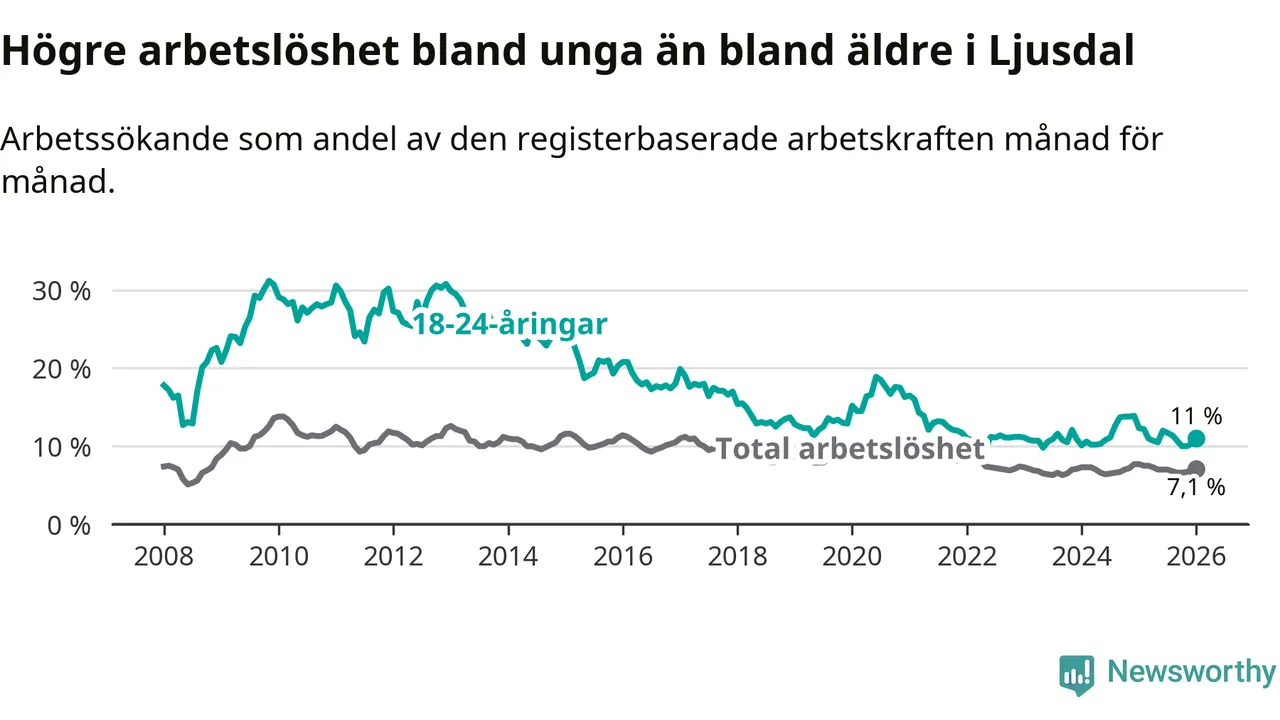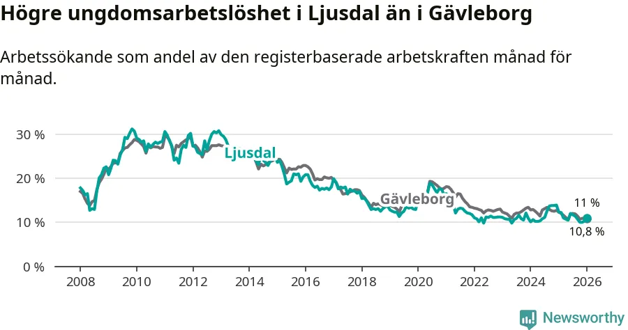 Medan Ljusdal har lägre total arbetslöshet än Gävleborg, ligger ungdomsarbetslösheten 0,2 procentenheter högre i Ljusdal.