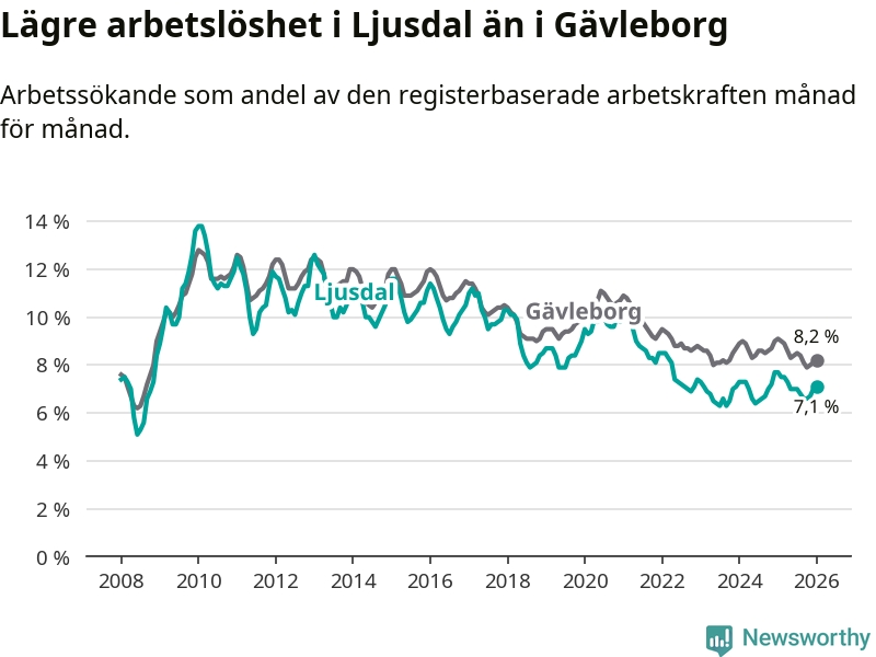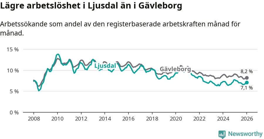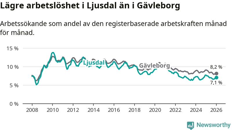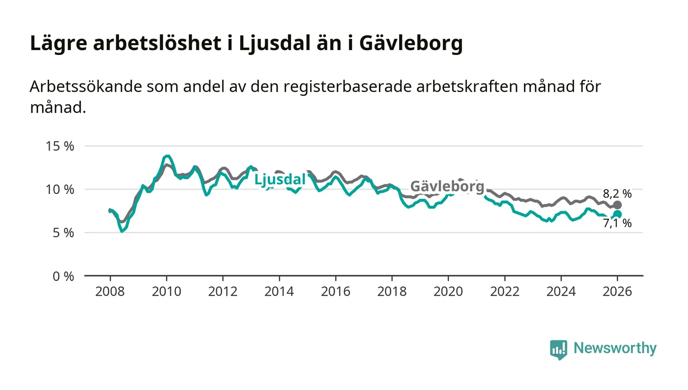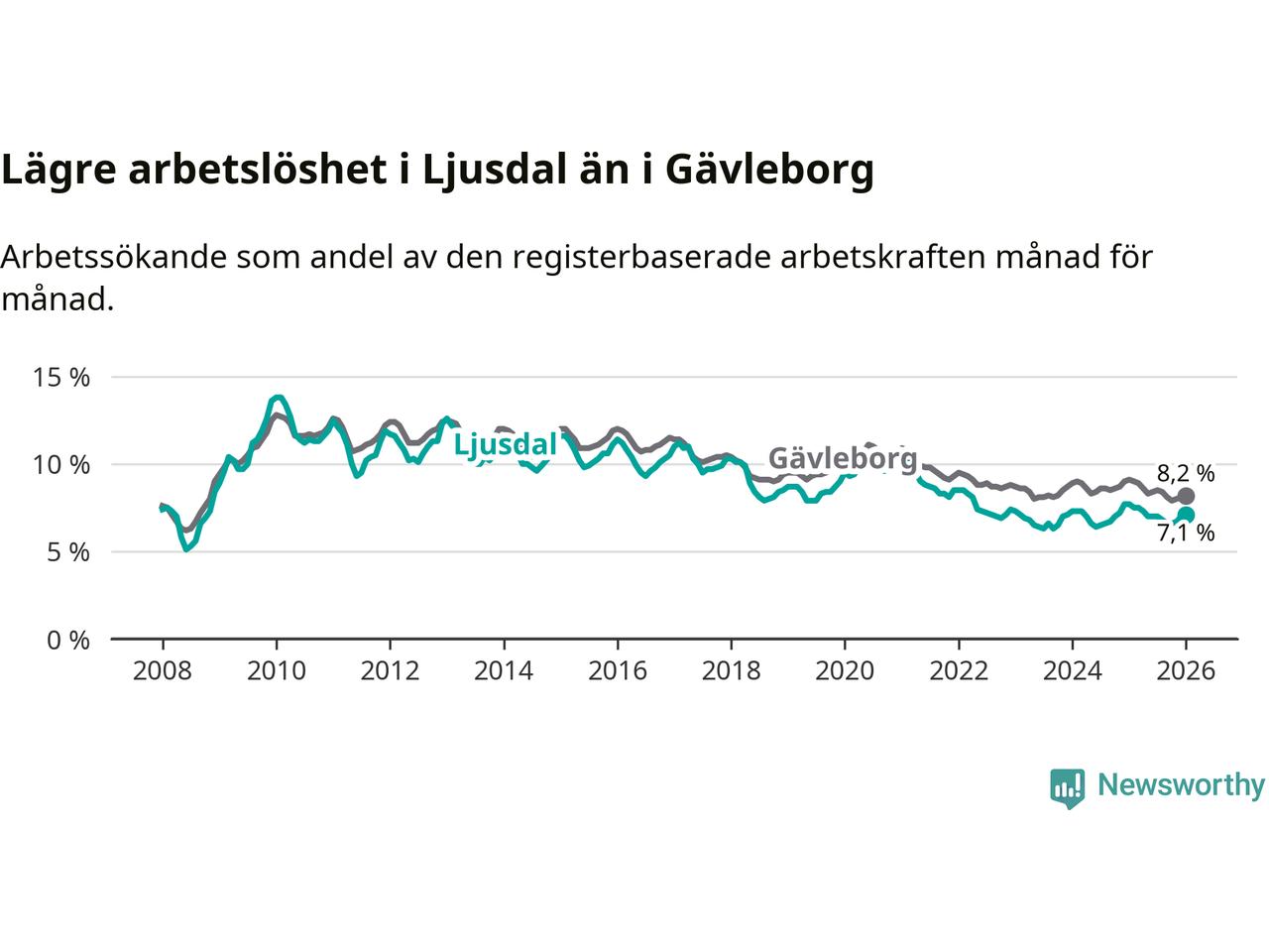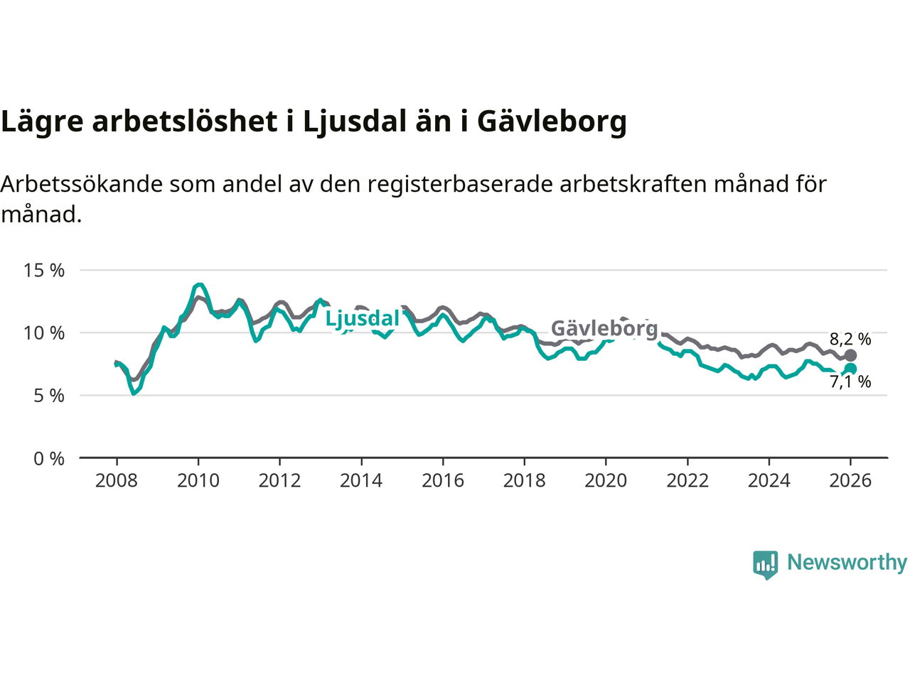 Anmärkningsvärt är att arbetslösheten nu, för första gången sedan april 2021, är högre i Ljusdal än snittet i Gävleborg, även om skillnaden bara är 0,1 procentenheter.