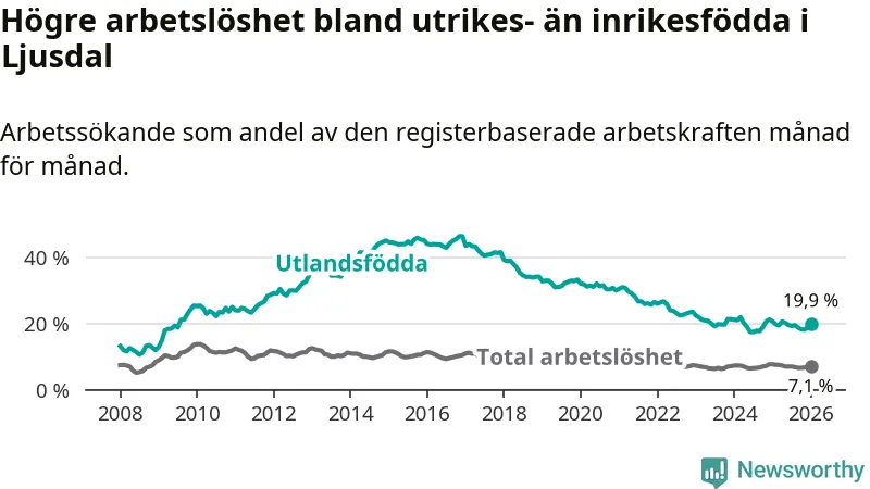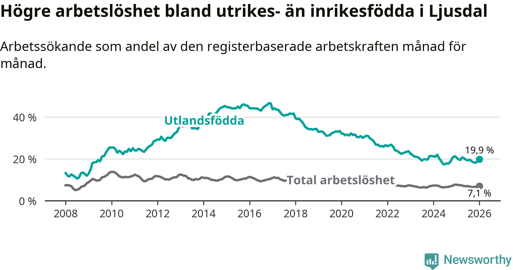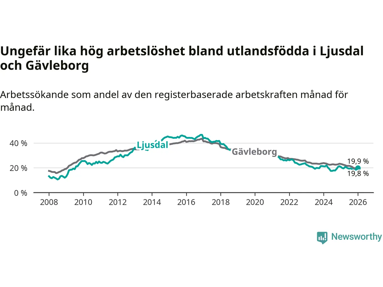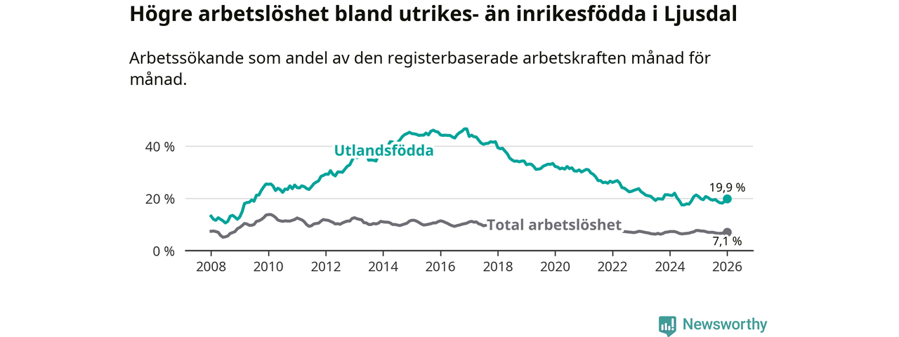 Arbetslösheten bland utlandsfödda var 19,9 procent i Ljusdal under januari månad, motsvarande 218 av 1 095 personer. Det är 0,8 procentenheter färre än vid samma tidpunkt i fjol (−9 om man räknar personer).