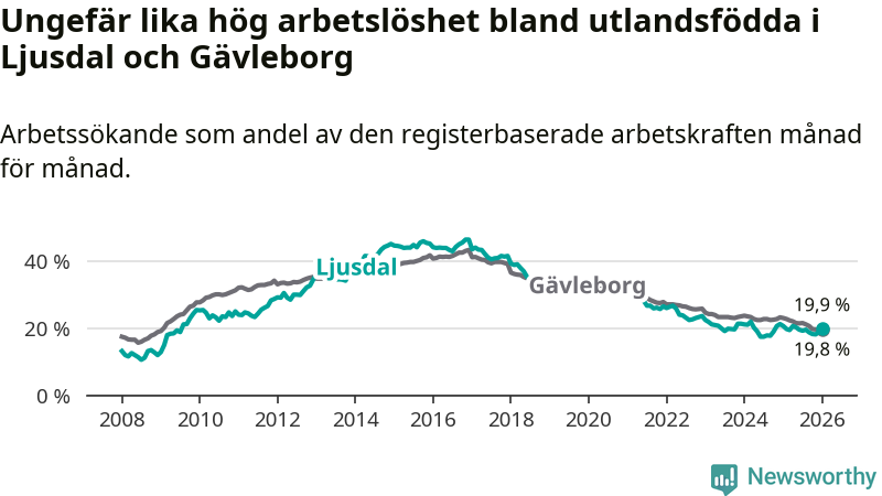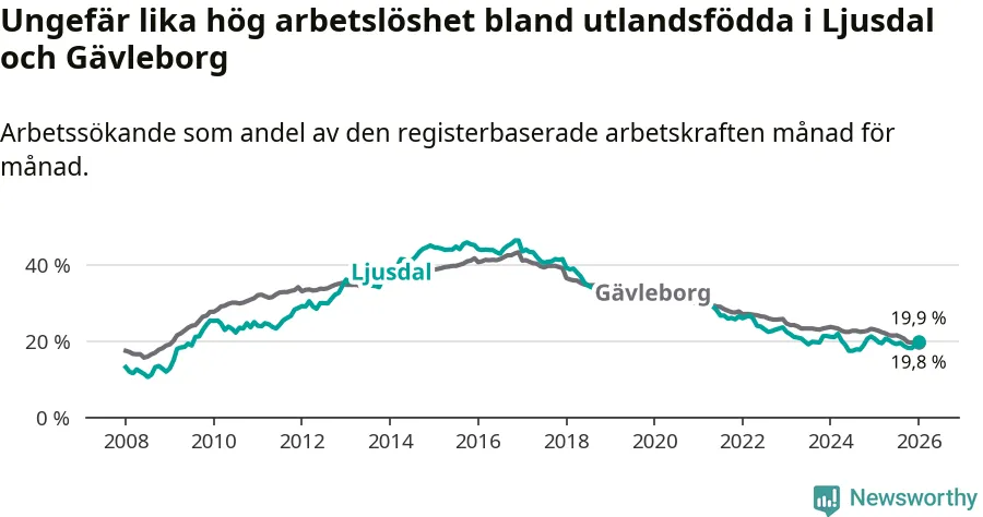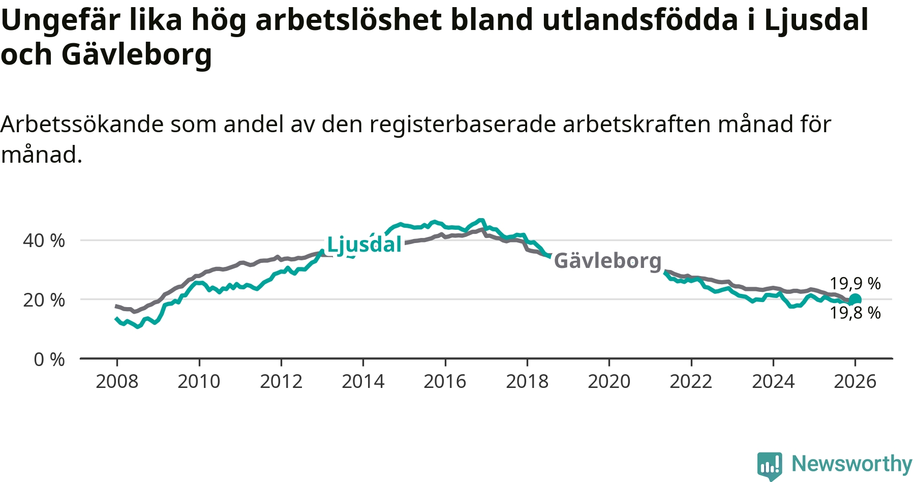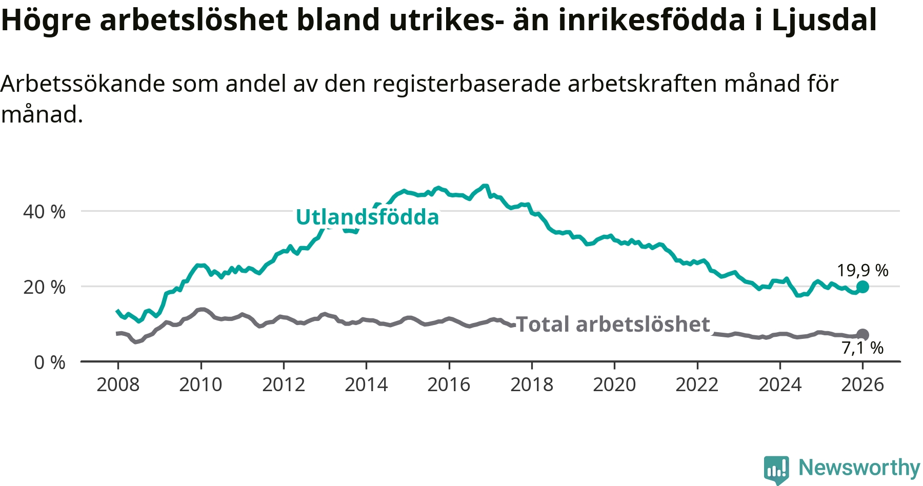 Arbetslösheten bland utlandsfödda var 19,9 procent i Ljusdal under januari månad, motsvarande 218 av 1 095 personer. Det är 0,8 procentenheter färre än vid samma tidpunkt i fjol (−9 om man räknar personer).