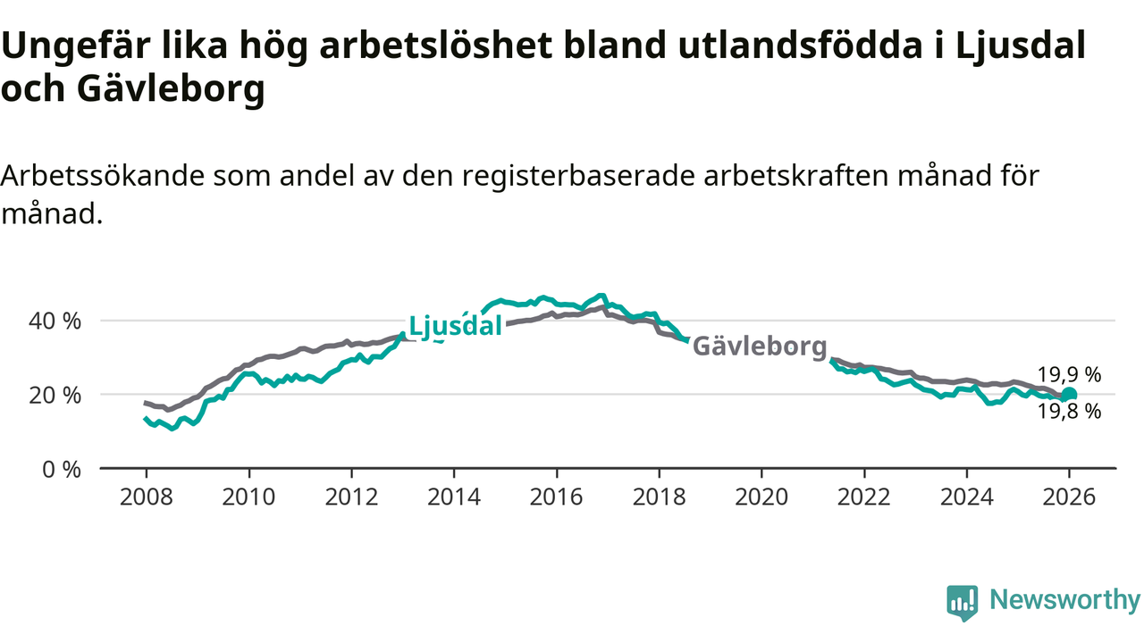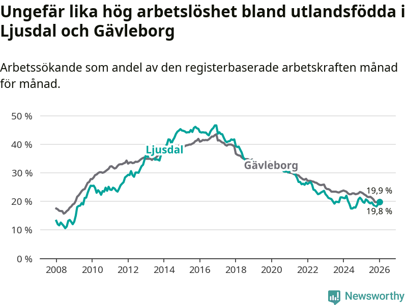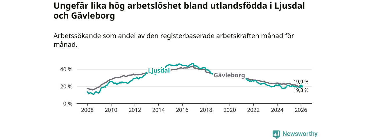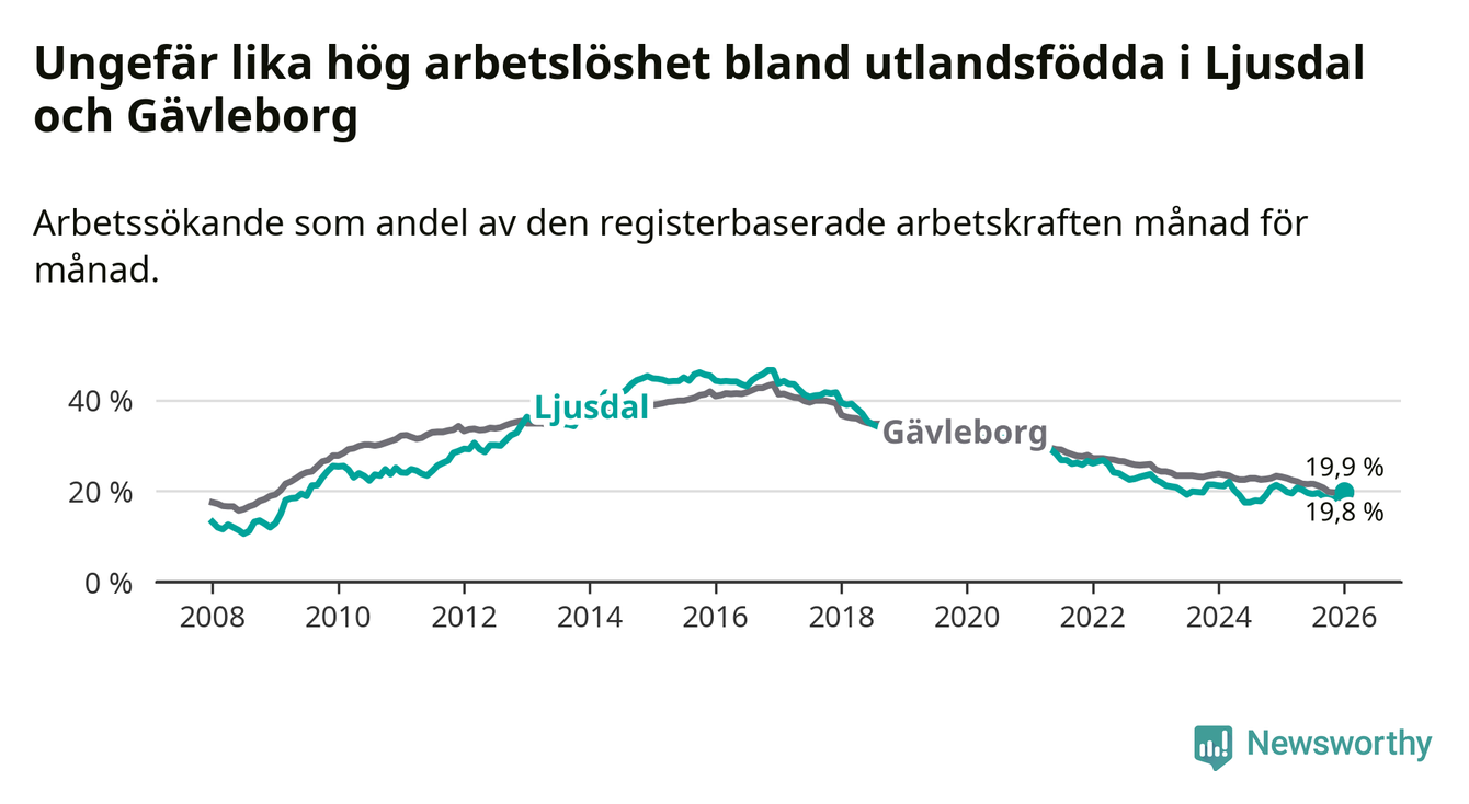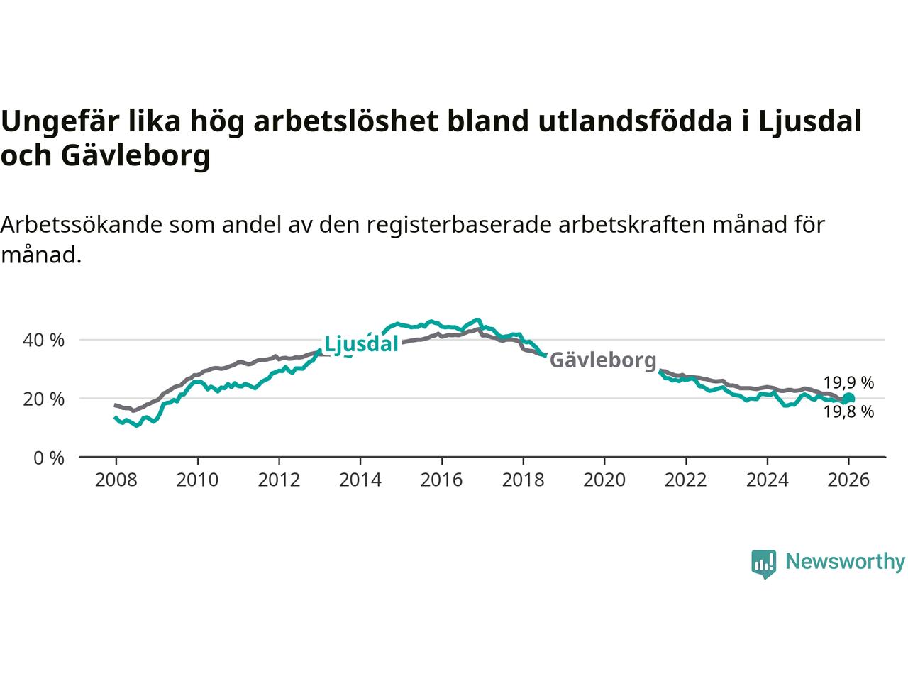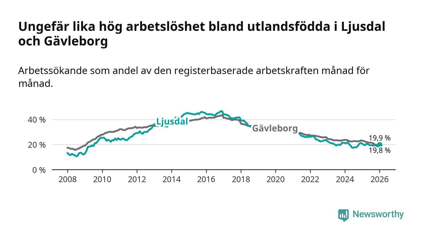 Graf: Arbetslöshet bland utrikesfödda i Ljusdals kommun och Gävleborgs län