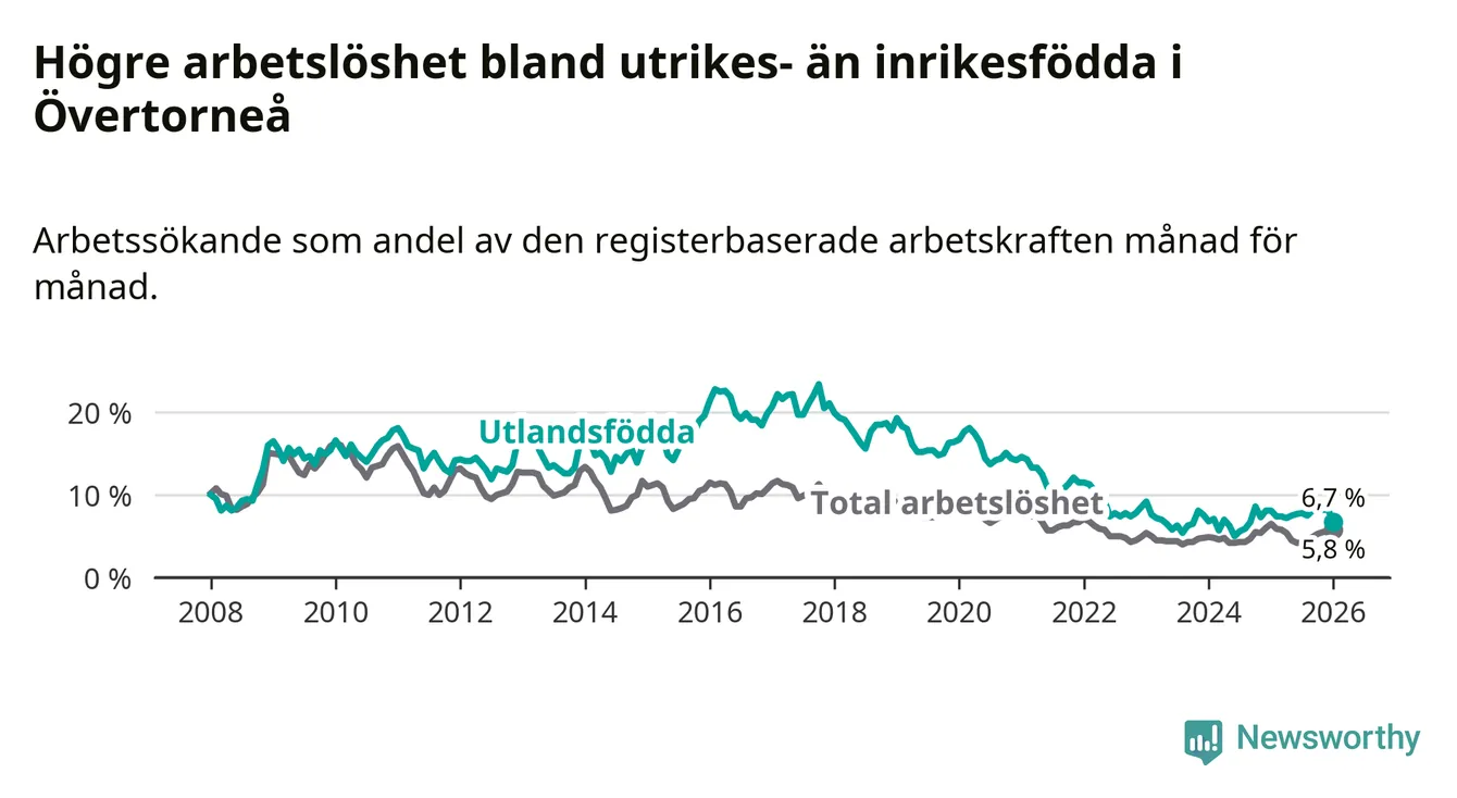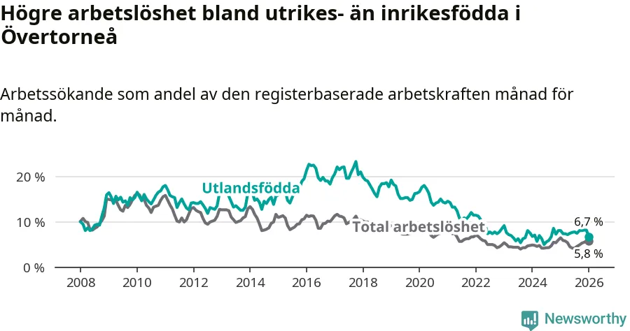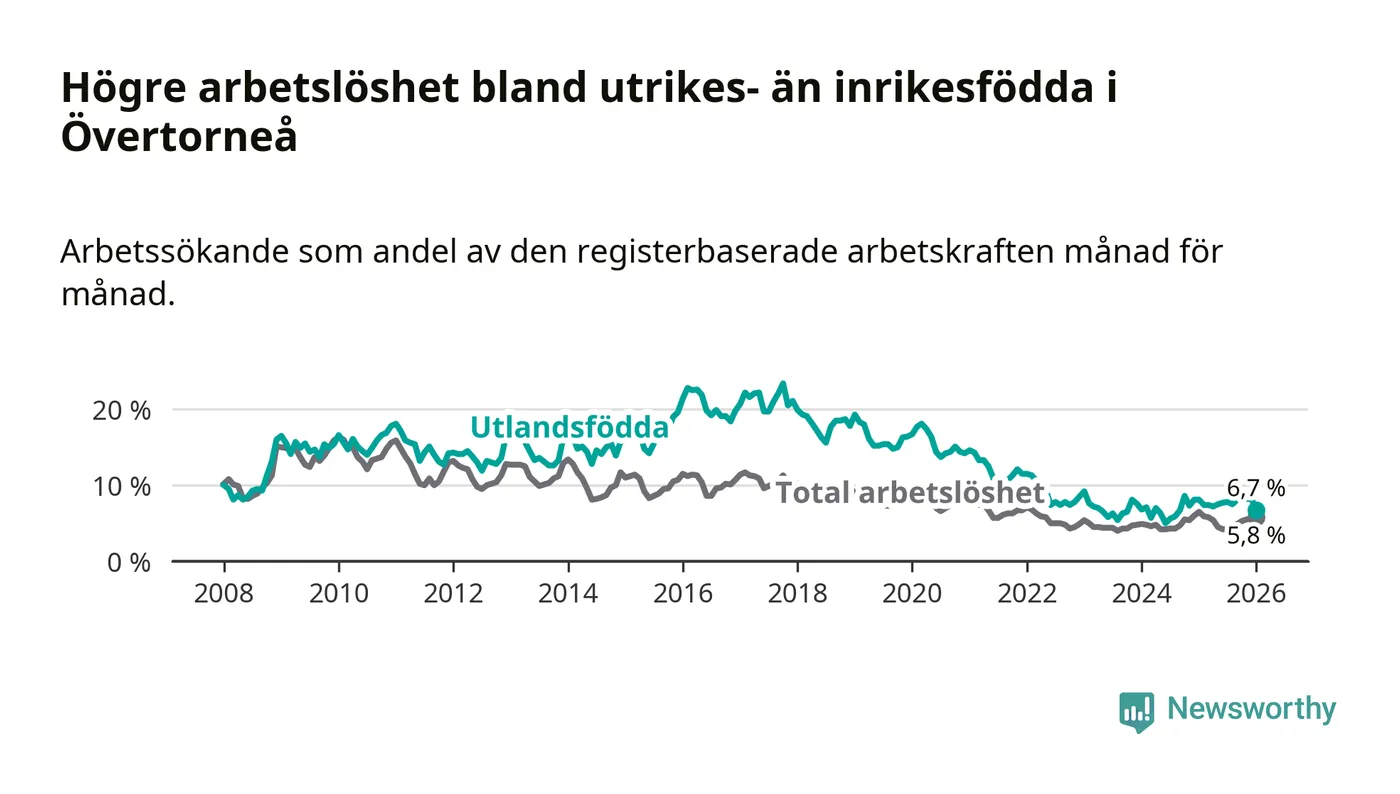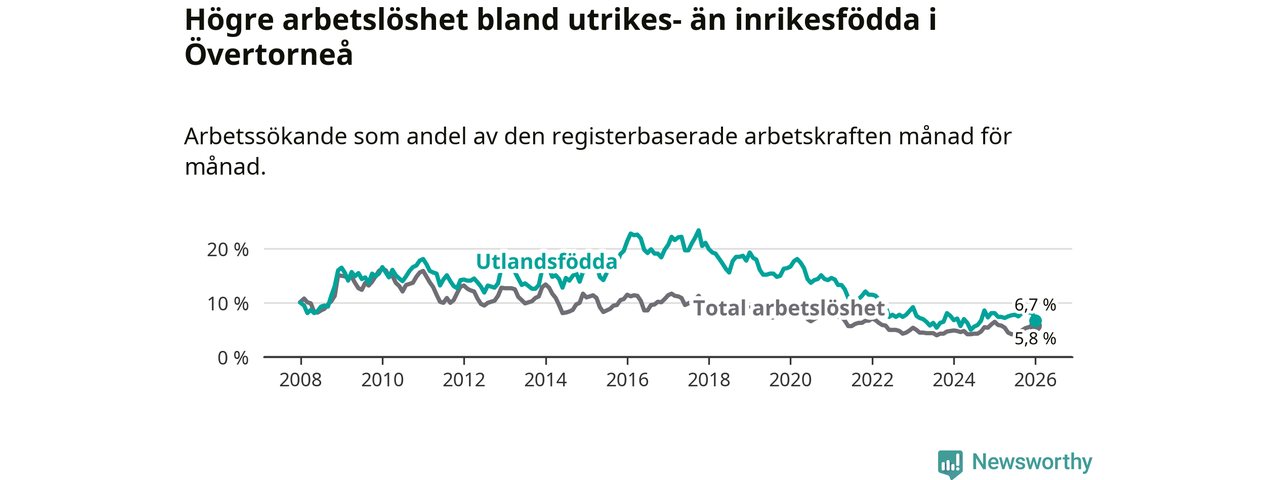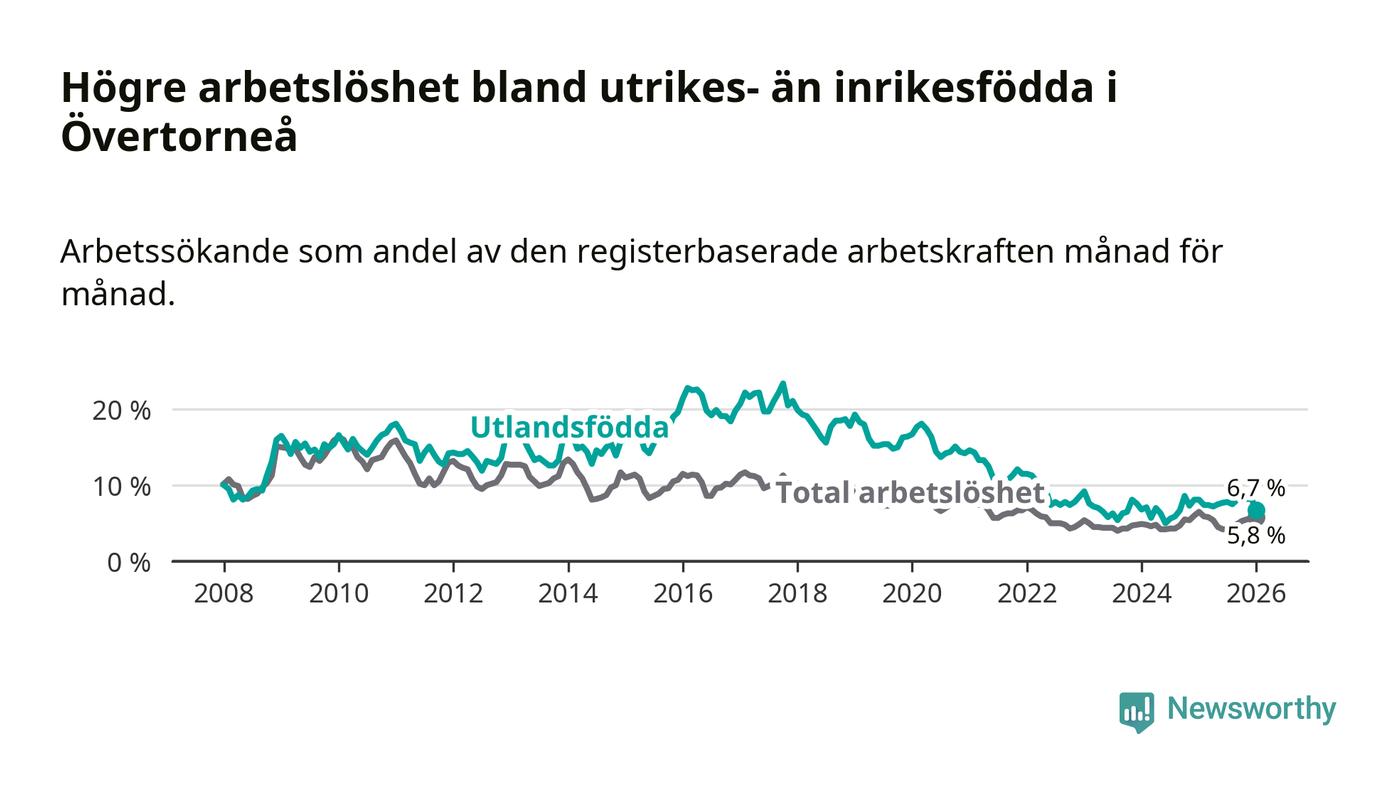 Arbetslösheten bland utlandsfödda var 6,7 procent i Övertorneå under januari månad, motsvarande 25 av 373 personer. Det är 1,4 procentenheter färre än vid samma tidpunkt i fjol (−6 om man räknar personer). Den senaste månadens nedgång innebär ett trendbrott. Under de två föregående månaderna hade arbetslösheten bland utlandsfödda varit högre än motsvarande tidpunkt året innan.