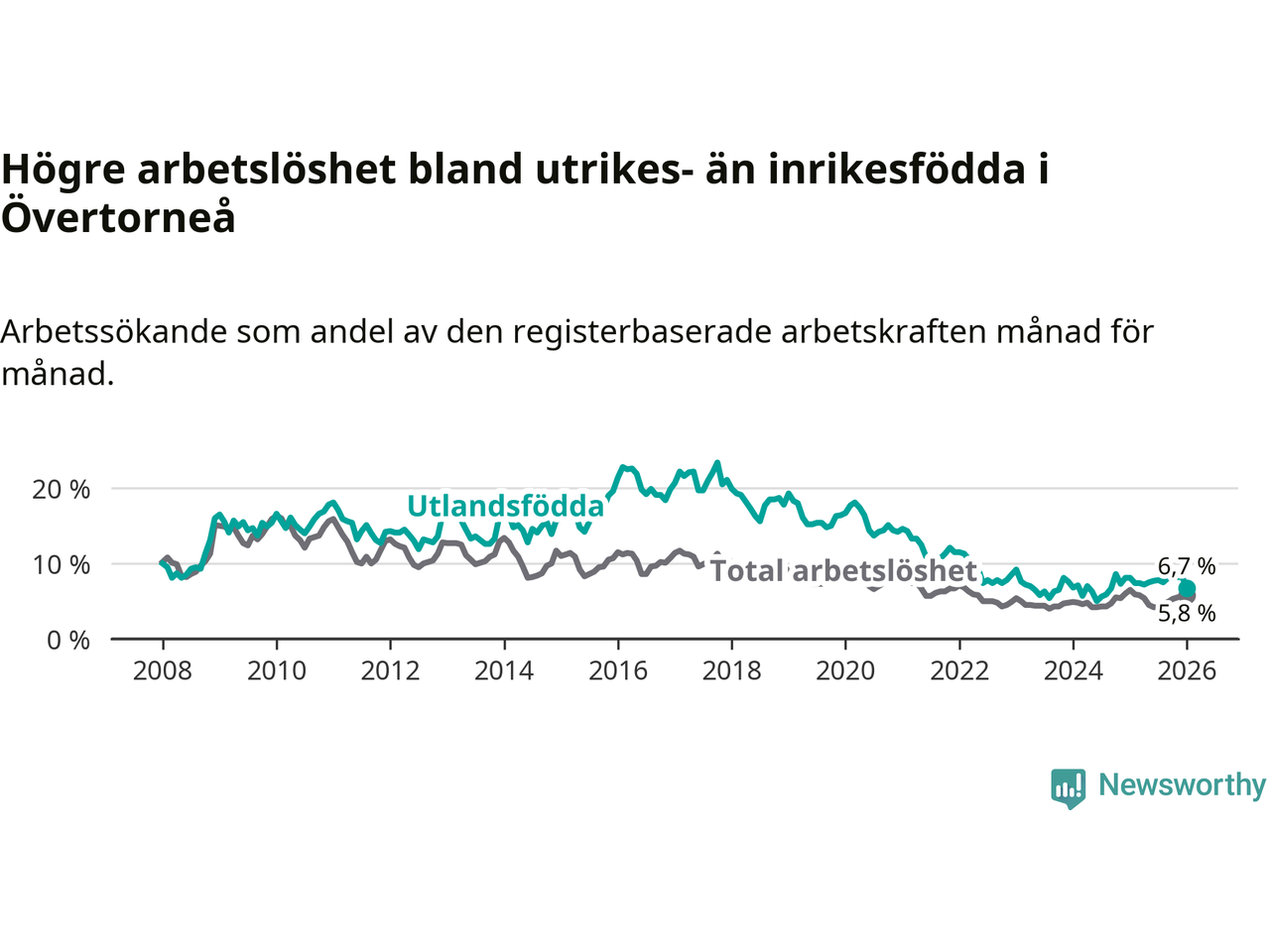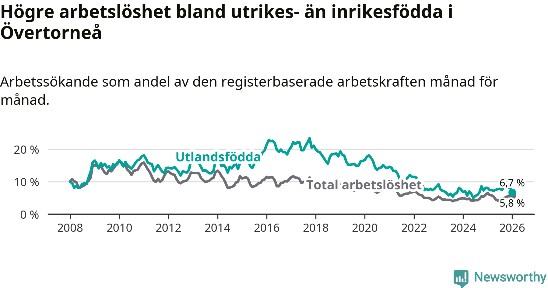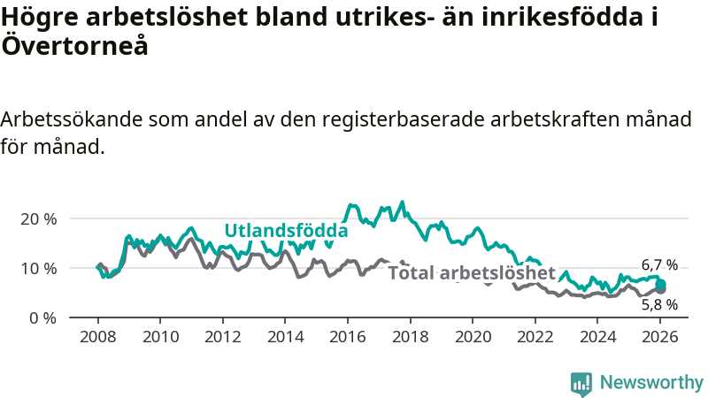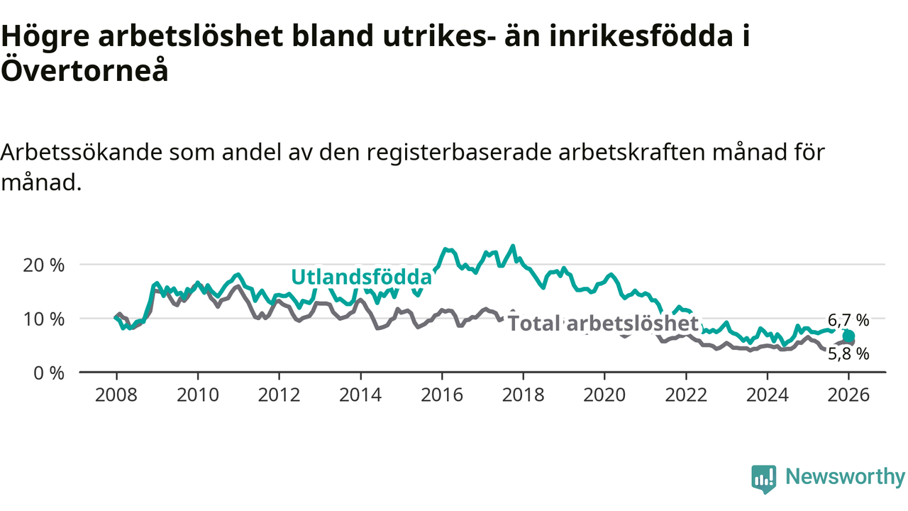 Arbetslösheten bland utlandsfödda var 6,7 procent i Övertorneå under januari månad, motsvarande 25 av 373 personer. Det är 1,4 procentenheter färre än vid samma tidpunkt i fjol (−6 om man räknar personer). Den senaste månadens nedgång innebär ett trendbrott. Under de två föregående månaderna hade arbetslösheten bland utlandsfödda varit högre än motsvarande tidpunkt året innan.