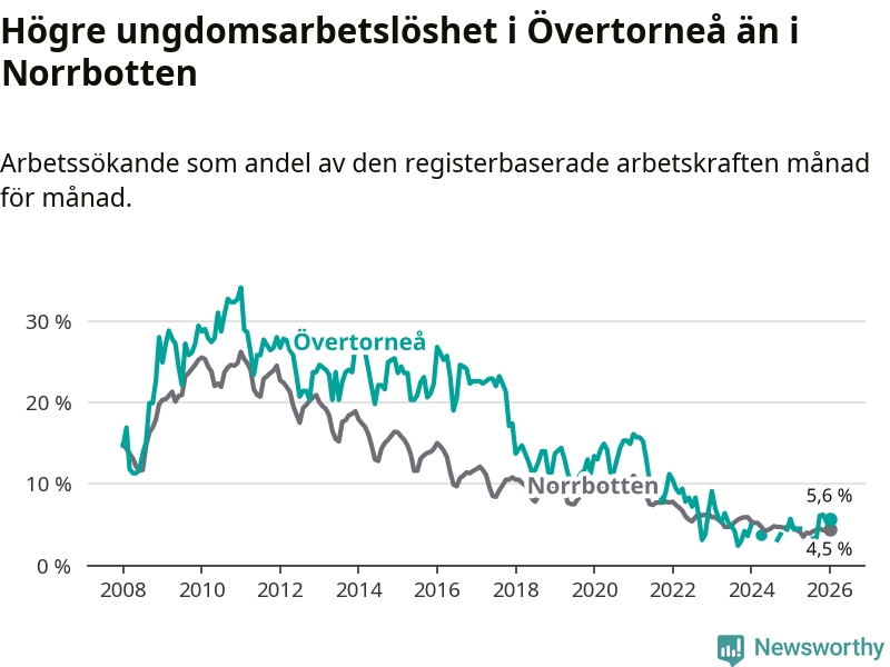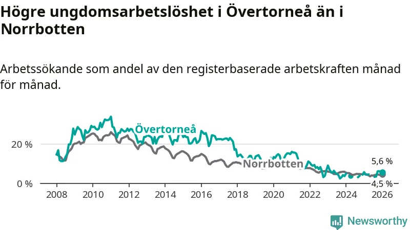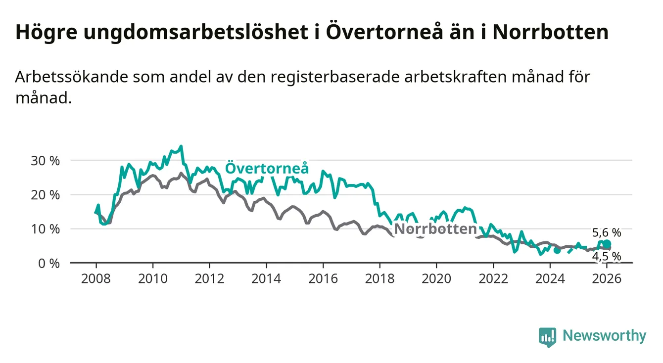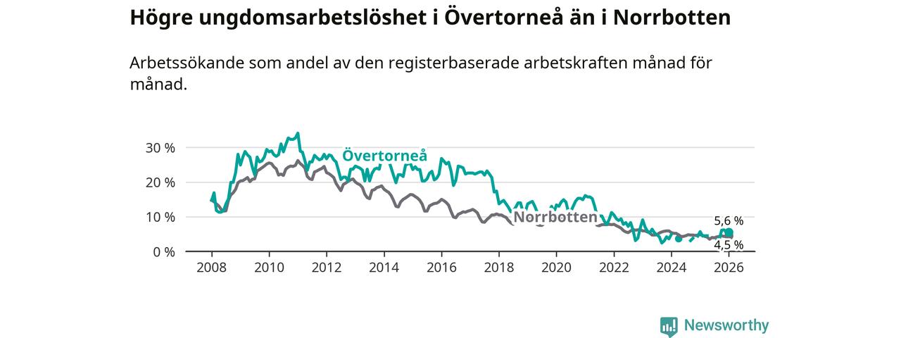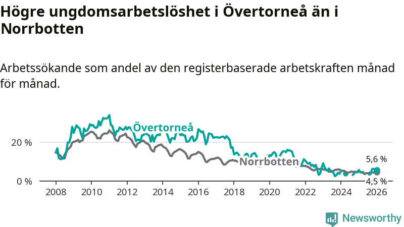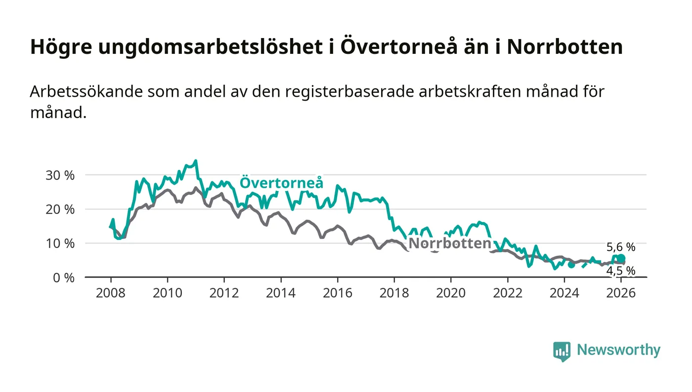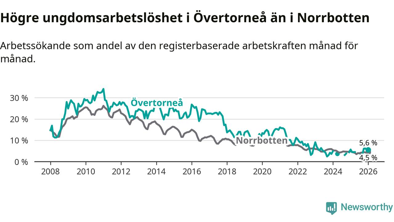 Precis som den totala arbetslösheten ligger ungdomsarbetslösheten i Övertorneå högre än i Norrbotten som helhet. Skillnaden mellan kommunen och länet är 1,1 procentenheter.