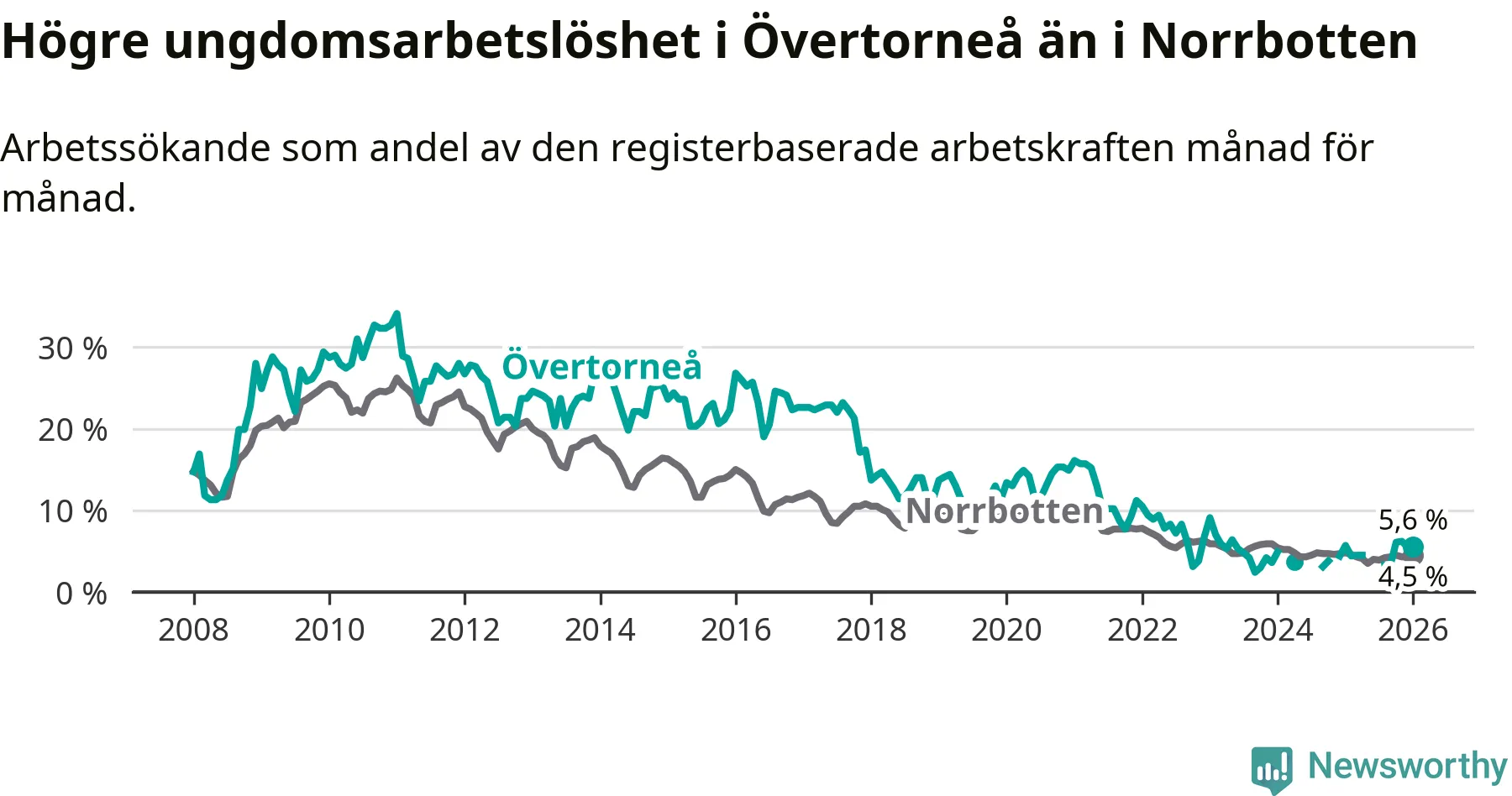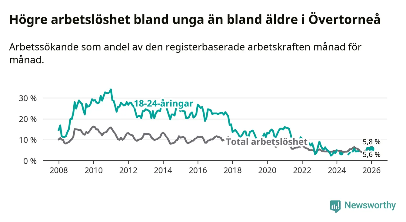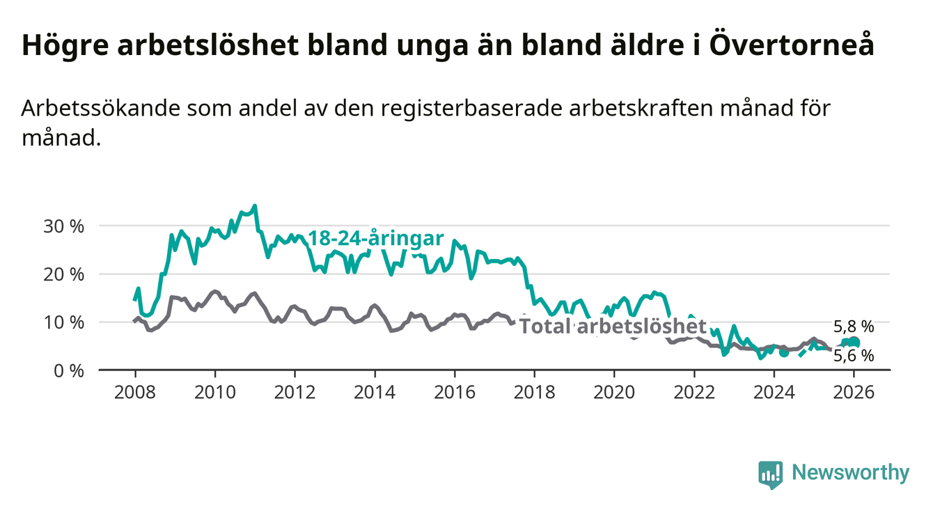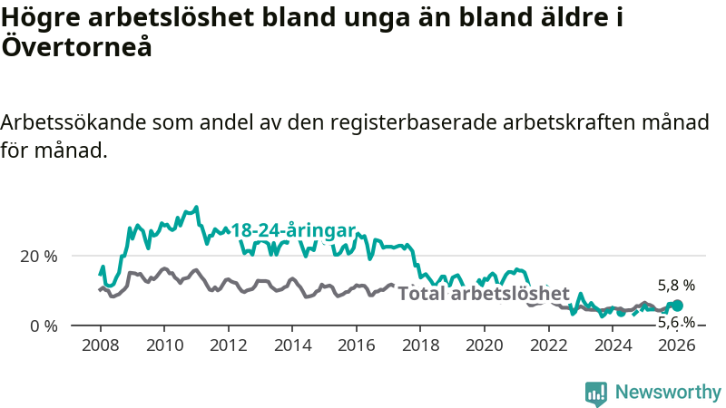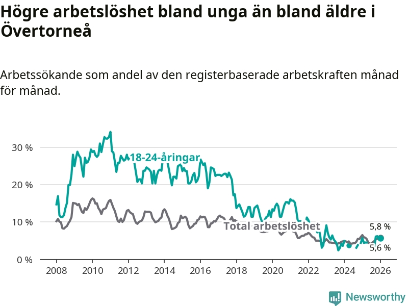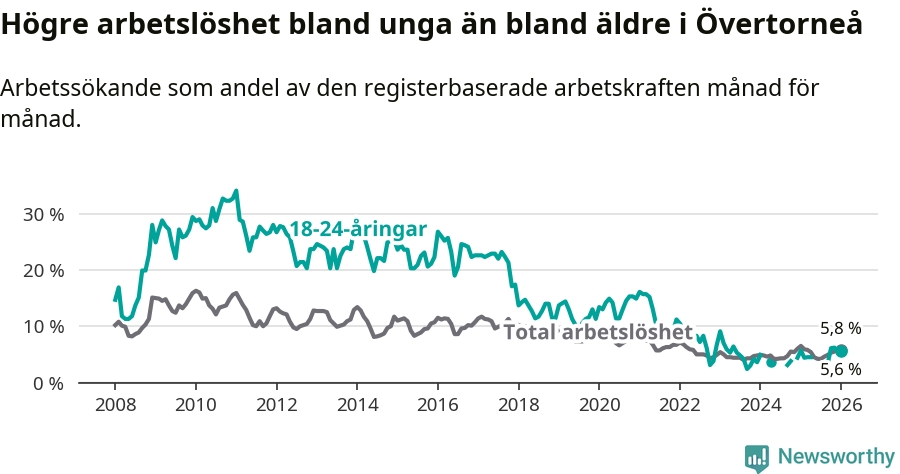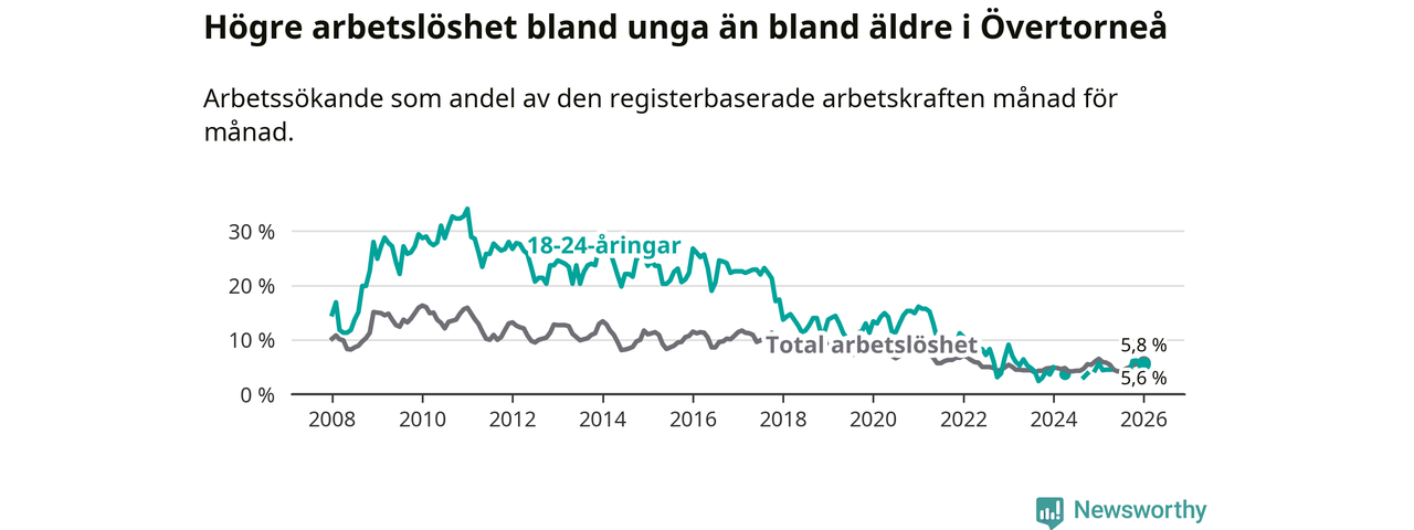 Precis som den totala arbetslösheten ligger ungdomsarbetslösheten i Övertorneå högre än i Norrbotten som helhet. Skillnaden mellan kommunen och länet är 1,1 procentenheter.