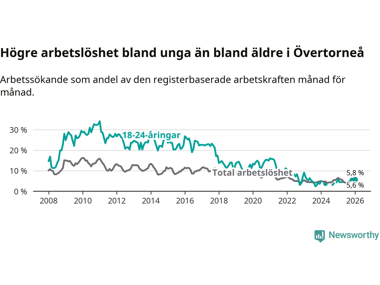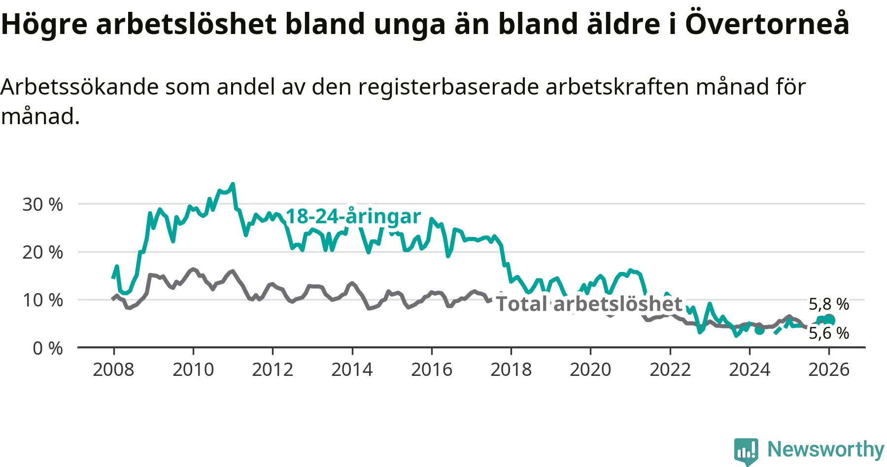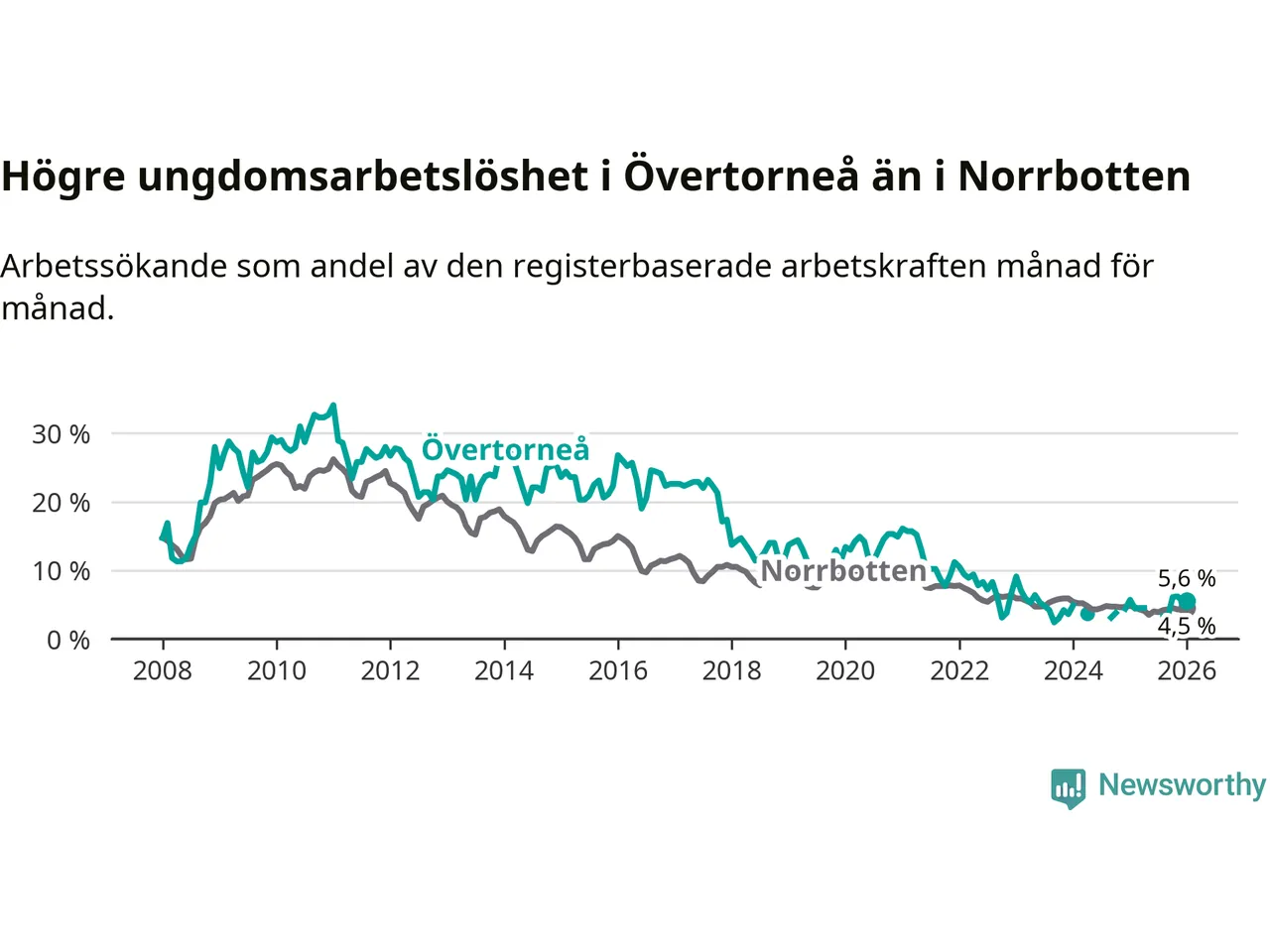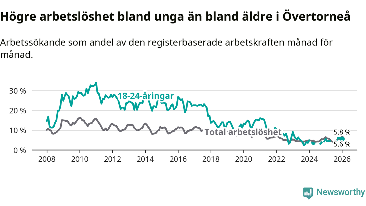 Precis som den totala arbetslösheten ligger ungdomsarbetslösheten i Övertorneå högre än i Norrbotten som helhet. Skillnaden mellan kommunen och länet är 1,1 procentenheter.