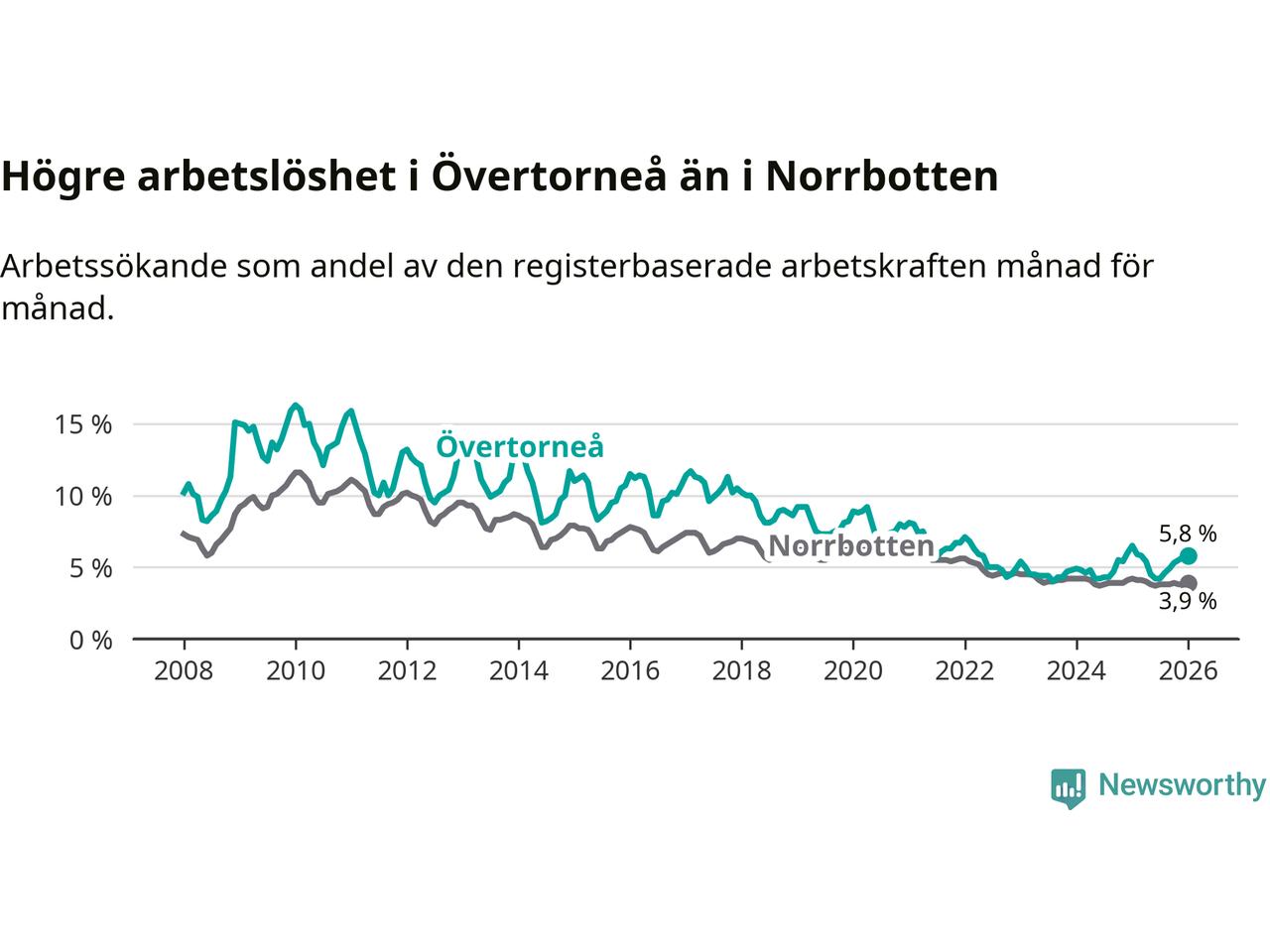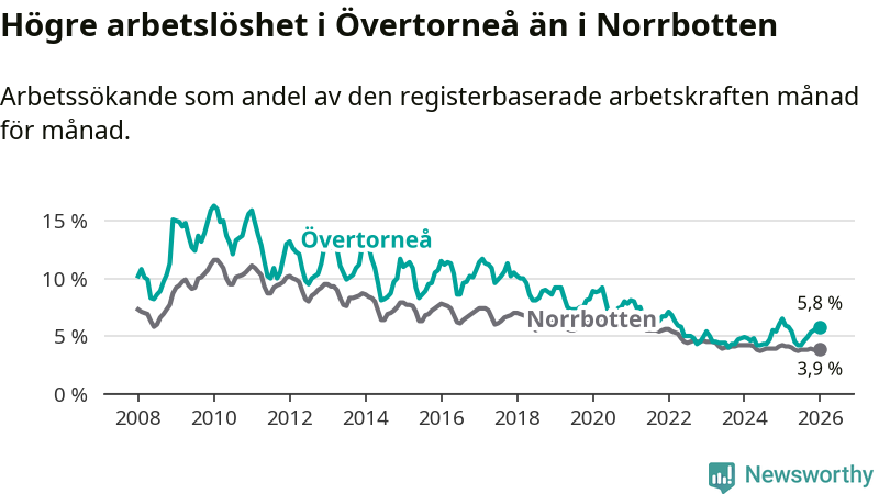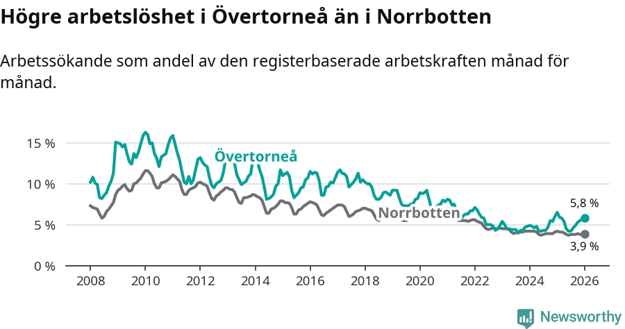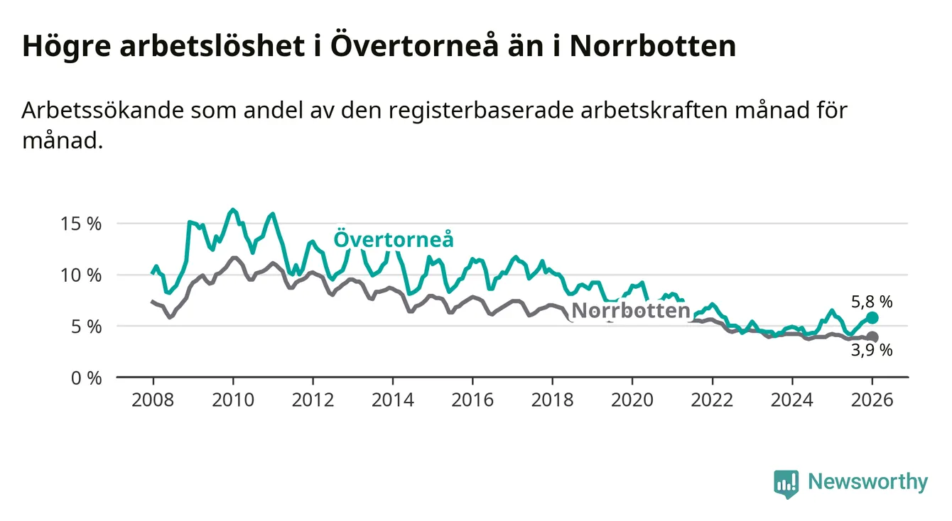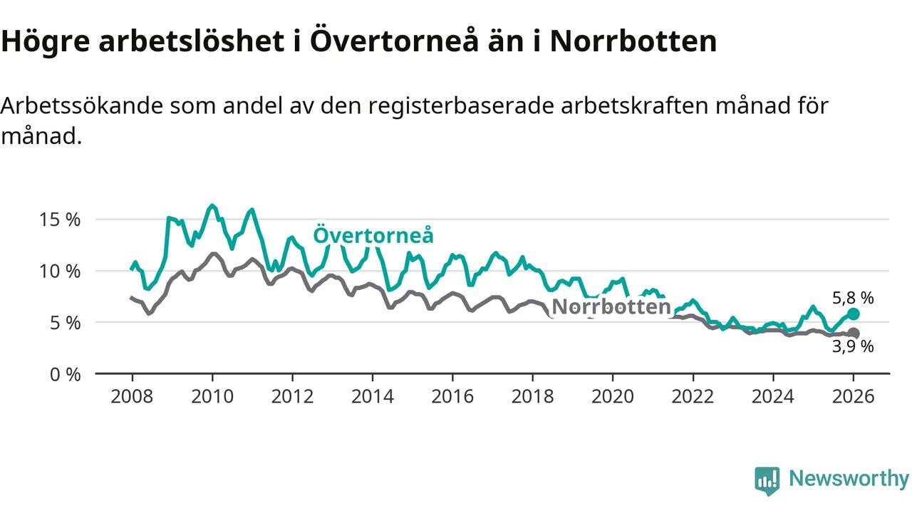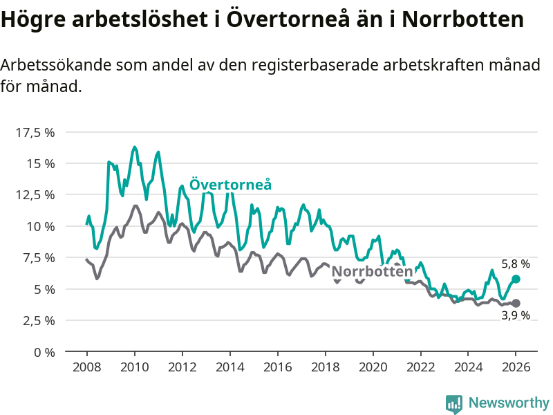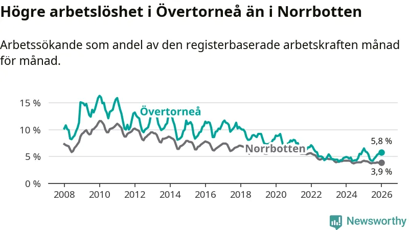 Under januari månad rapporterade Övertorneå kommun en total arbetslöshet på 5,8 procent. Det är en minskning jämfört med samma tidpunkt i fjol (−0,7 procentenheter). Även i Norrbottens län sjunker arbetslösheten .